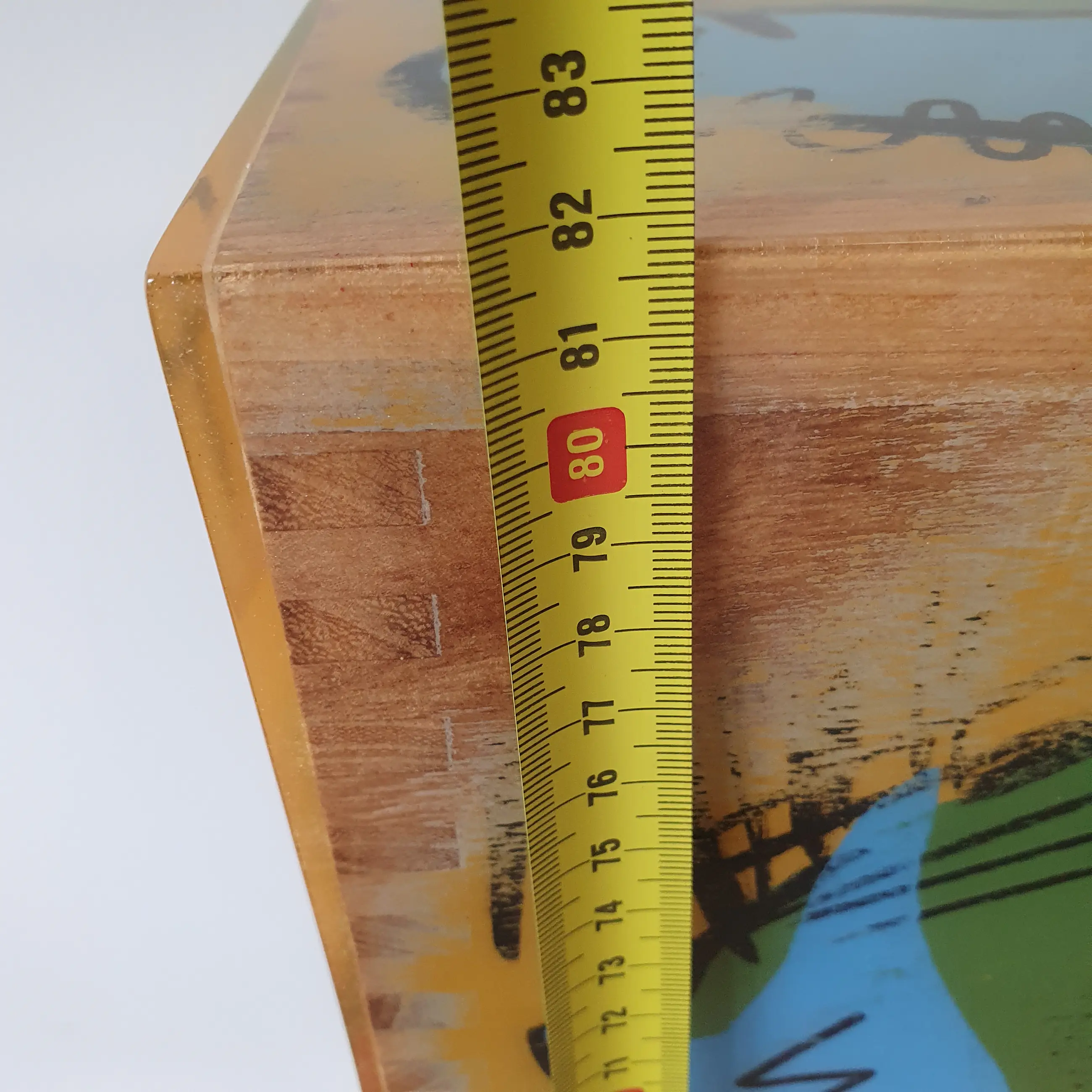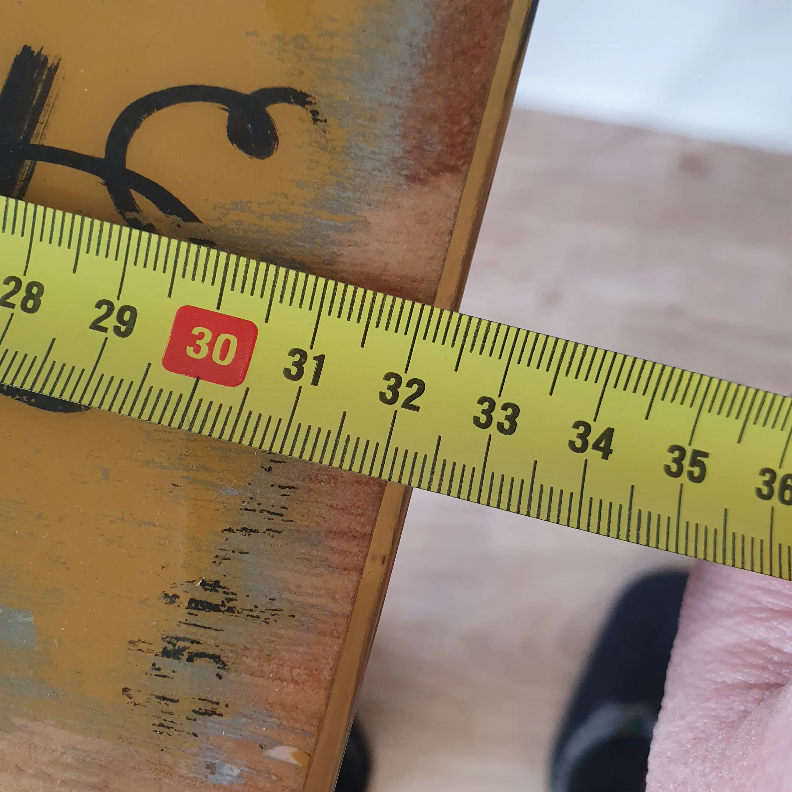 Beschildering is in een vintage urban stijl gemaakt ( verf bewust weg geschuurd, daaroverheen zit een 0,5 cm epoxy laag, dus kale plekken zijn geen slijtage sporen, maar vintage/industrie look).