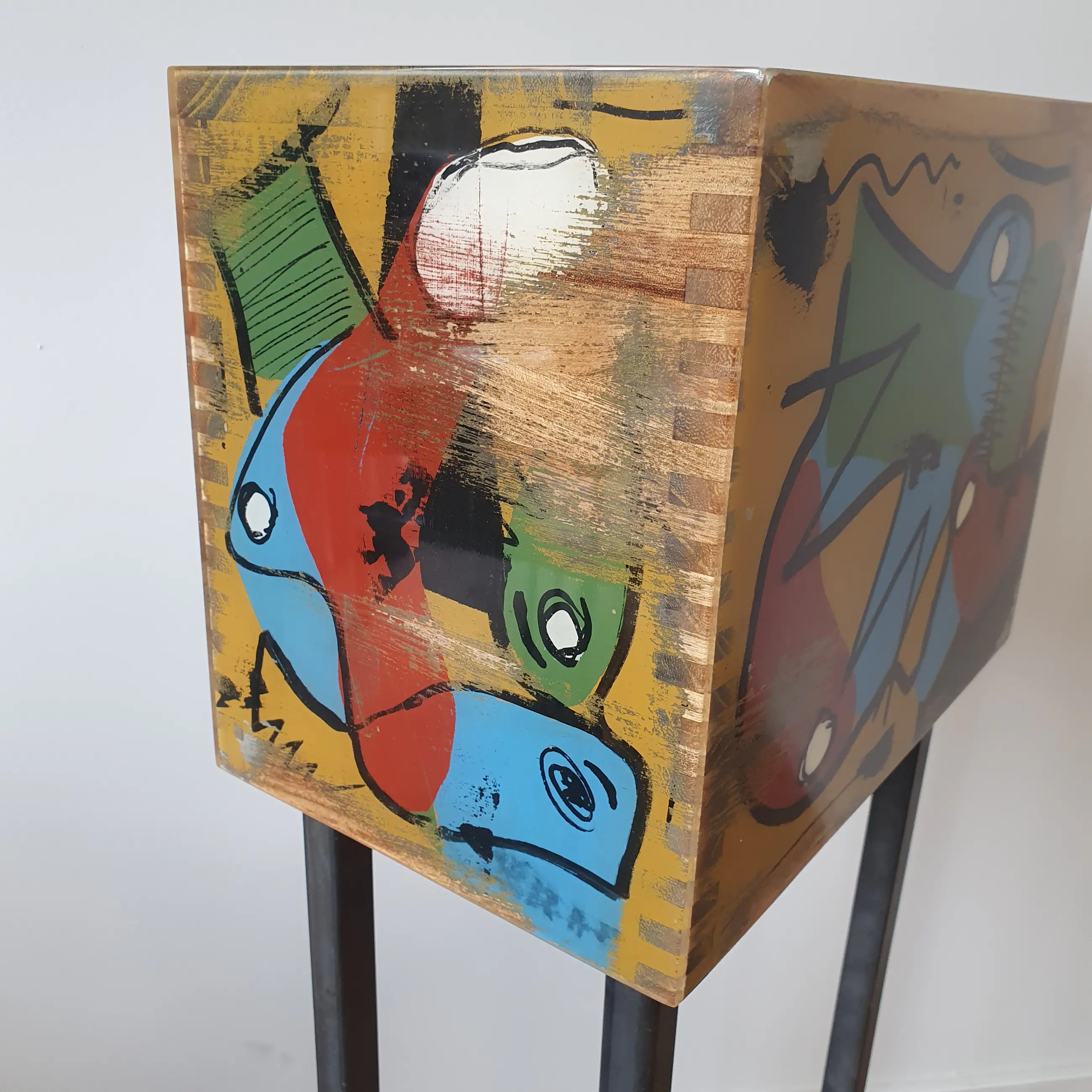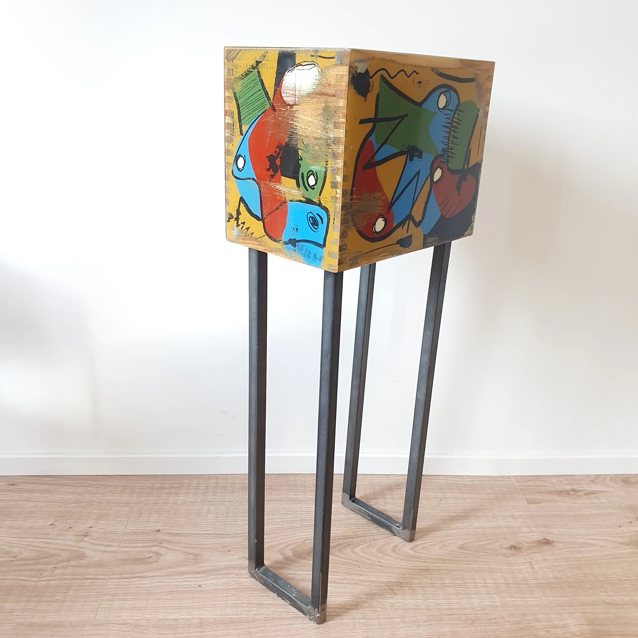 Een houten blok dat met de hand is beschilderd en voorzien is van enkele lagen vernis. Stalen frame/poten die ook afgelakt zijn met transparante lak voor een industriële look.