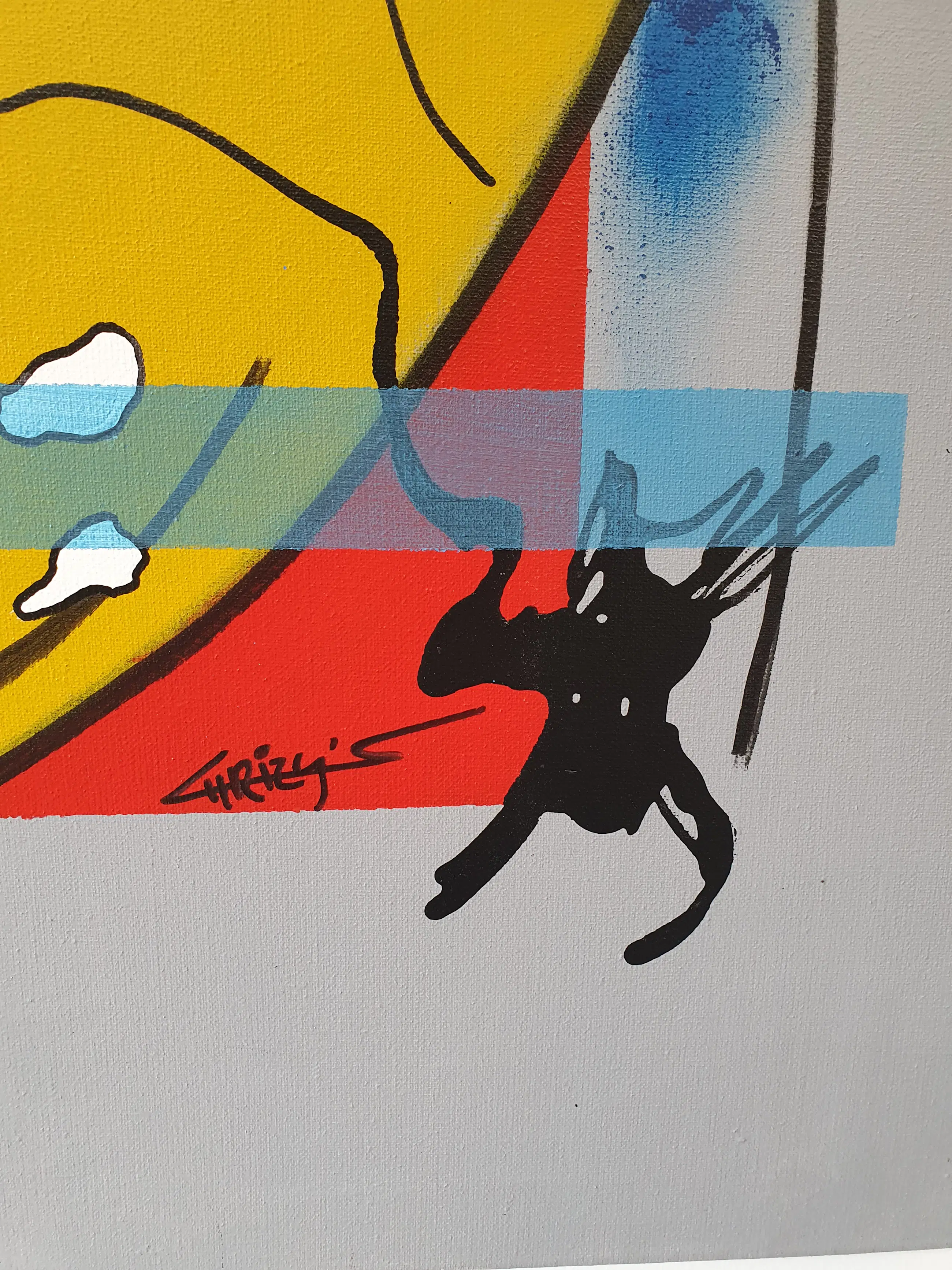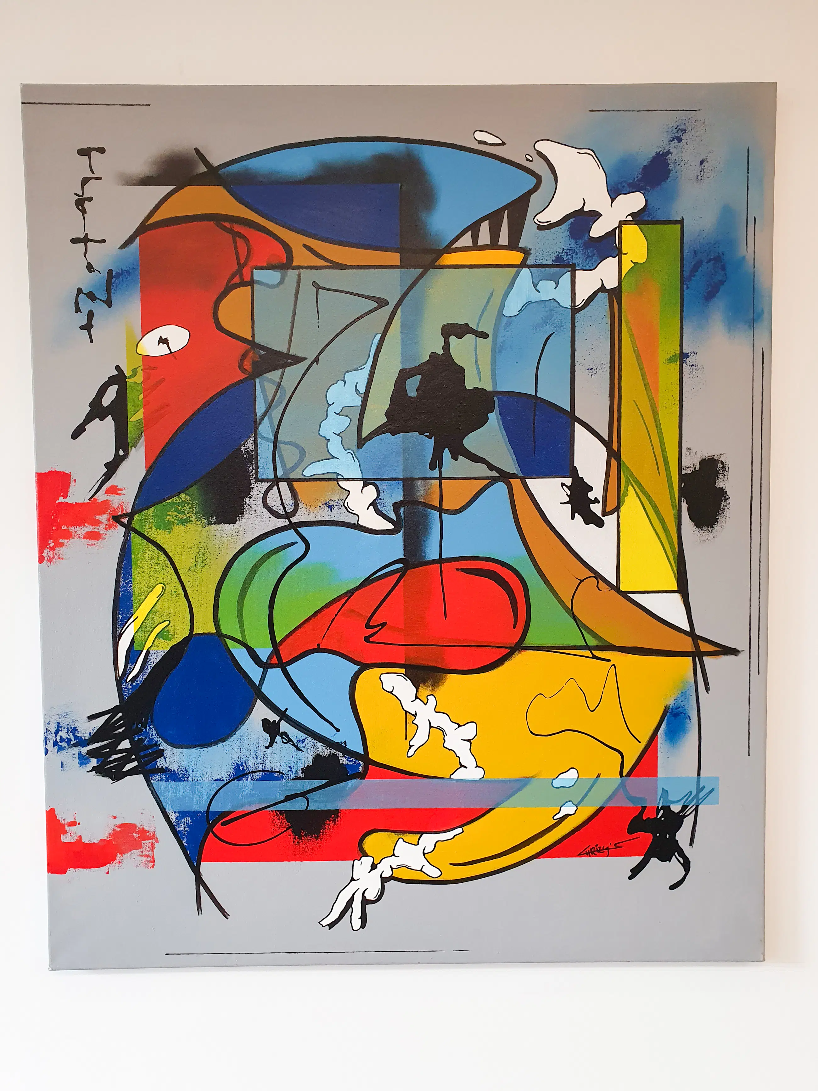 Wat onmiddellijk opvalt is de levendige compositie van kleurvlakken en beweeglijke zwarte lijnen die het canvas doorkruisen. Heldere tinten zoals kobaltblauw, vuurrood, zongeel en grasgroen botsen en vloeien tegelijkertijd samen. Ze creëren een gevoel van spanning én harmonie – alsof elk element zijn eigen stem heeft, maar samen een orkest vormen.