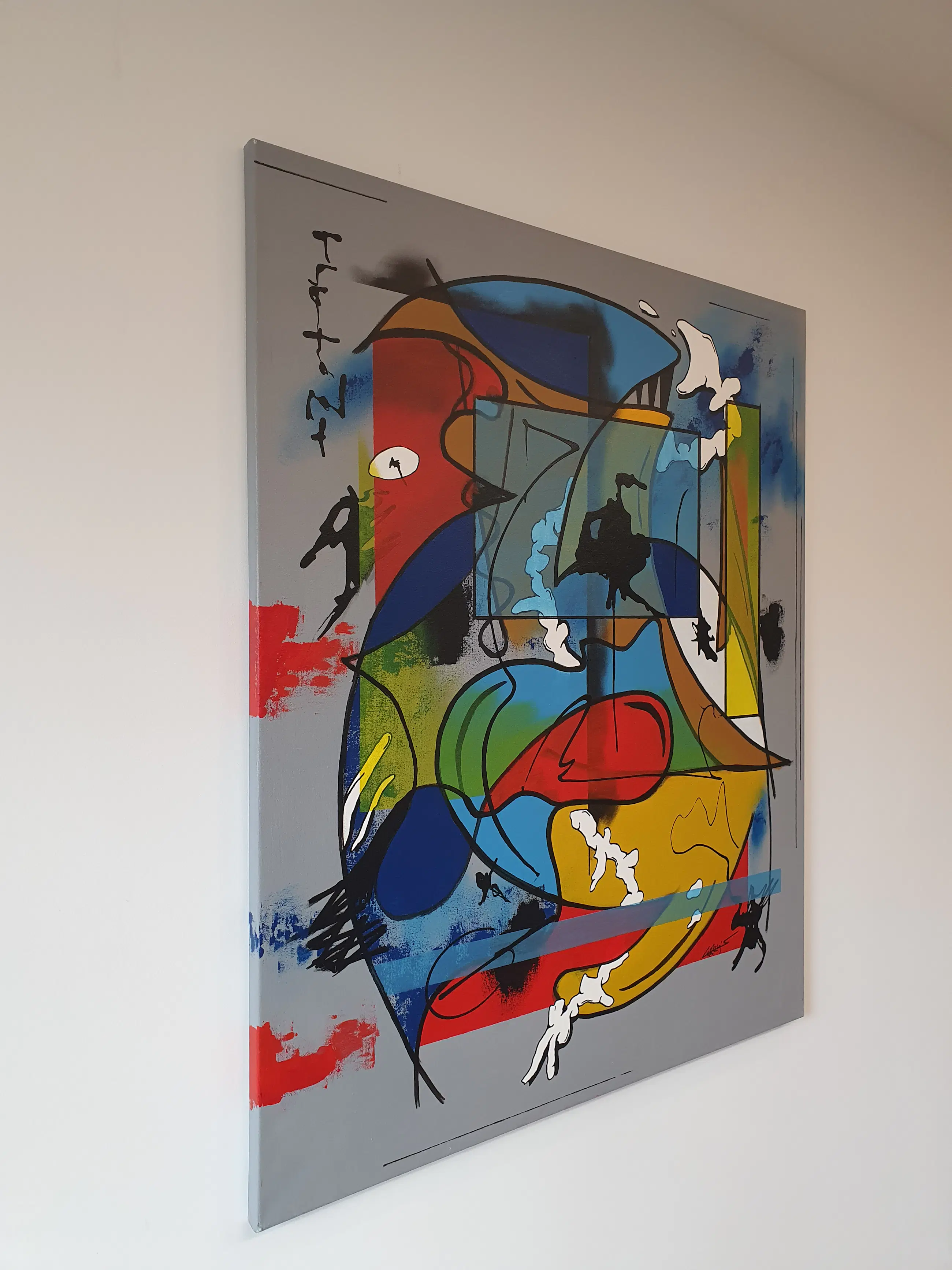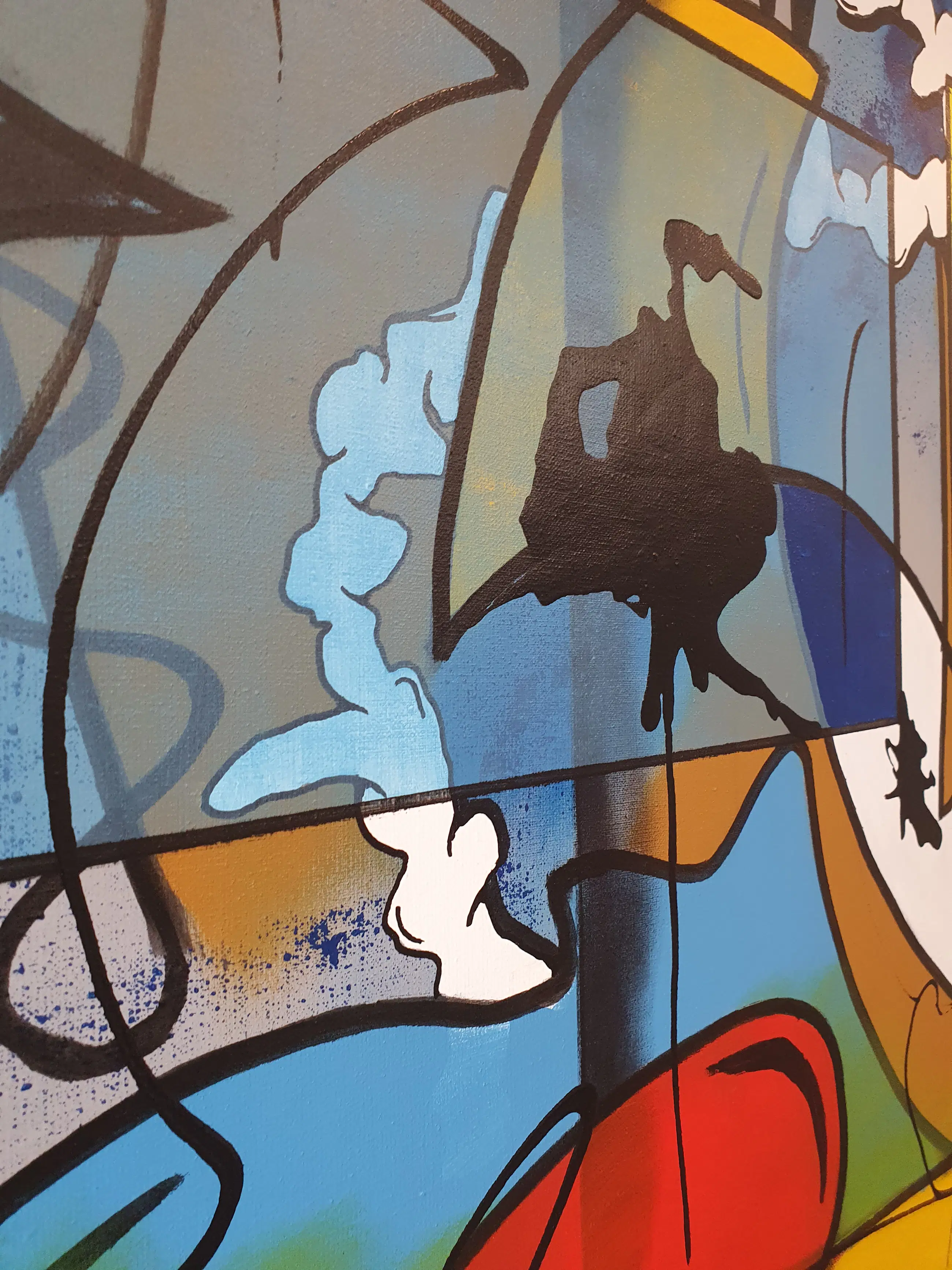 Het gebruik van graffiti-achtige penseelstreken, spontane verfspatten en vloeiende lijnen versterkt de energie en het gevoel van beweging in het werk. Tegelijkertijd zorgen de geometrische vlakken en de strak omlijnde kaders voor structuur en rust. Dit spanningsveld tussen orde en chaos is typisch voor Van Hedels werk, waarin hij continu speelt met contrasten – hard versus zacht, open versus gesloten, vrijheid versus begrenzing.