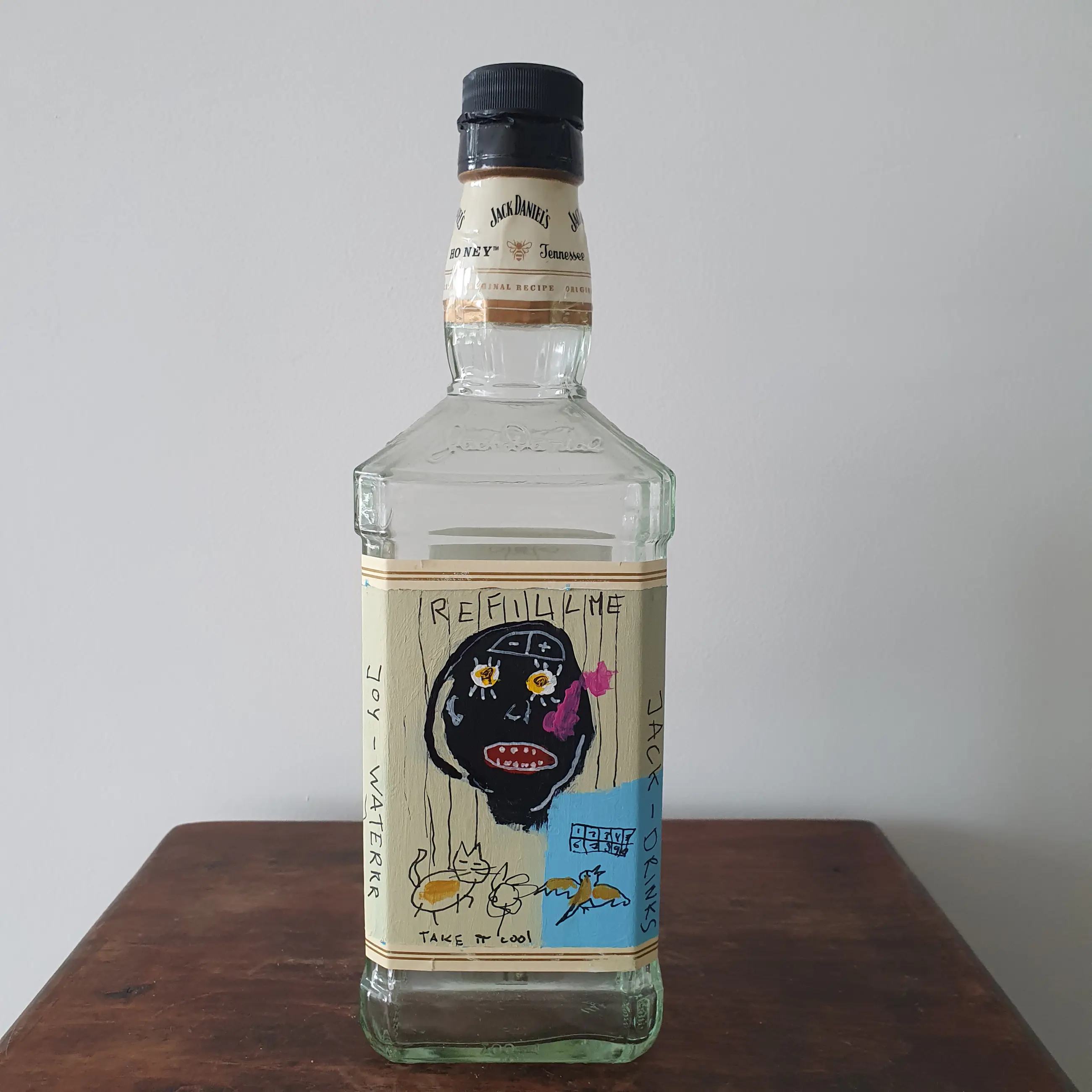 Uniek kunstobject: beschilderde Jack Daniel's Honey fles – “Refillme” door Christian van Hedel