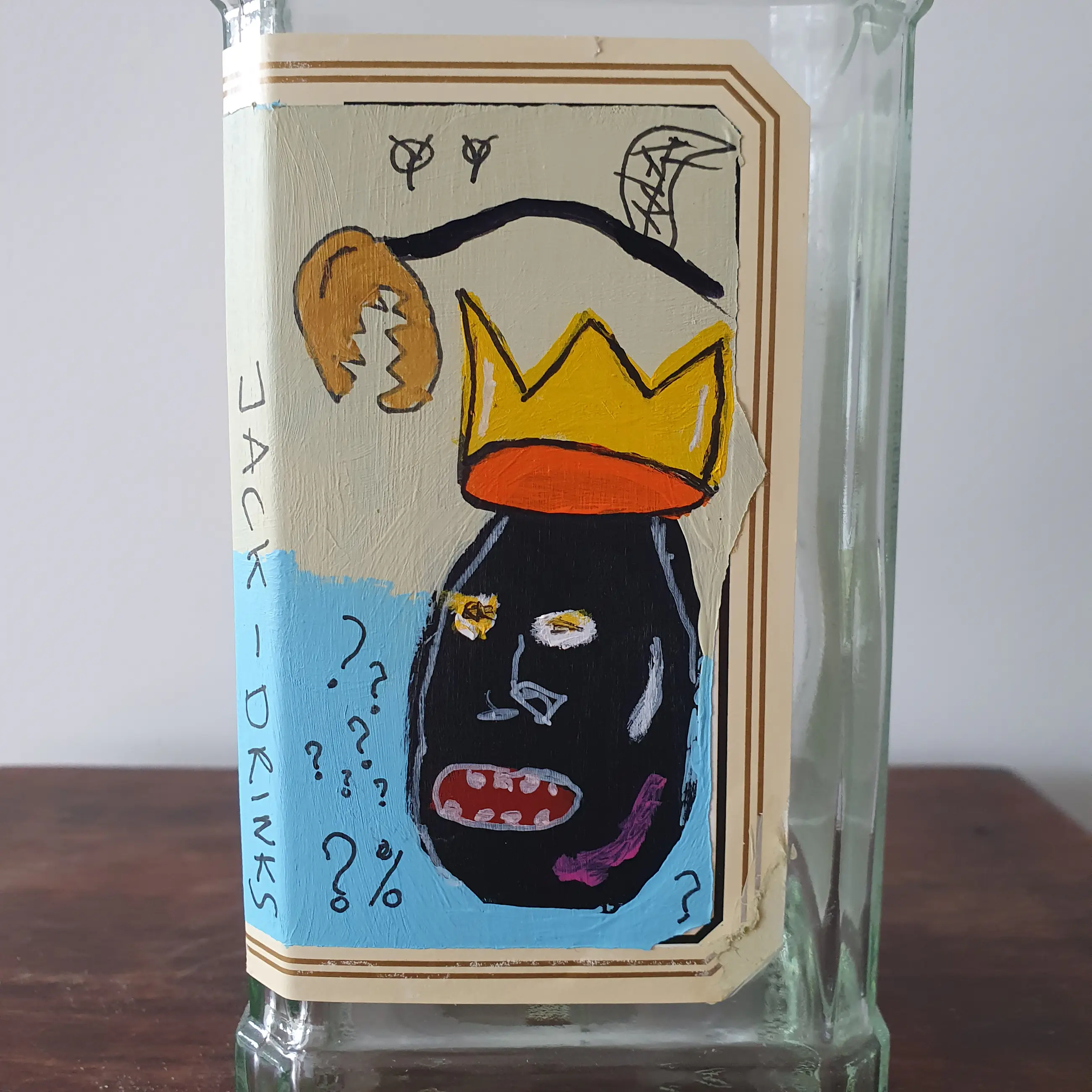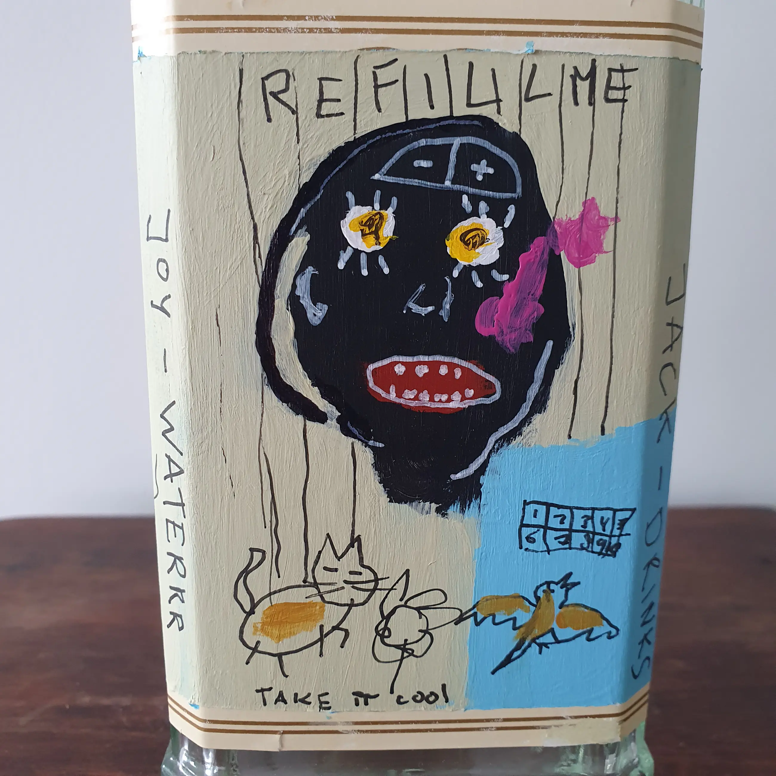 Kunstenaar Christian van Hedel heeft deze lege Jack Daniel’s Honey fles omgetoverd tot een bijzonder kunstobject met de titel “Refillme”. De fles is niet zomaar leeg – juist dát maakt het tot een krachtig symbool: een canvas voor nieuwe inhoud, nieuwe verhalen, nieuwe interpretaties.