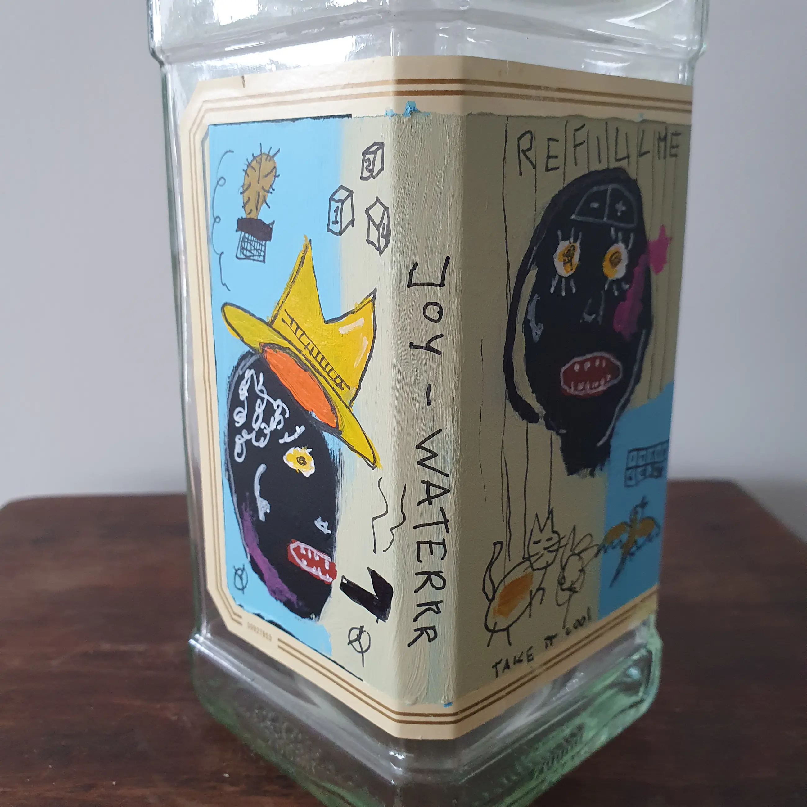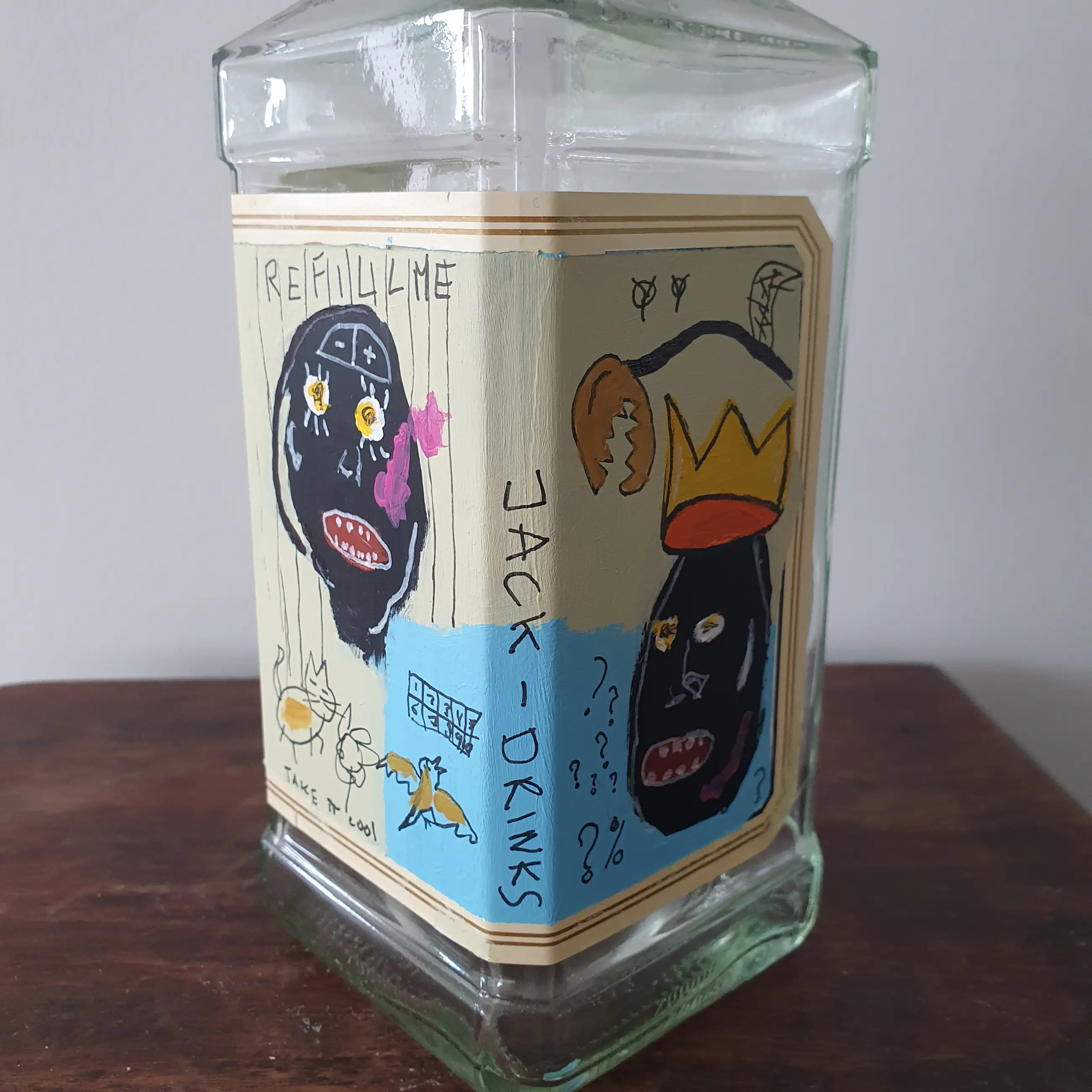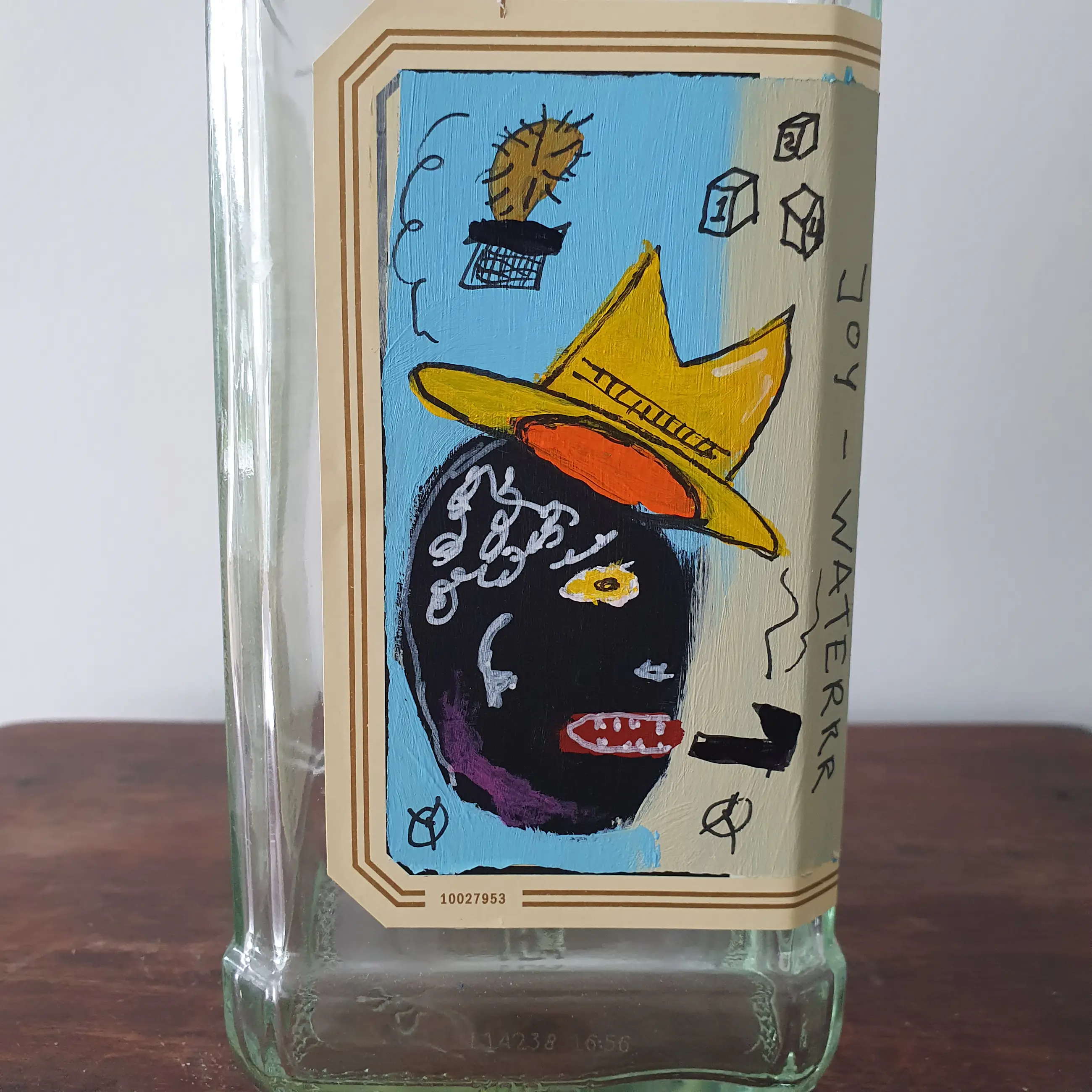 Op drie zijden van de fles zijn expressieve Afrikaanse hoofden geschilderd in een levendige mix van de rauwe stijl van Basquiat en Christians eigen herkenbare handschrift. De combinatie van invloeden maakt dit werk speels, rebels en toch verfijnd. Elk gezicht vertelt zijn eigen verhaal – met een knipoog.