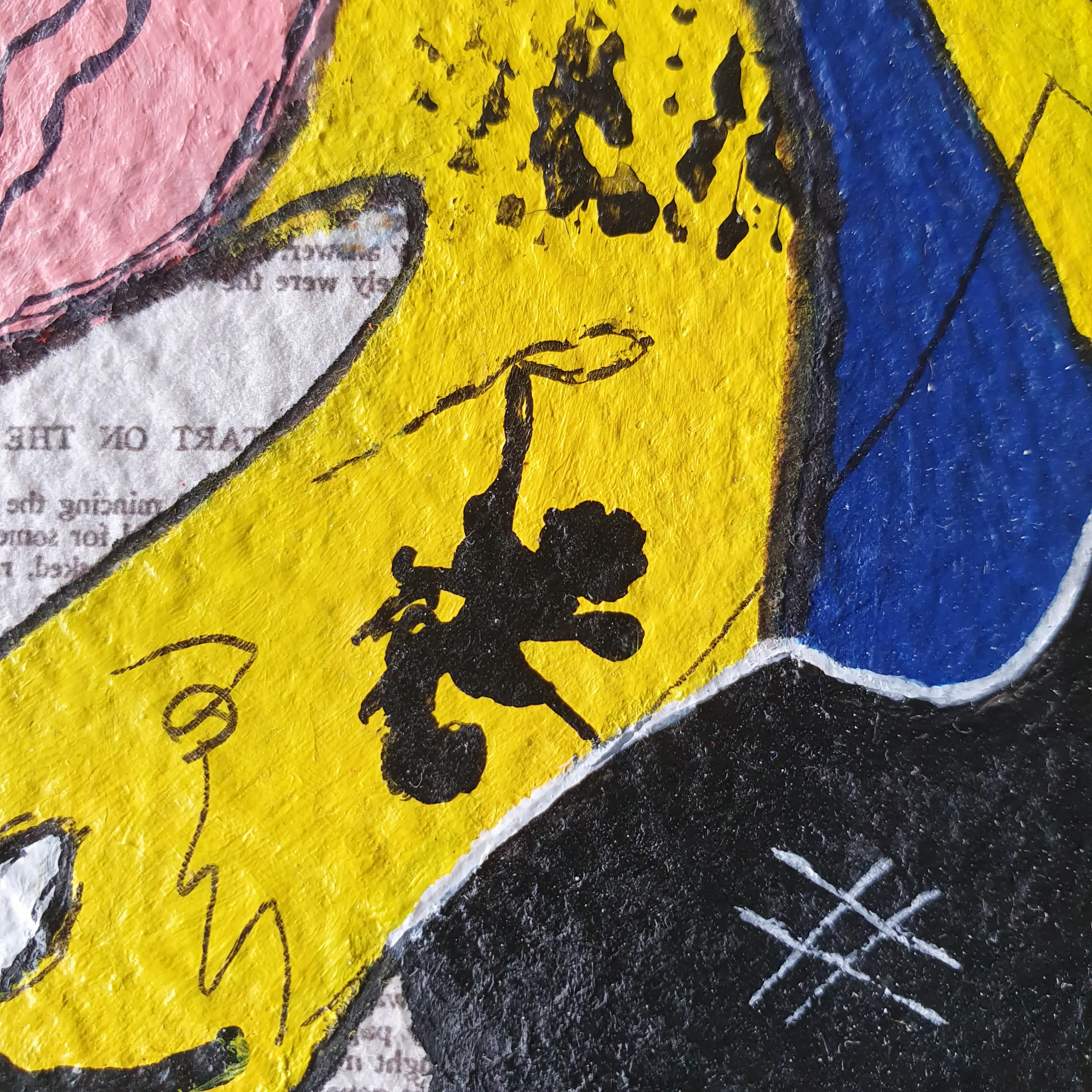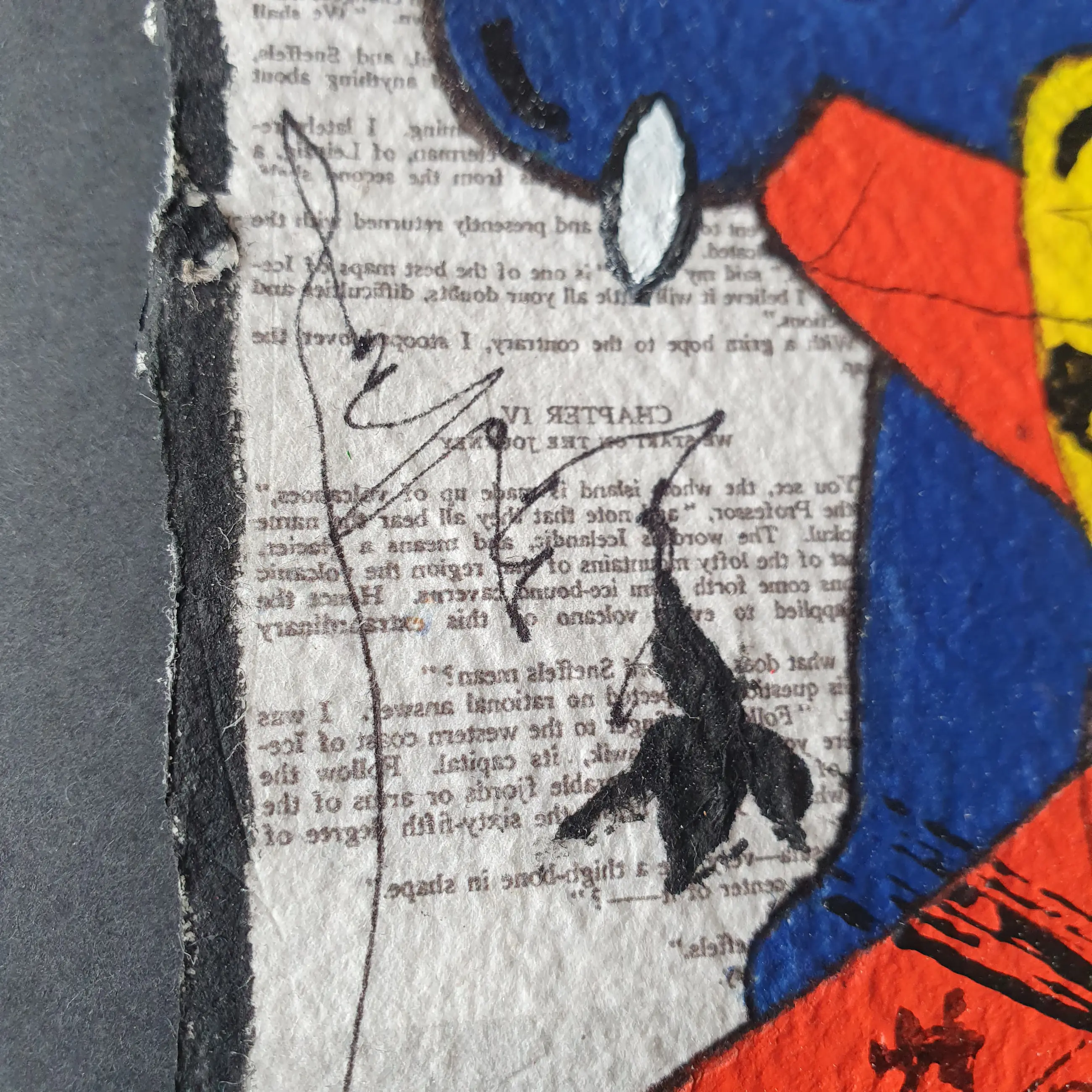 To the moon and back is een modern abstract kunstwerk met een vleugje urban. Het is geïnspireerd op de verhalen van Jules Verne. Fantasie wordt werkelijkheid. Dit kunstwerk is geschilderd op geschept en geperst gerecycled papier. Het is een stevig kartonachtig papier. De achtergrond heeft de kunstenaard bladzijdes uit een boek van Jules Verne verkleint afgedrukt. Er zijn 16 pagina's uit het boek, waar overheen is geschilderd. De kleuren en vormen zijn erg typerend van deze kunstenaar. Het stellen mensen voor en dieren, die samen een verhaal uitbeelden. Tussendoor staan in het zwart kleine dansende mensen. Het zijn de kleine details die ertoe doen, gereflecteerd aan ons leven op deze aardbol. Dit schilderij zit op zwarte karton bevestigd en kan zo worden ingelijst. Het wordt verpakt met een stukje hardboard zodat het niet kan vouwen en verzekerd verstuurd.