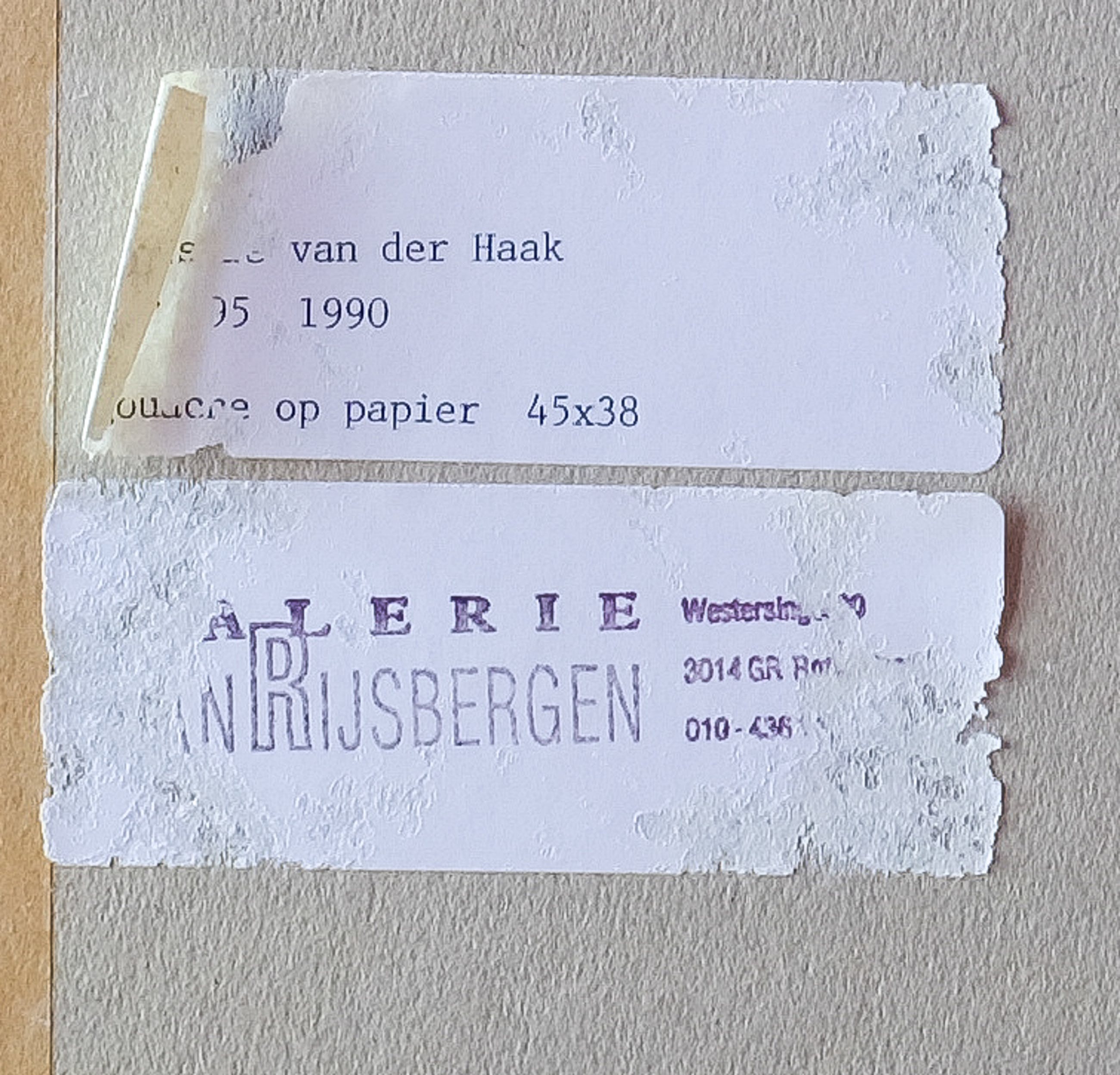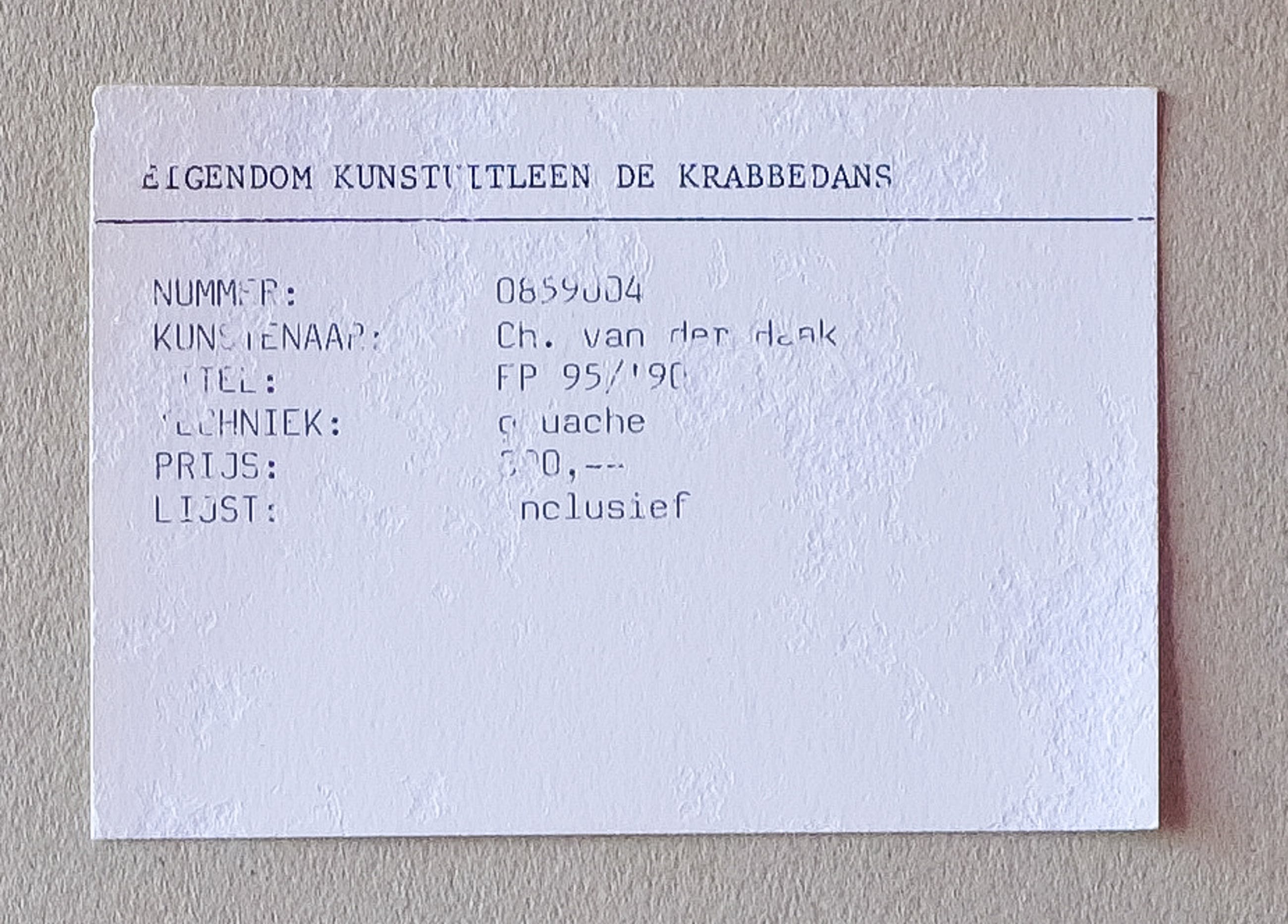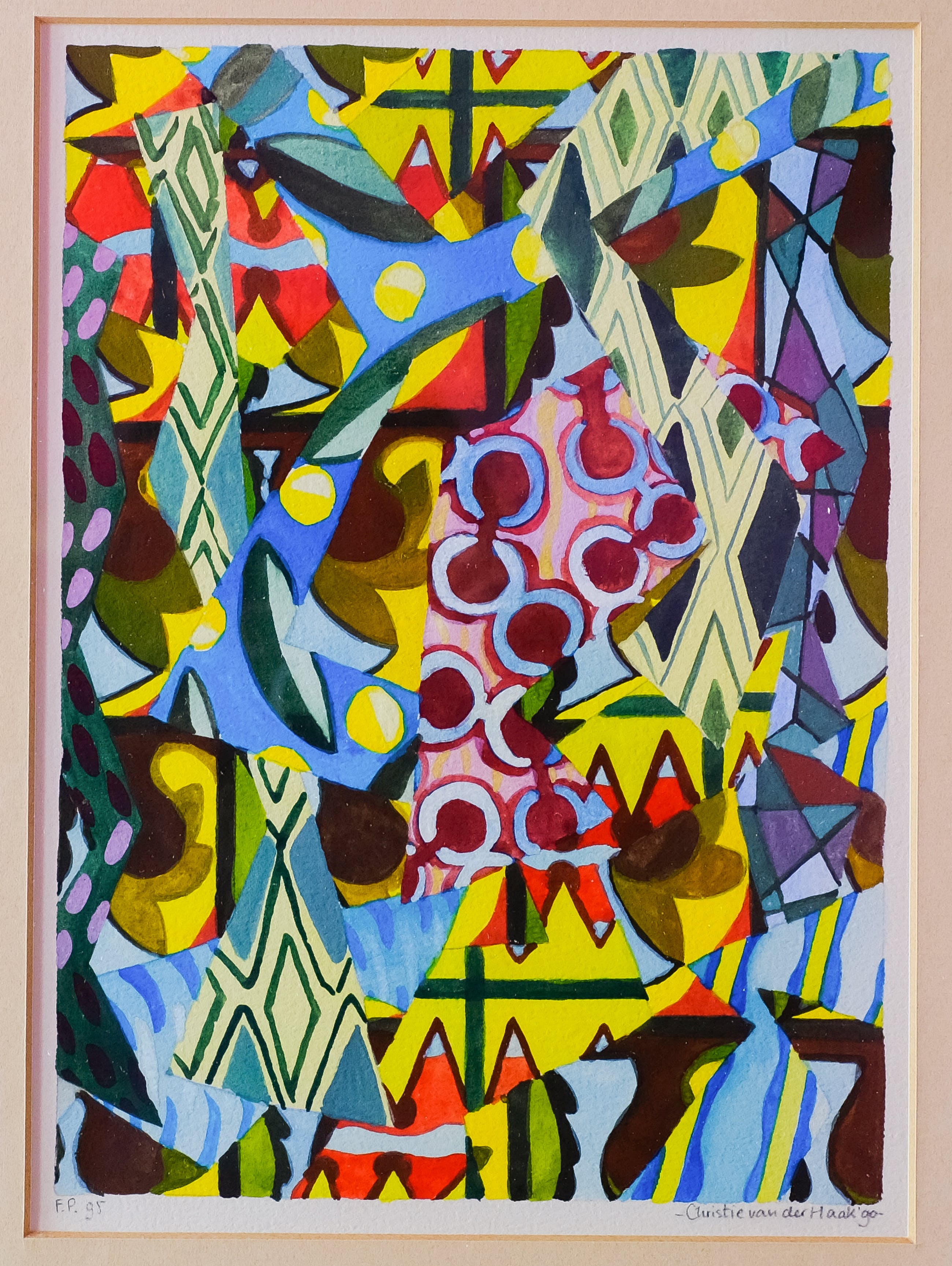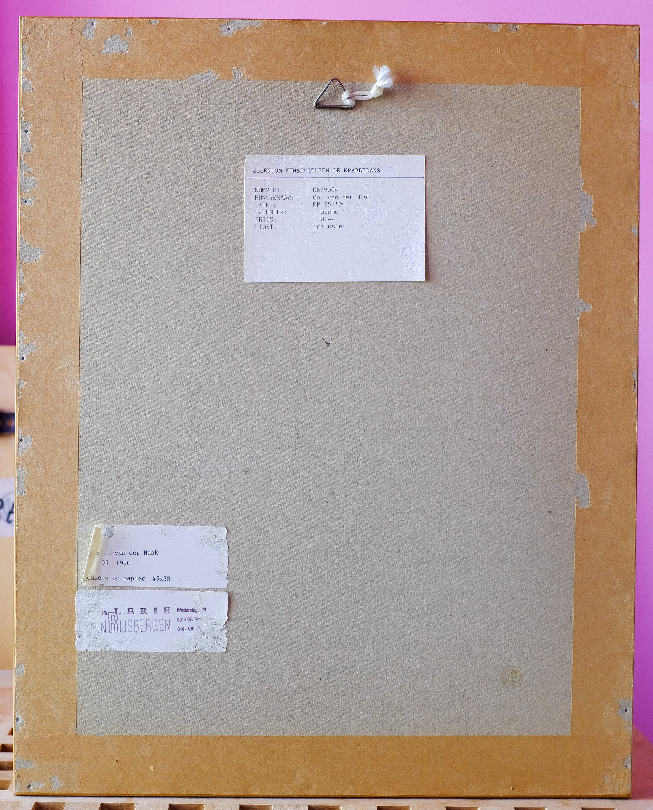 Kleurrijke gouache van de veelzijdige Christie van der Haak. Zie voor meer informatie haar website die eenvoudig via Google gevonden kan worden. Haar werk is in verschillende toonaangevende collecties opgenomen. Dit werk maakt deel uit van een set van drie, allen in dezelfde eenvoudige smalle houten lijst. Alle drie de werken maakten deel uit van een bedrijfscollectie die onder medewerkers is verdeeld. Oorspronkelijk aangekocht via kunstuitleen 'De Krabbendans' te Eindhoven. Het werk zelf is in prima conditie en zonder zichtbare schade, verkleuring of vlekken. De lijst is in de loop der jaren donkerder geworden en de labels aan de achterzijde zijn aangevreten door zilvervisjes.