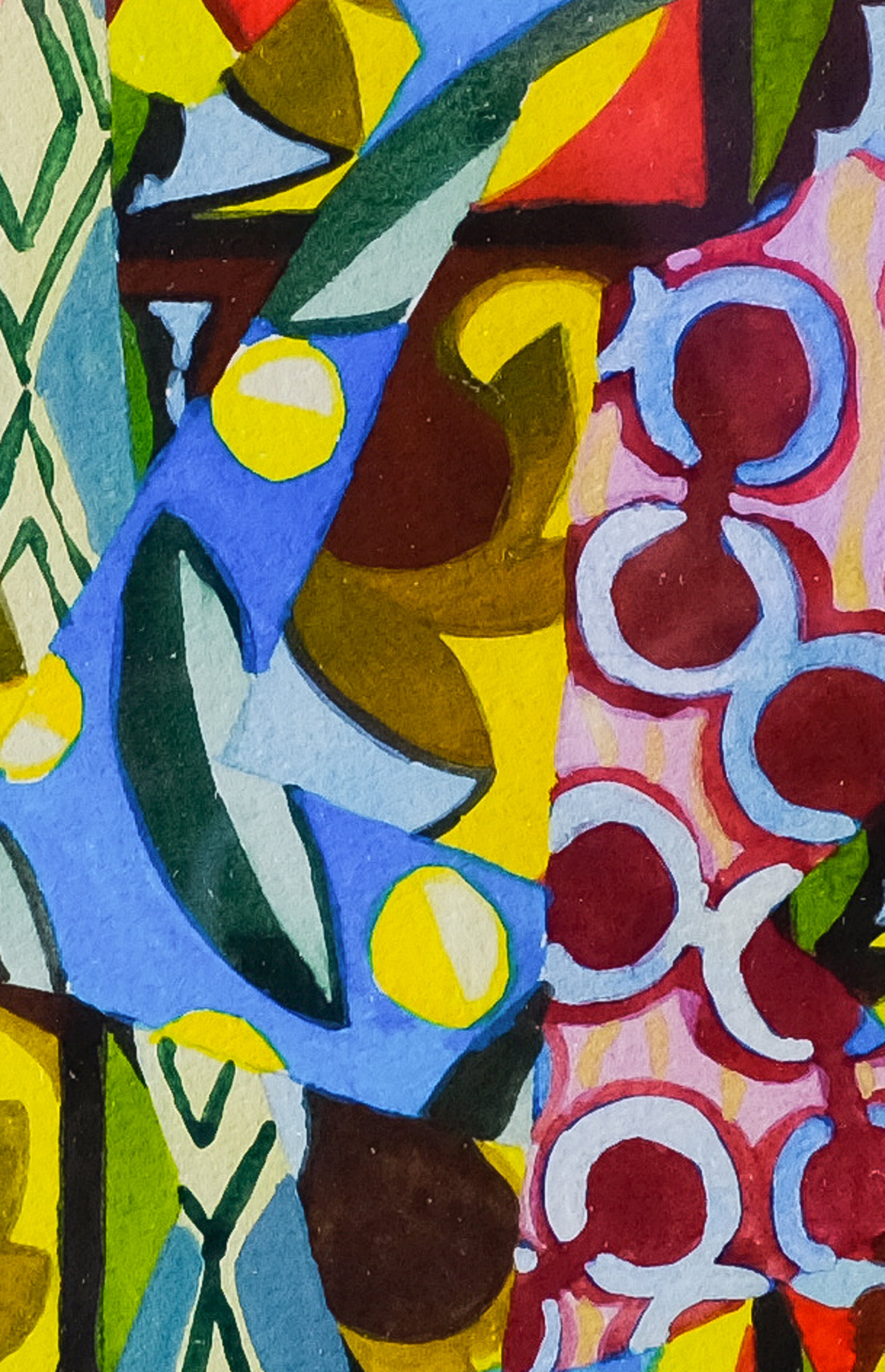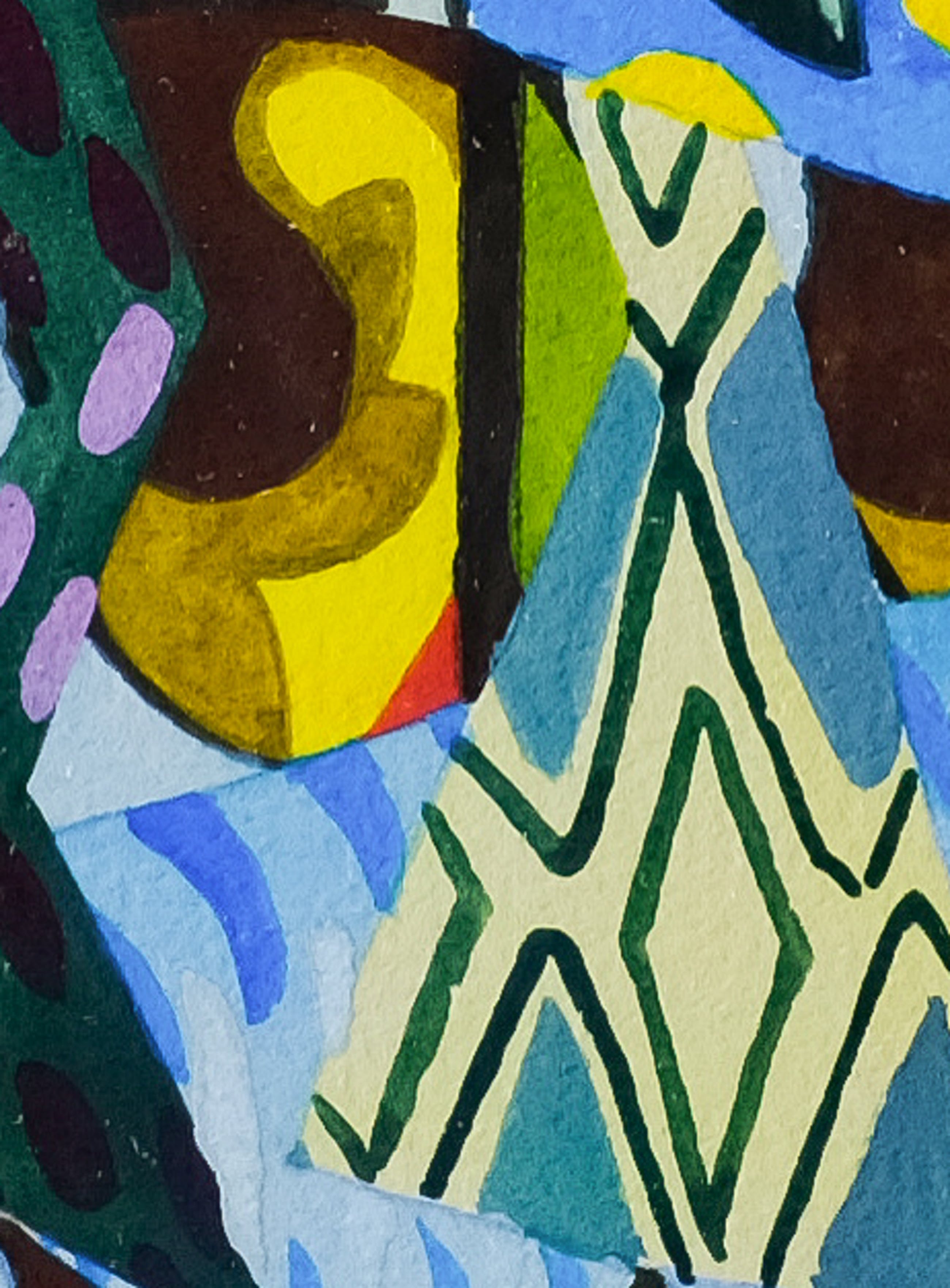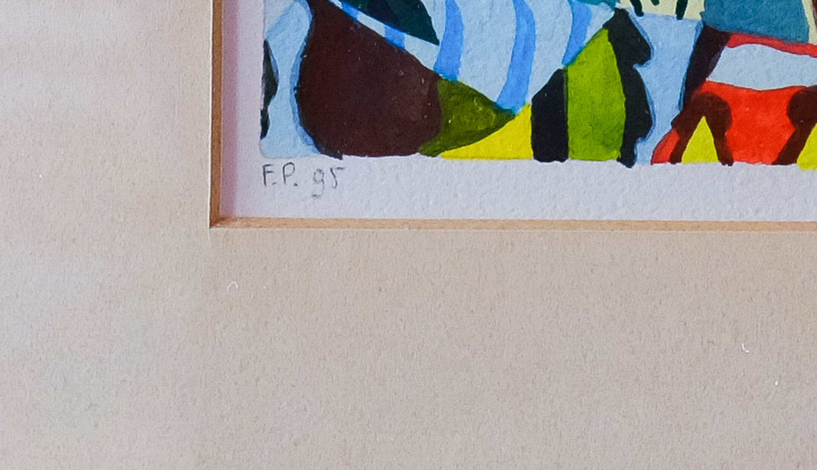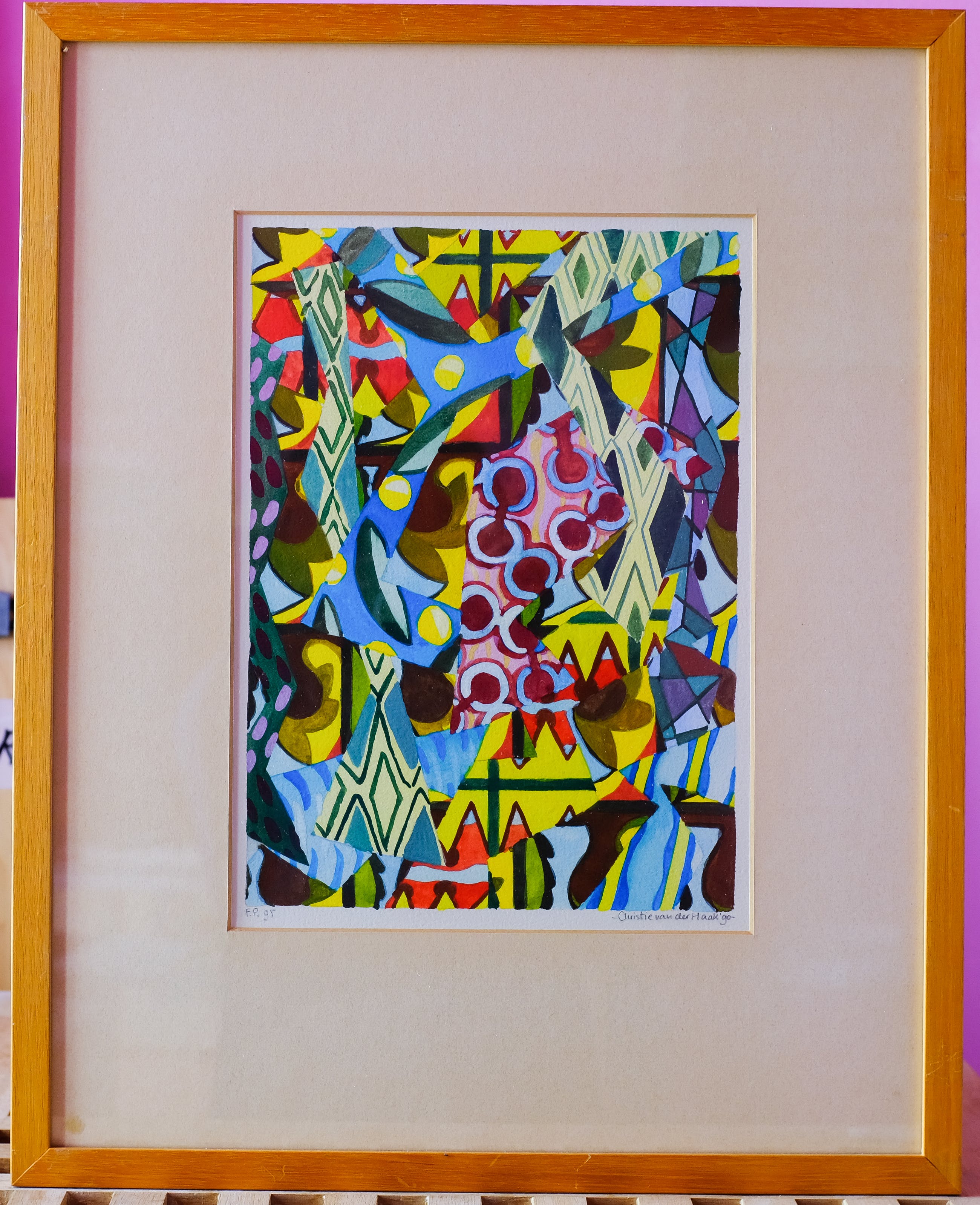 Kleurrijke gouache van de veelzijdige Christie van der Haak. Zie voor meer informatie haar website die eenvoudig via Google gevonden kan worden. Haar werk is in verschillende toonaangevende collecties opgenomen. Dit werk maakt deel uit van een set van drie, allen in dezelfde eenvoudige smalle houten lijst. Alle drie de werken maakten deel uit van een bedrijfscollectie die onder medewerkers is verdeeld. Oorspronkelijk aangekocht via kunstuitleen 'De Krabbendans' te Eindhoven. Het werk zelf is in prima conditie en zonder zichtbare schade, verkleuring of vlekken. De lijst is in de loop der jaren donkerder geworden en de labels aan de achterzijde zijn aangevreten door zilvervisjes.