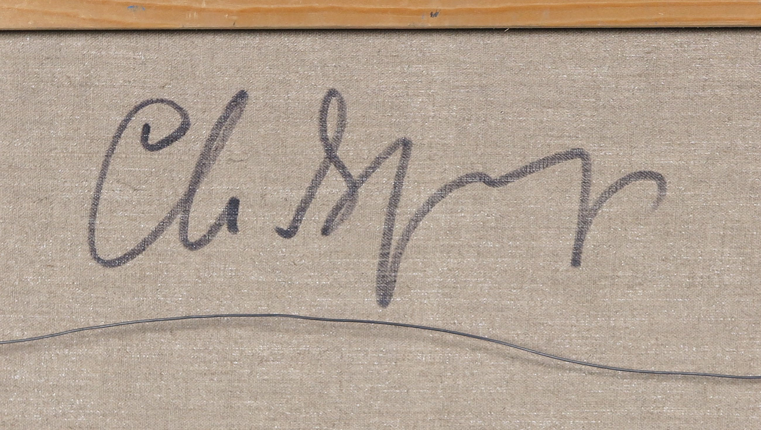 Het werk is gesigneerd op de achterzijde. Slijtage op hoeken en langs randen van het doek.