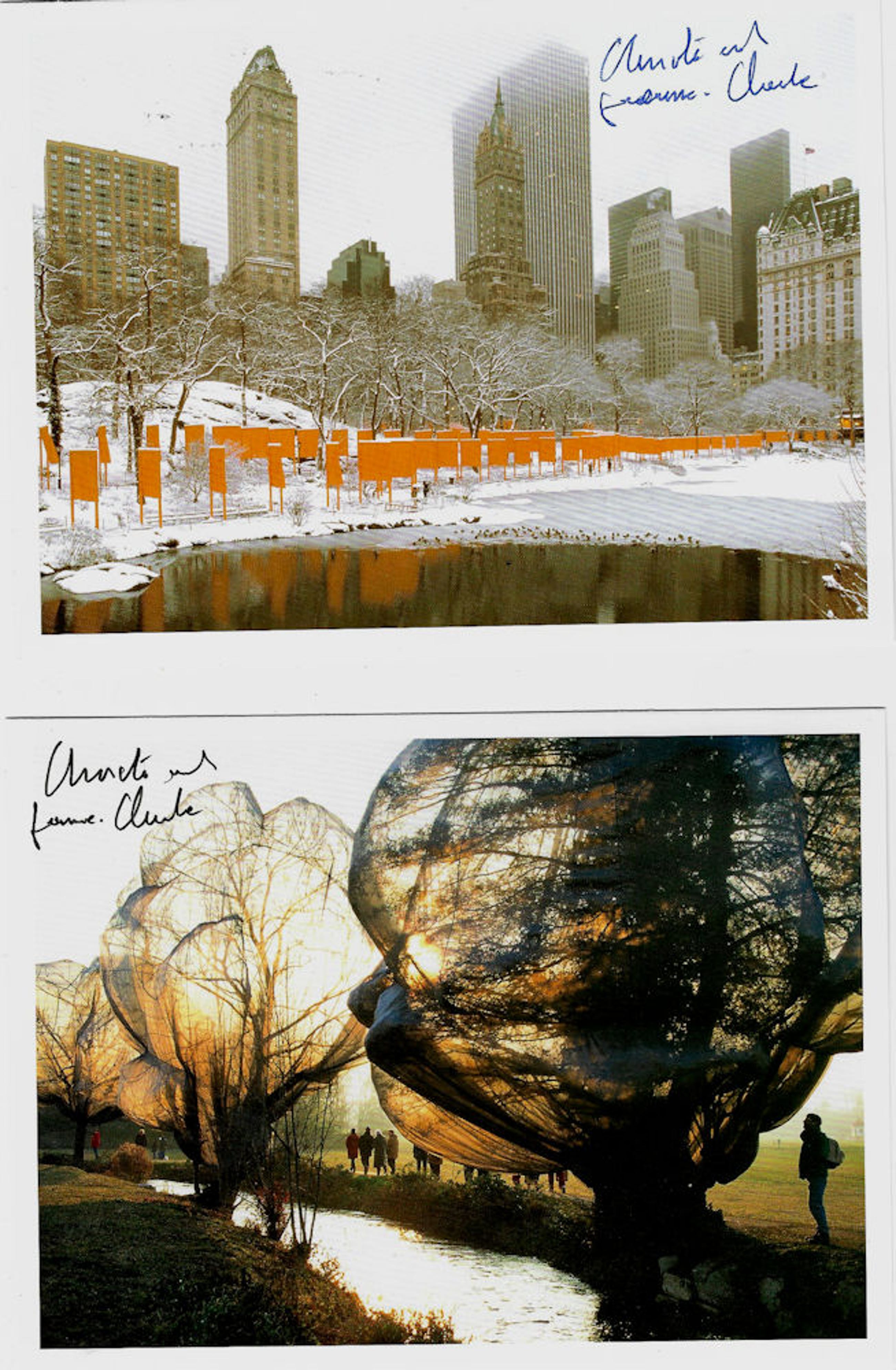 Mooi lot! DRIE ( 3! ) handgesigneerde Taschenkaarten van Christo and Jeanne Claude iedere kaart meet 17 X 12,7 cm en handgesigneerd 1) Mastaba2) The Gates3) Wrapped Trees Aangetekende verzending met tracking nummer