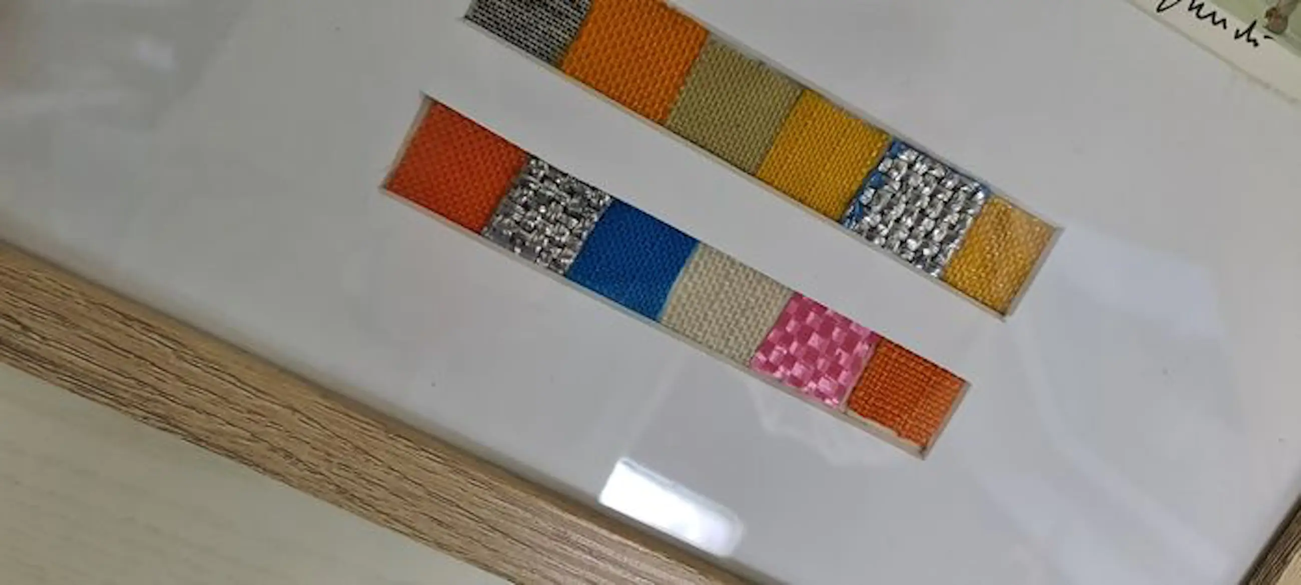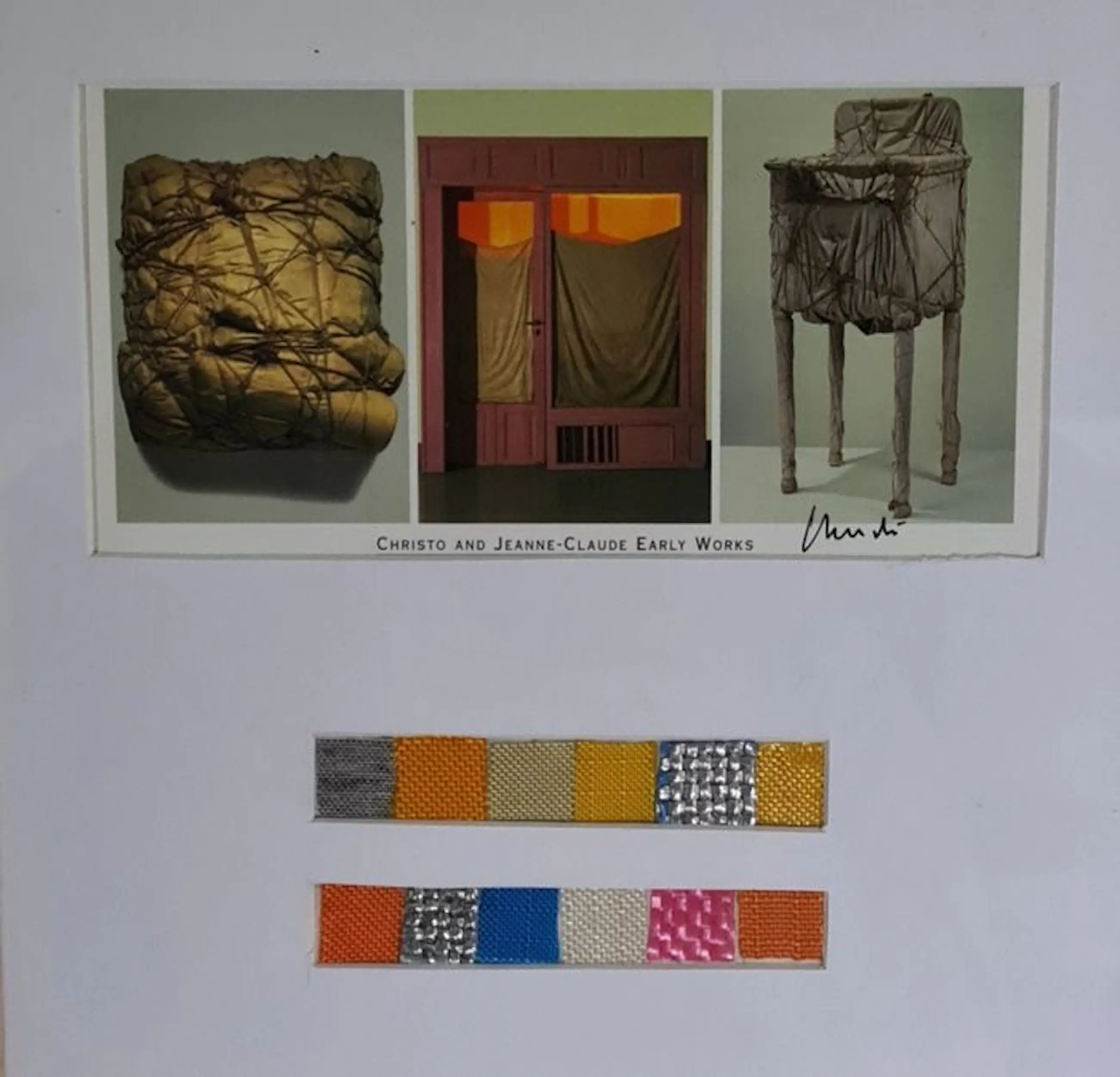 12 kleine stukjes stof van: De Omringde Eilanden Het rennende hek De poorten De paraplu's VS-JAPAN De drijvende pieren De Pont-Neuf verpakt The Wrapped Walk Ways De ingepakte bomen Het gordijn van de vallei De ingepakte Arc de Triomphe Afmetingen stukken stof: 2 × 2 × 12 cm, verdeeld over 2 stroken van 2 × 12 cm