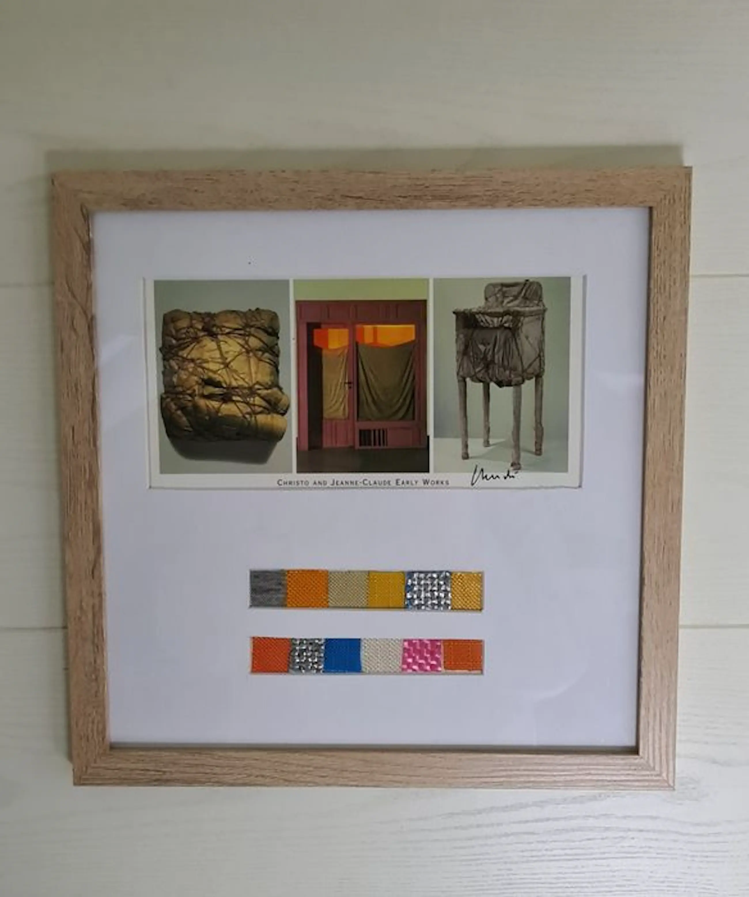 Christo en Jeanne-Claude vroege werken Houten lijst met XXL kunstkaart en 12 stukken stof van de grootste projecten van Christo en Jeanne-Claude.