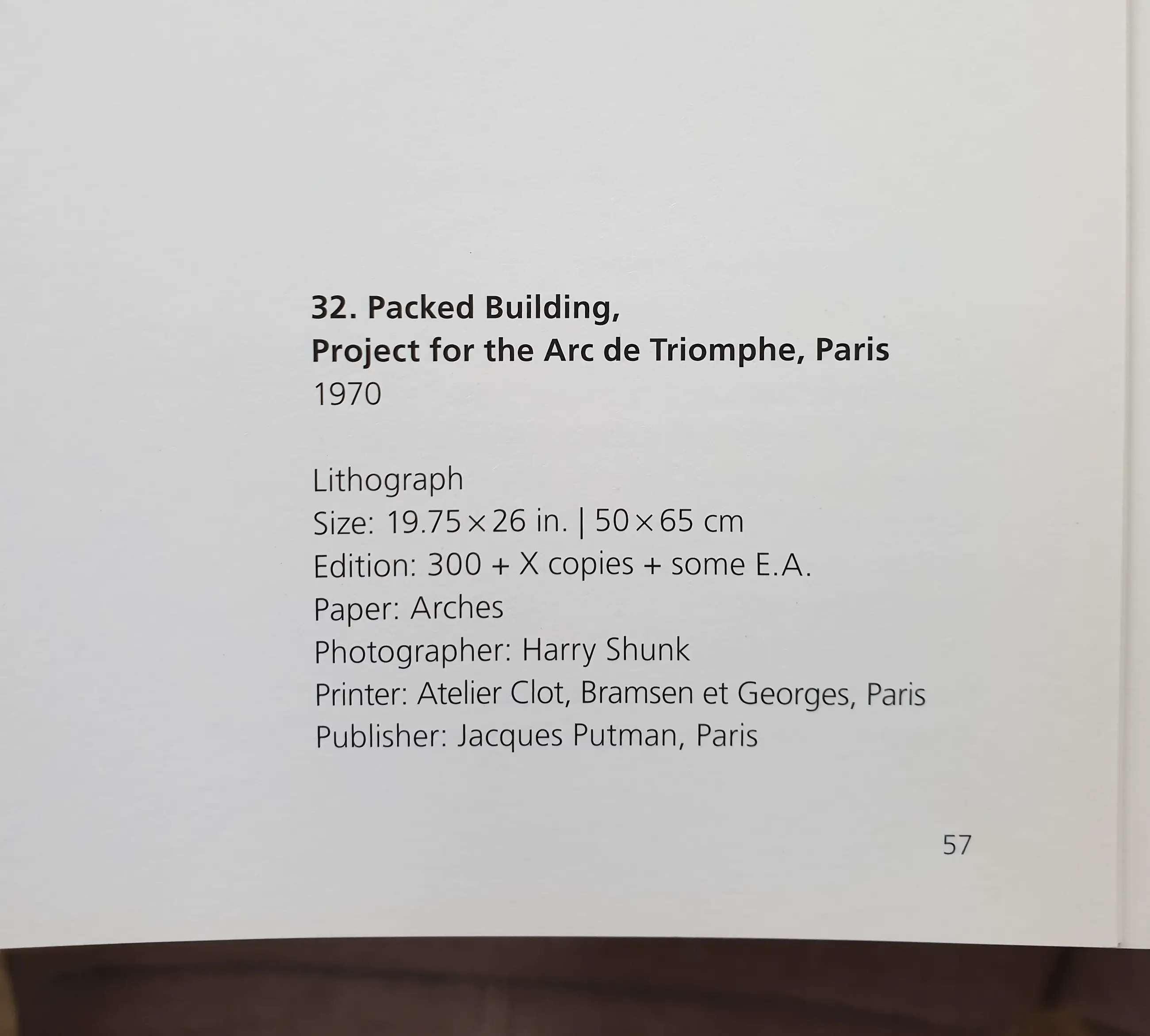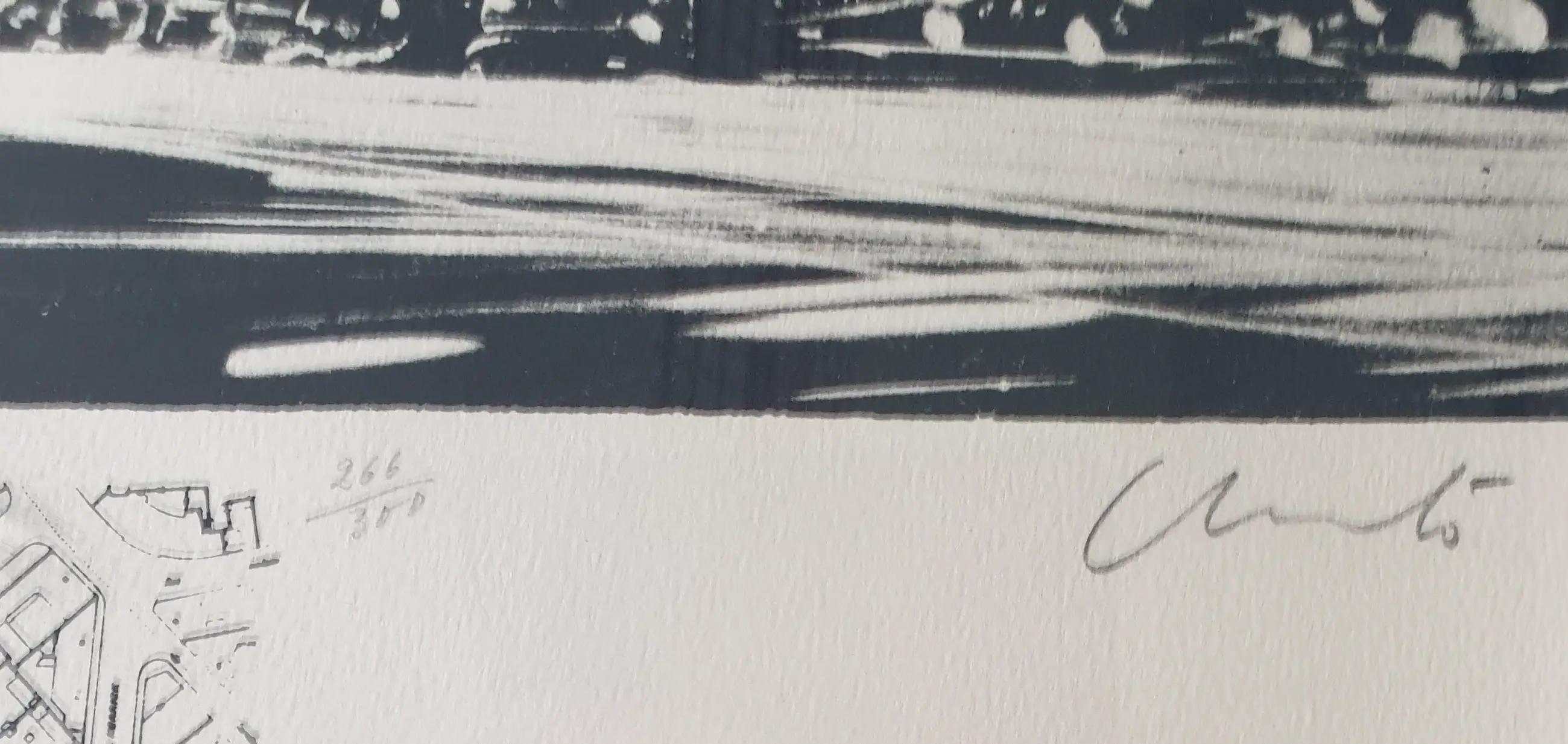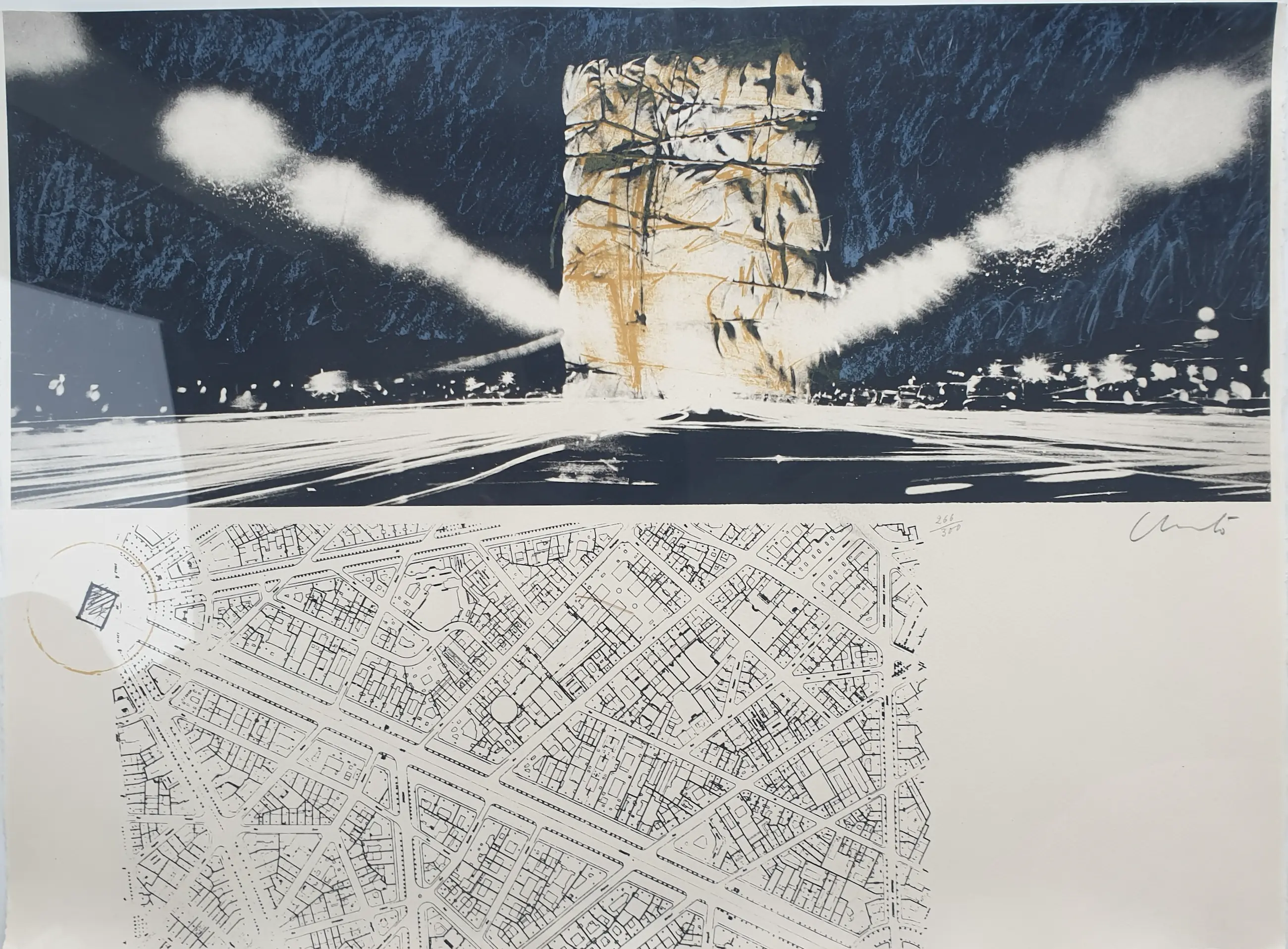 Litho van de "Arc de Thriomphe" uit 1970 van Christo. Het werk met nummer 266/300 verkeert in een goede conditie en is in een plexiglazen lijst gevat. Het werk meet 50 x 65 cm. Aangekocht in museum Maeght in St. Paul de Vence. het werk staat in de "Catalogue Raisonné" van Schellmann uit 2013 op blz. 57.