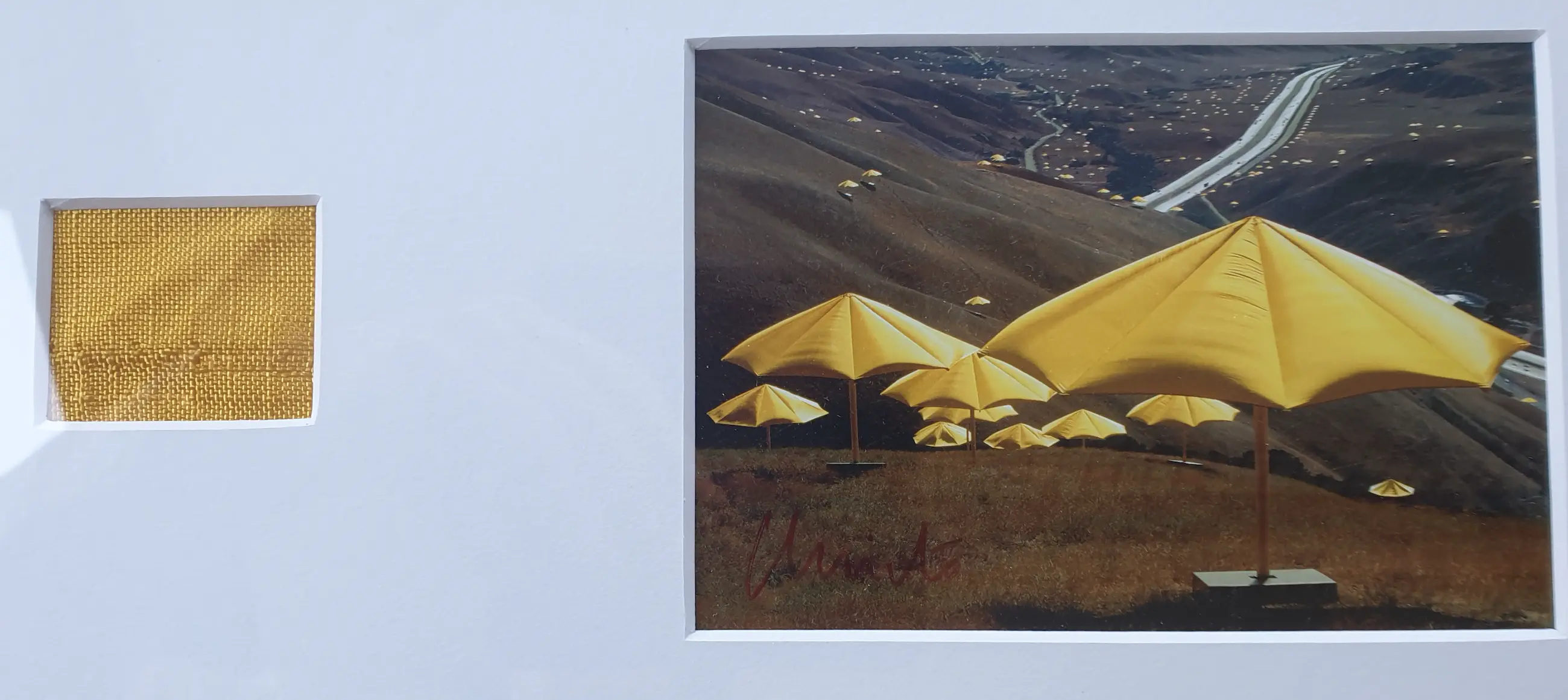 Gesigneerde Artcards (Taschen uitgever) van Christo. Het gaat om het project "The Umbrellas" in de VS (geel) en tegelijkertijd in Japan (blauw). De ingelijste en gesigneerde artcards meten 12 x 16 cm. De ingelijst stukjes stof van het project meten ongeveer 6 x 6 cm. Inclusief passe partout en zilverkleurige houten lijst (met lichte gebruikssporen) 35 x 43 cm.