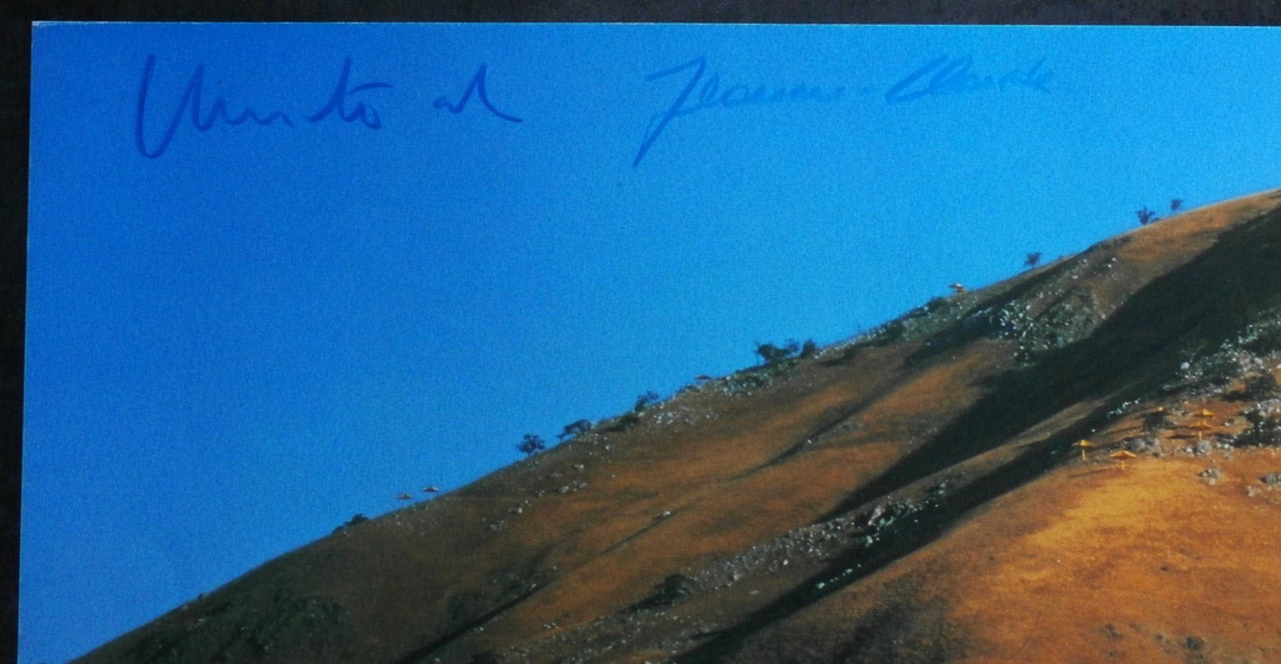 Handgesigneerde fotolitho uit 1991 van Christo en Jean Claude.Titel: The umbrella's, California, U.S.A. De litho is door beide kunstenaars , linksboven, gesigneerd. Afmetingen: H 50 x b99 cm. Conditie: in goede staat. Aan bovenzijde zit een klein scheurtje (Zie foto 4, halve cm) in het werk. (zie foto) Bij inlijsting valt deze onder het passe-partout.