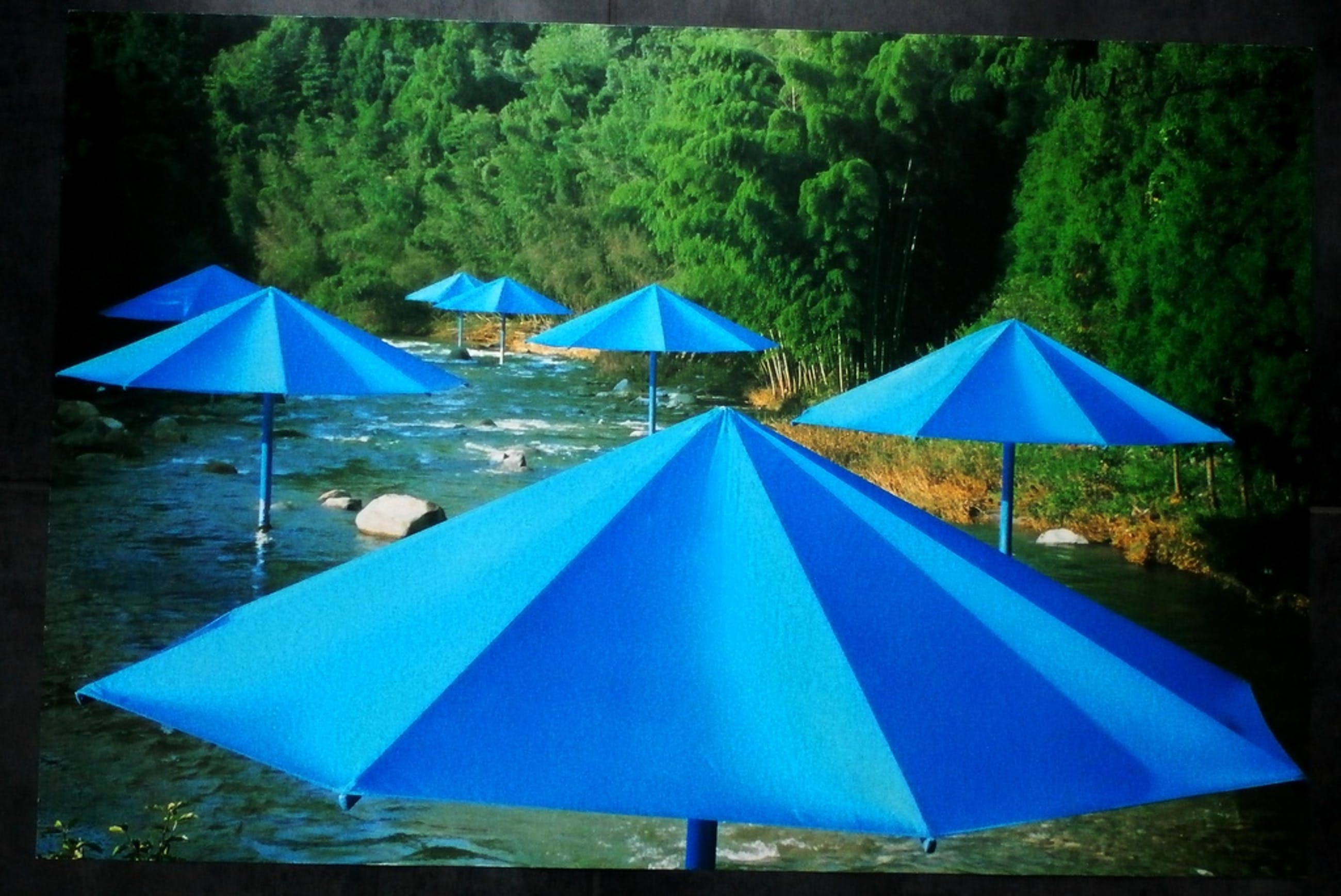Handgesigneerde fotolitho uit 1991 van Christo en Jean Claude.Titel: The umbrella's, Japan. De litho is door beide kunstenaars gesigneerd. Afmetingen: H 64 x b95 cm. Conditie: in redelijke/goede staat. Er zitten wat kreukeltjes in het werk. Zie de foto;s.