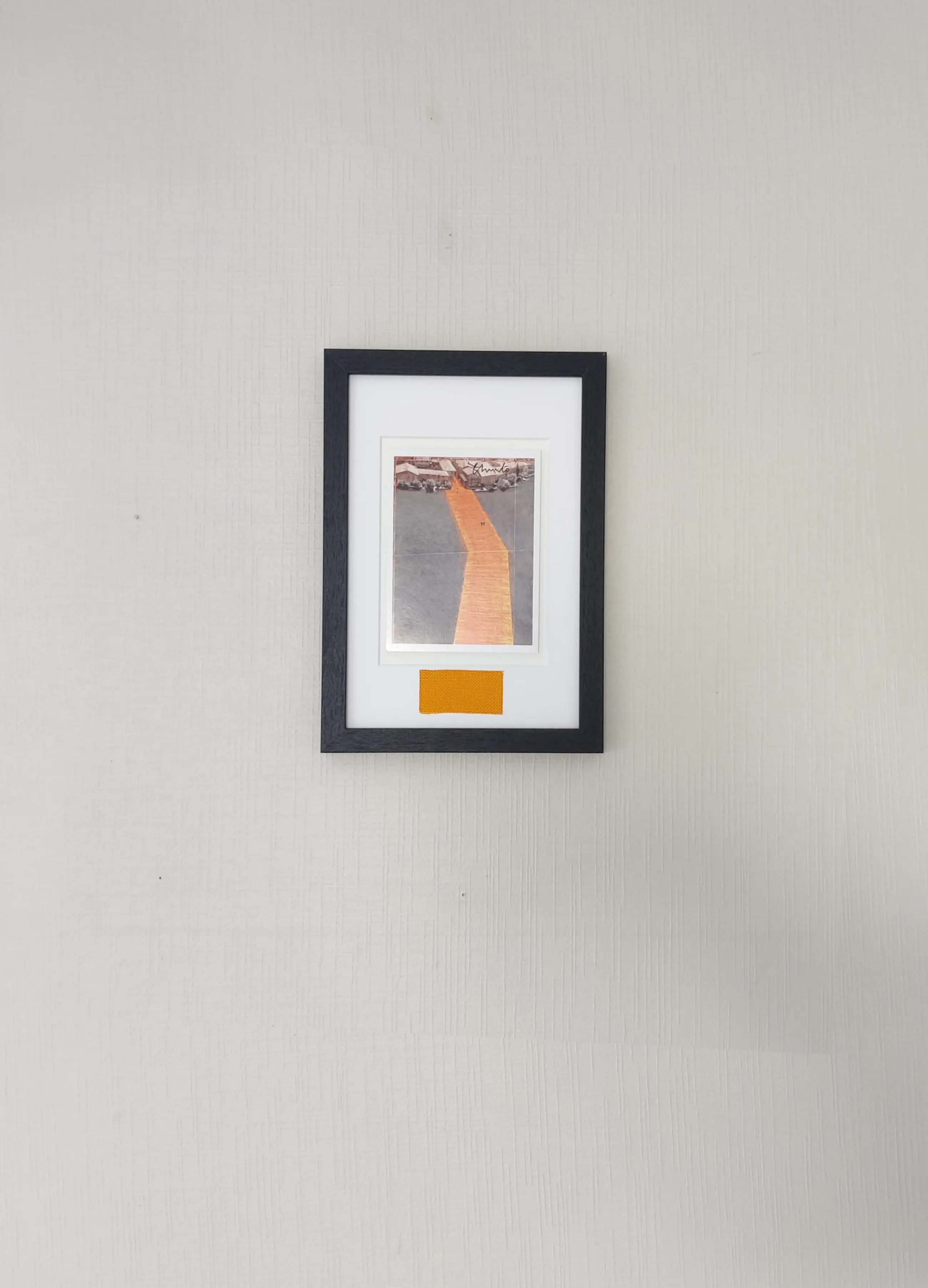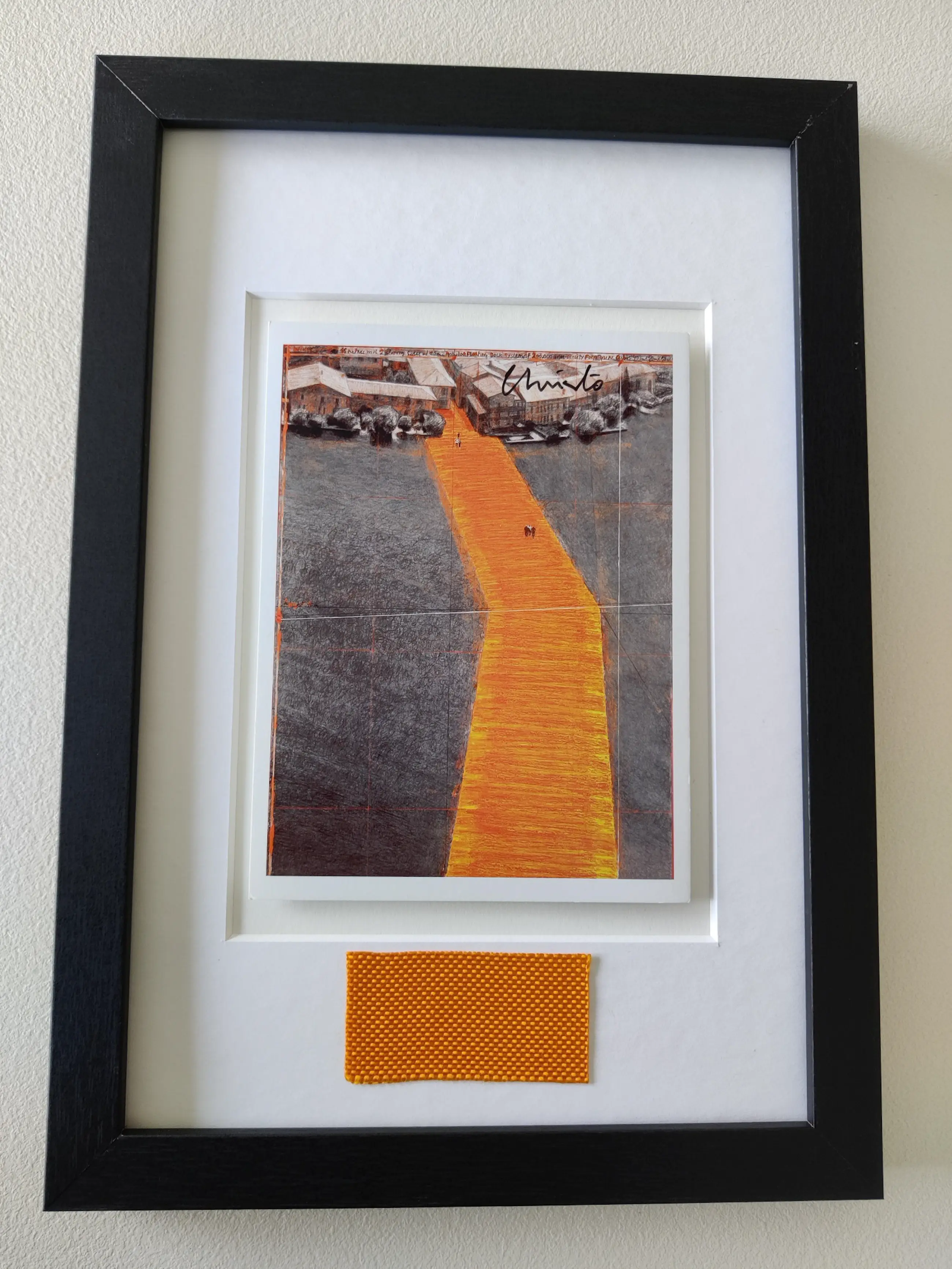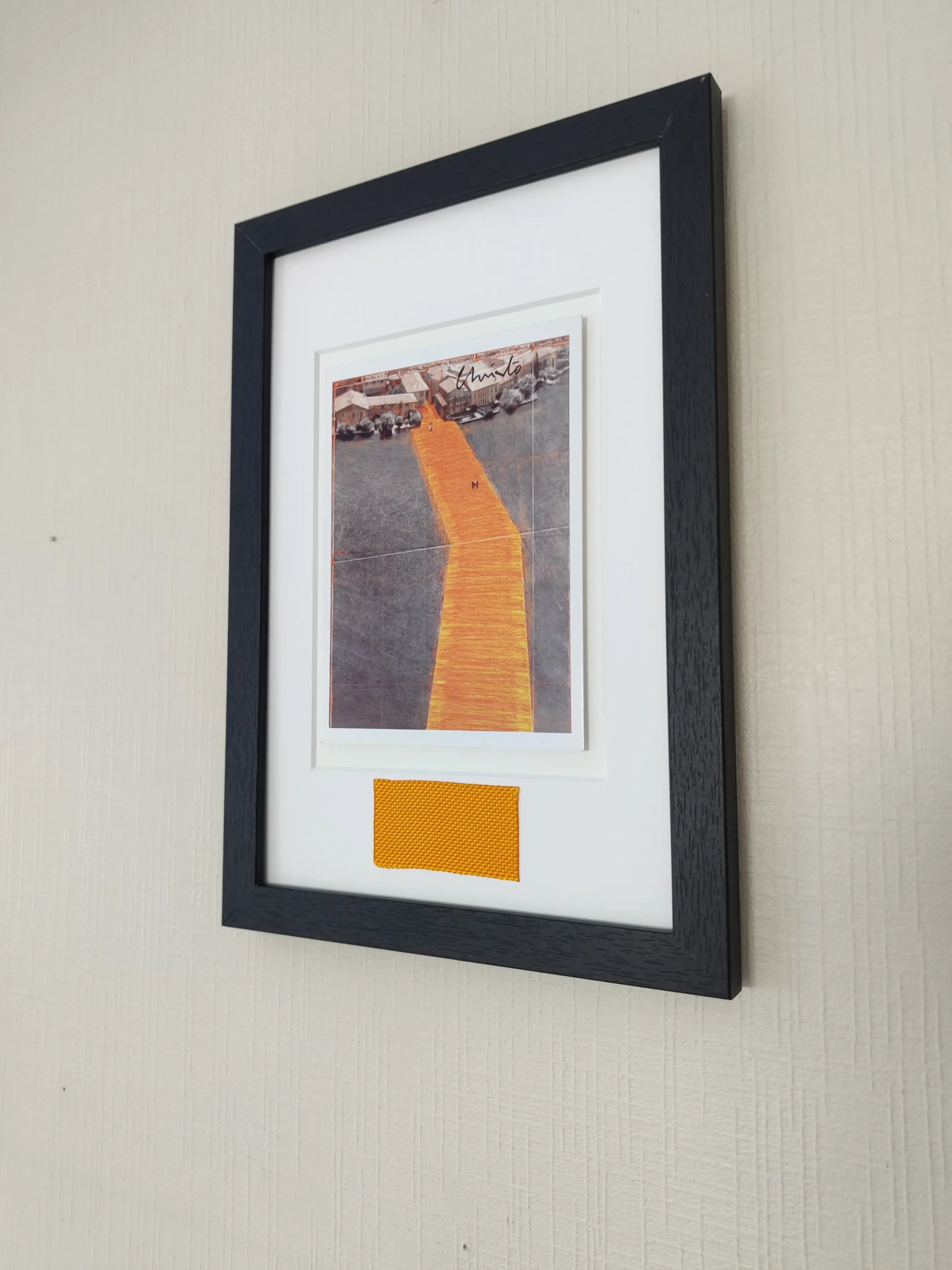 De kaart is professioneel ingekaderd achterglas en bevat een origineel stukje stof van de Floating Piers