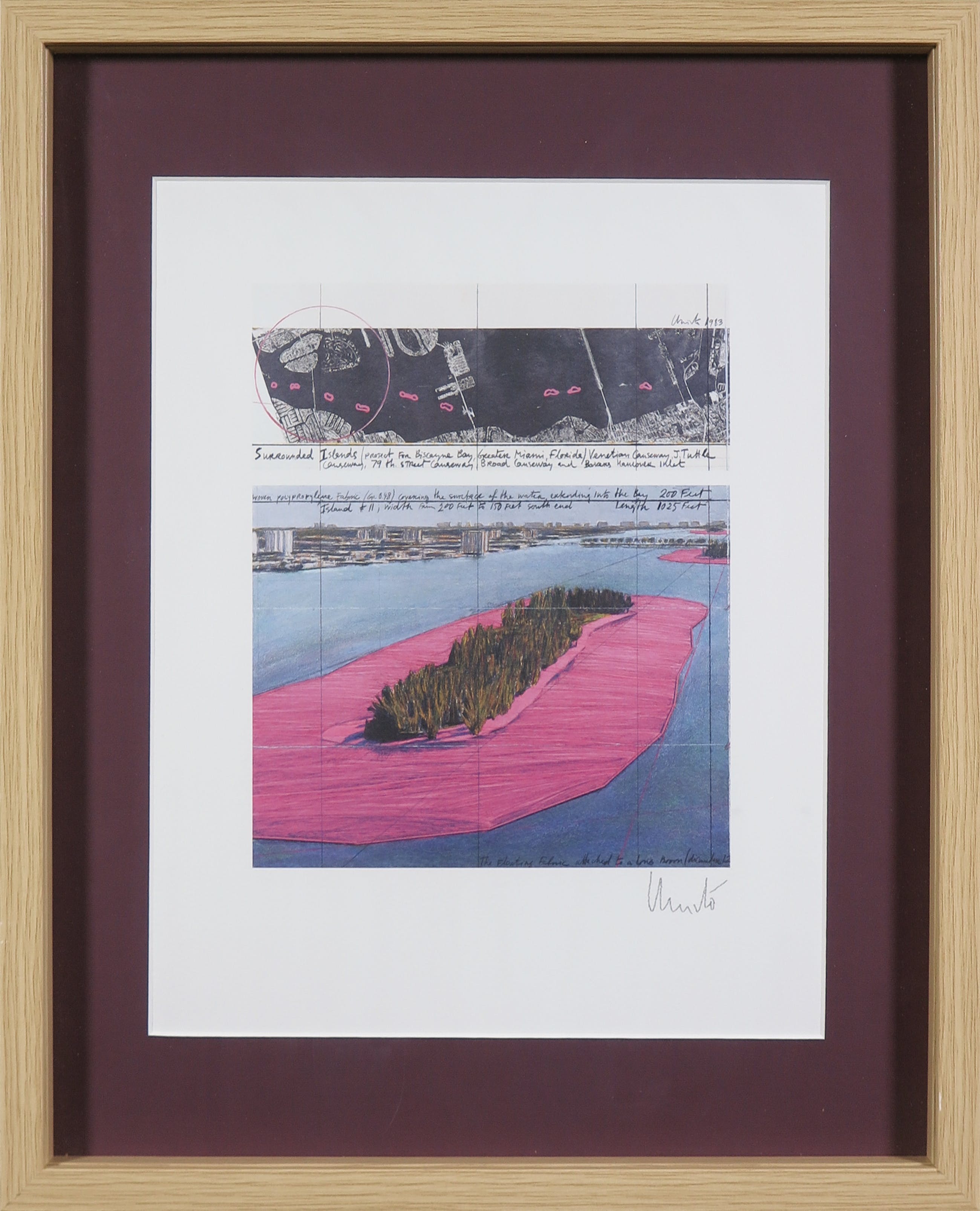 Druk van de Surrounded Islands in Biscayne Bay, gesigneerd door Christo.