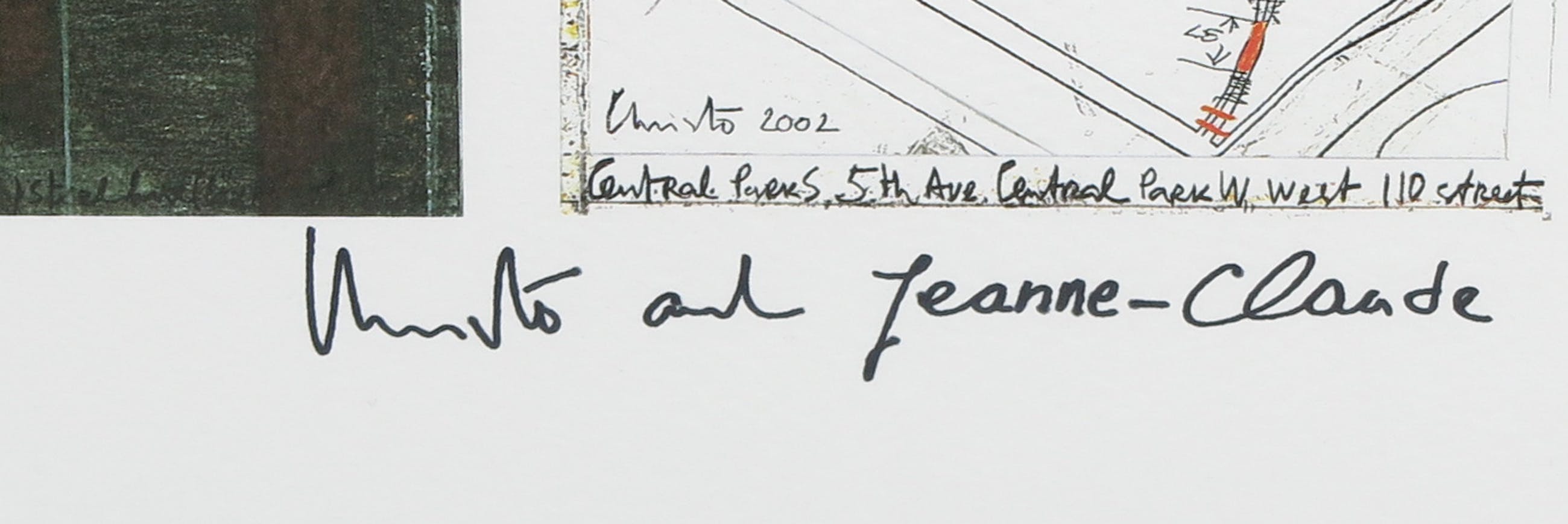 Deze door Christo en door Jeanne-Claude gesigneerde foto (offset) toont het grootschalige land-art/kunstproject The Gates. Bij deze installatie werden meer dan 7500 panelen met vrij hangende oranje gekleurde stof - poorten - geplaatst op de wandelpaden in het Central Park in New York.