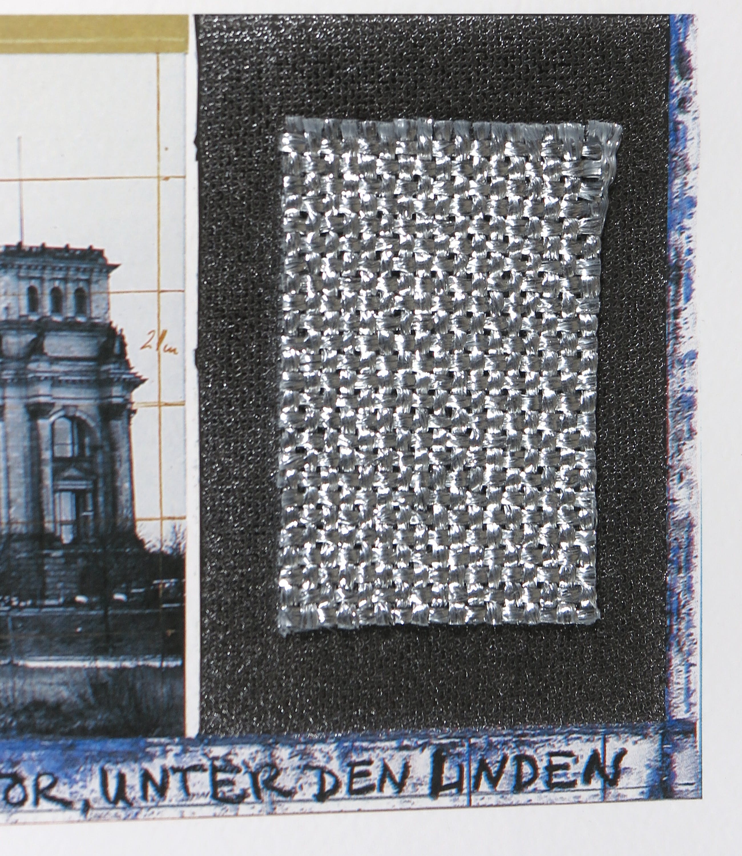 Rechtsboven een stofmonster, van de stof die is gebruikt in het project.