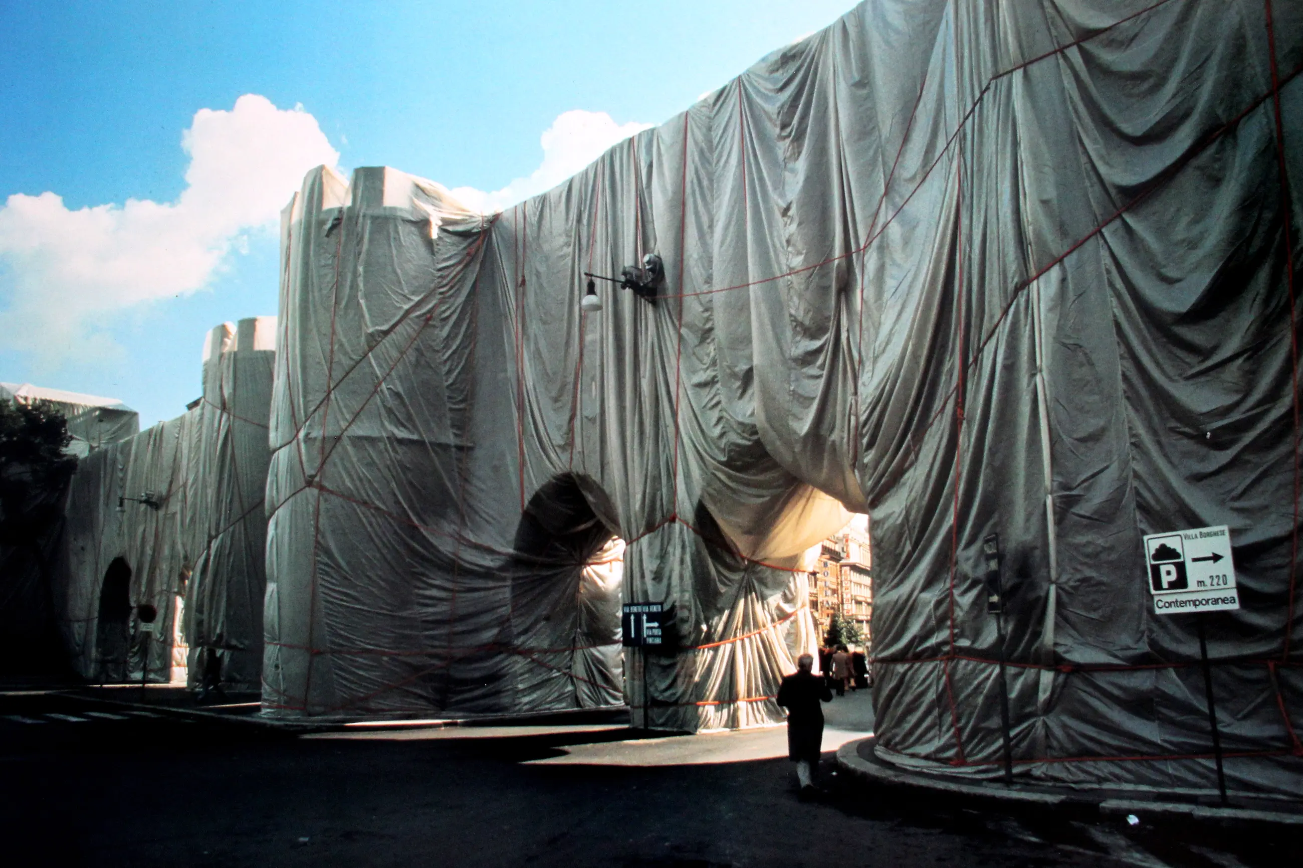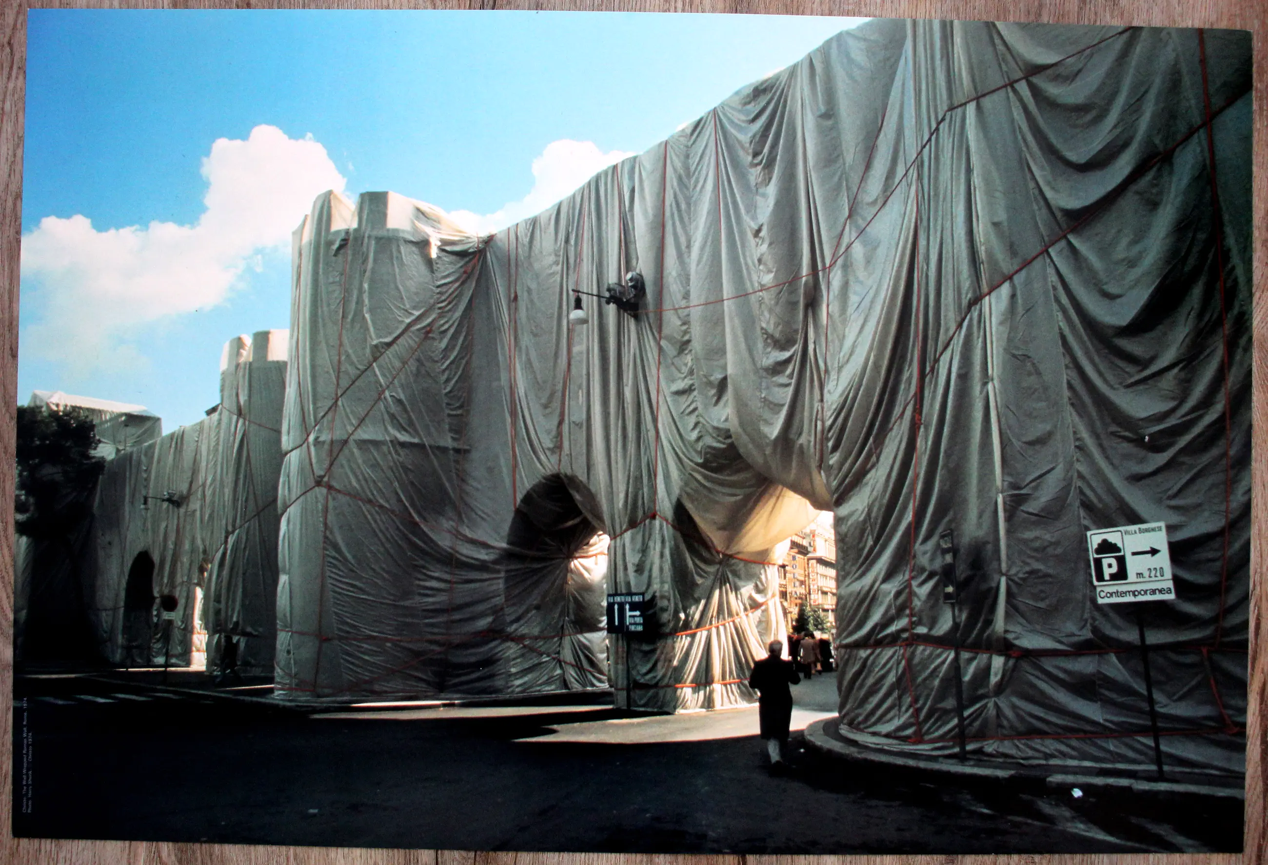 Ongesigneerde fotolitho uit 1974 van Christo. Titel: The Wall Wrapped Roman Wall, Rome.