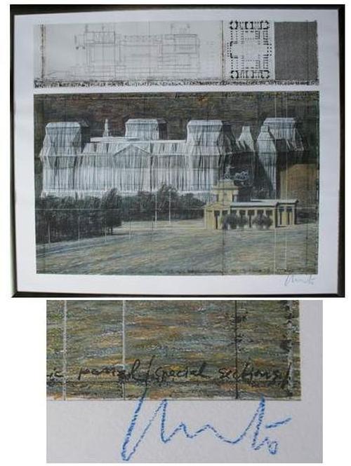 Original-Offset Lithographie auf gehämmertem Karton nach einer Collage "Wrapped Reichstag (Projekt for Berlin) Platz der Republik, Brandenburger Tor, Unter den Linden"; 1993; handsigniert unten rechts mit blauem Wachsstift; Auflage ca. 1000 Stück, davon ca. 100 signiert (die genaue Zahl ist unbekannt); Papier 70 x 80 cm; Bild 62 x 70 cm; Edition: Schumacher Fils Düsseldorf; Erhaltung: neuwertig; dies ist ein Privatverkauf, keine Gewährleistung, keine Garantie und ohne Rückgaberecht; Versand: stabile Rolle mit DHL; Versandkosten innterhalb Deutschland 12,00 Euro;