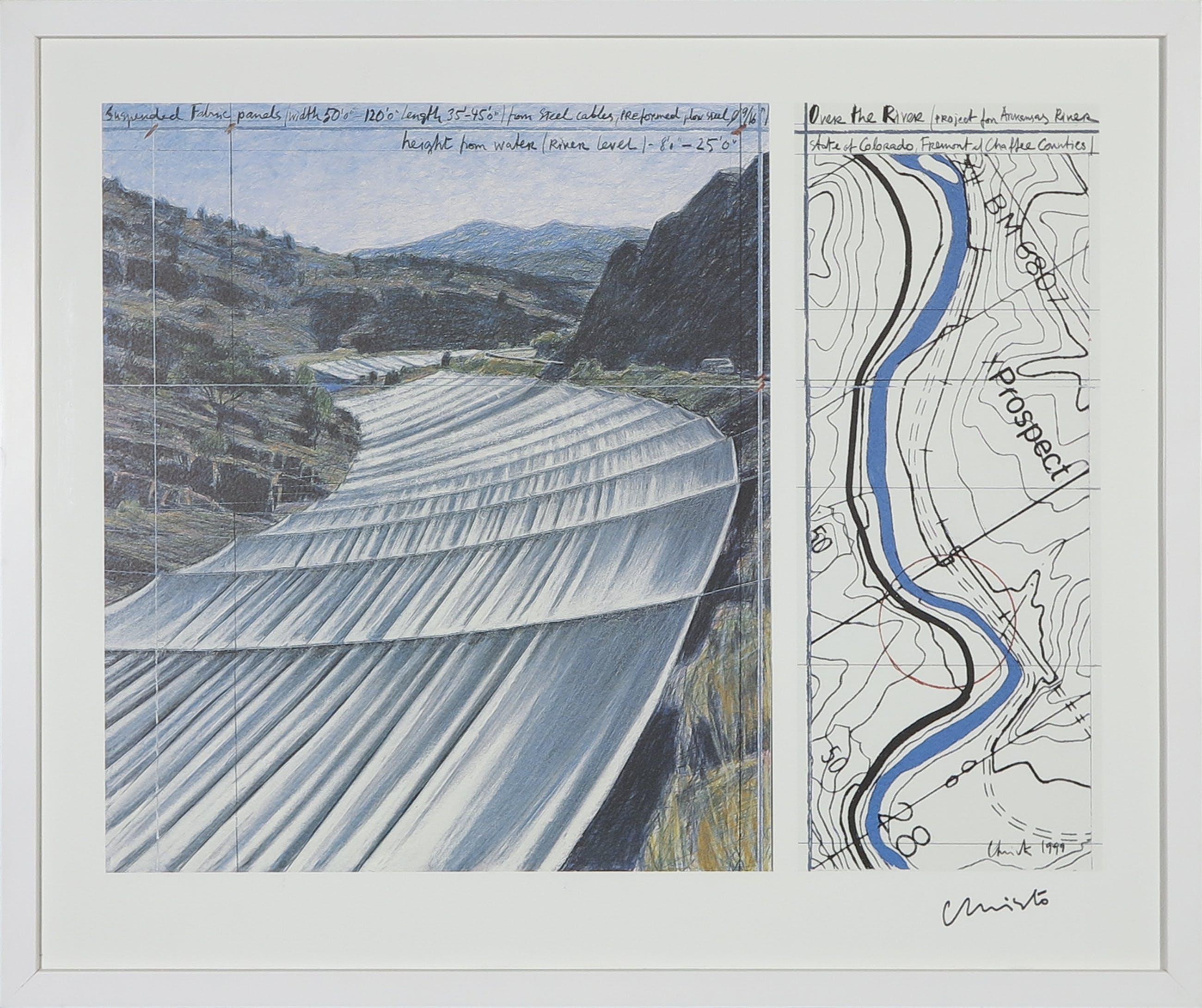 Deze met zwarte stift gesigneerde print is onderdeel van het project Over the River. Het doel van dit project was om de Arkansas River over een strook van meer dan 70 km te bedekken met een zilveren luifel. Uit onvrede over de uitkomst van de presidentsverkiezingen in de VS trok Christo in 2017 na 20 jaar de stekker uit het controversiële project, dat zijn grootste kunstwerk ooit had moeten worden.