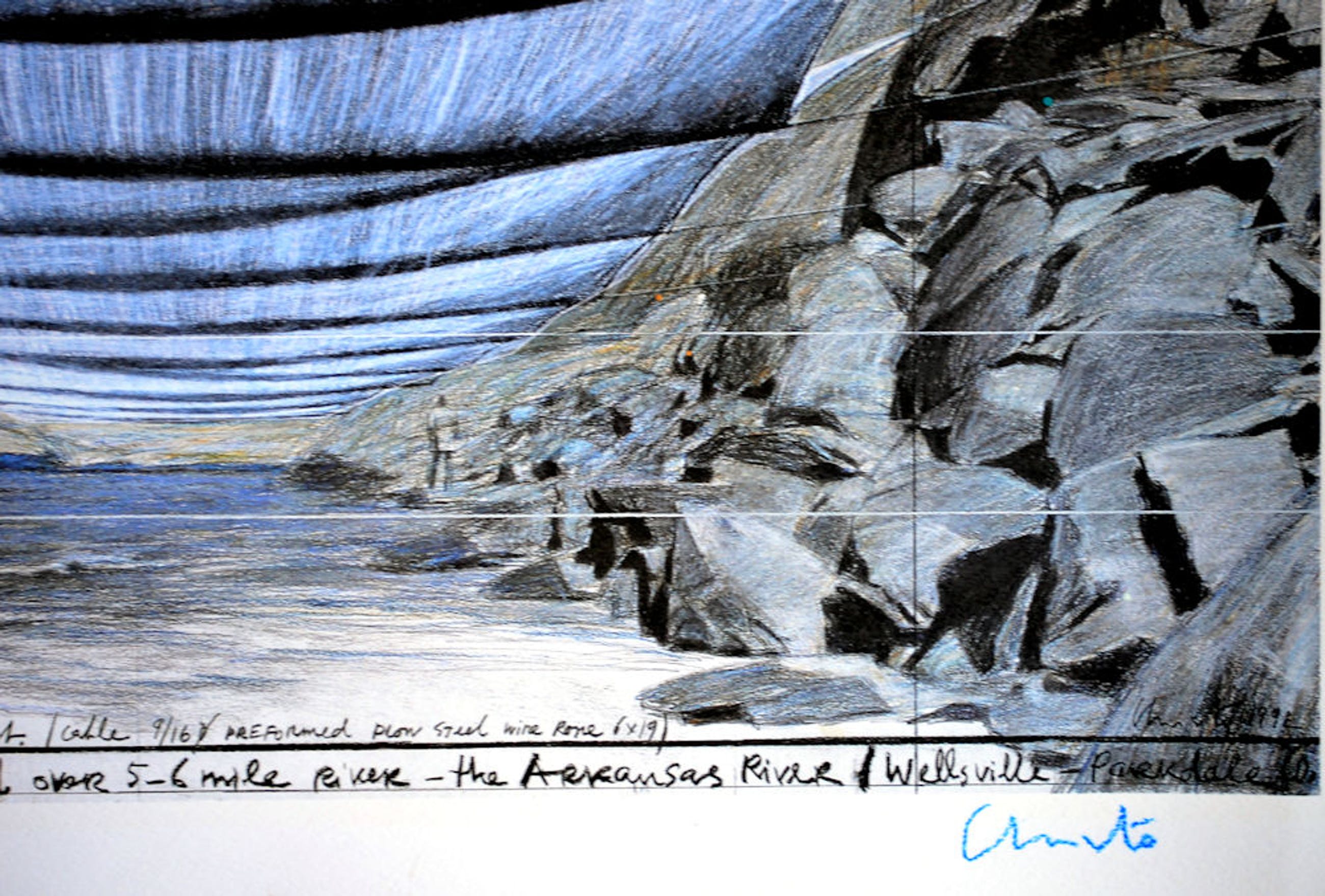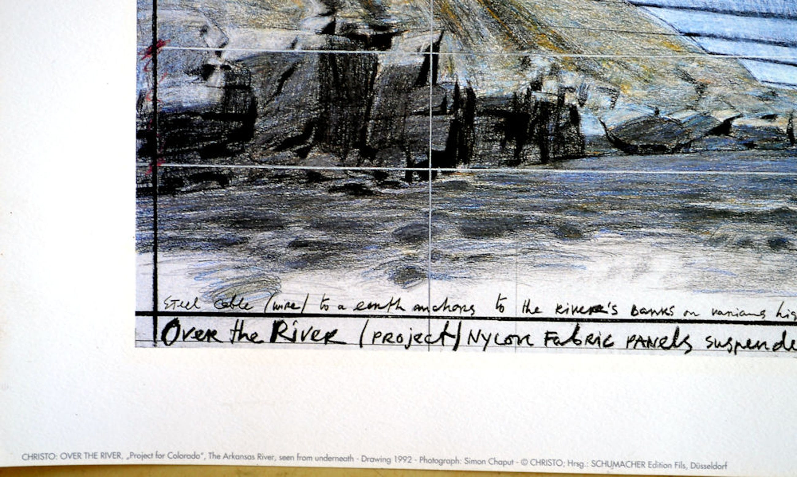 CHRISTO AND JEANNE CLAUDE OVER THE RIVERHet project dat Christo nog niet heeft gerealiseerdPrachtig geprint op gehamerd karton en prachtig handgesigneerd in blauw potloodFormaat: 70 x 50 cm ( B + L )Gallerypreis schommelt tussen de 700 a 900 euroWordt aangetekend verstuurd