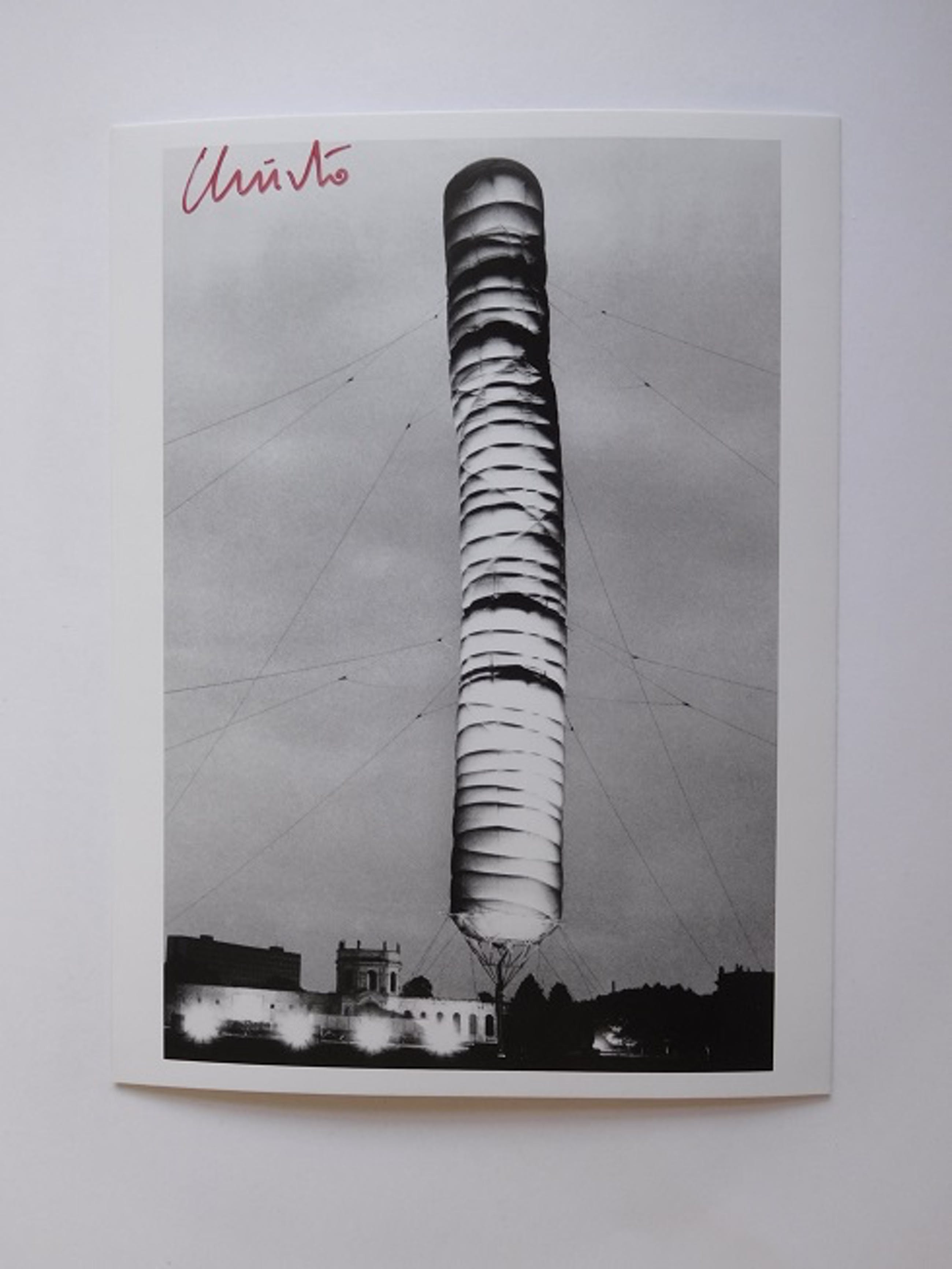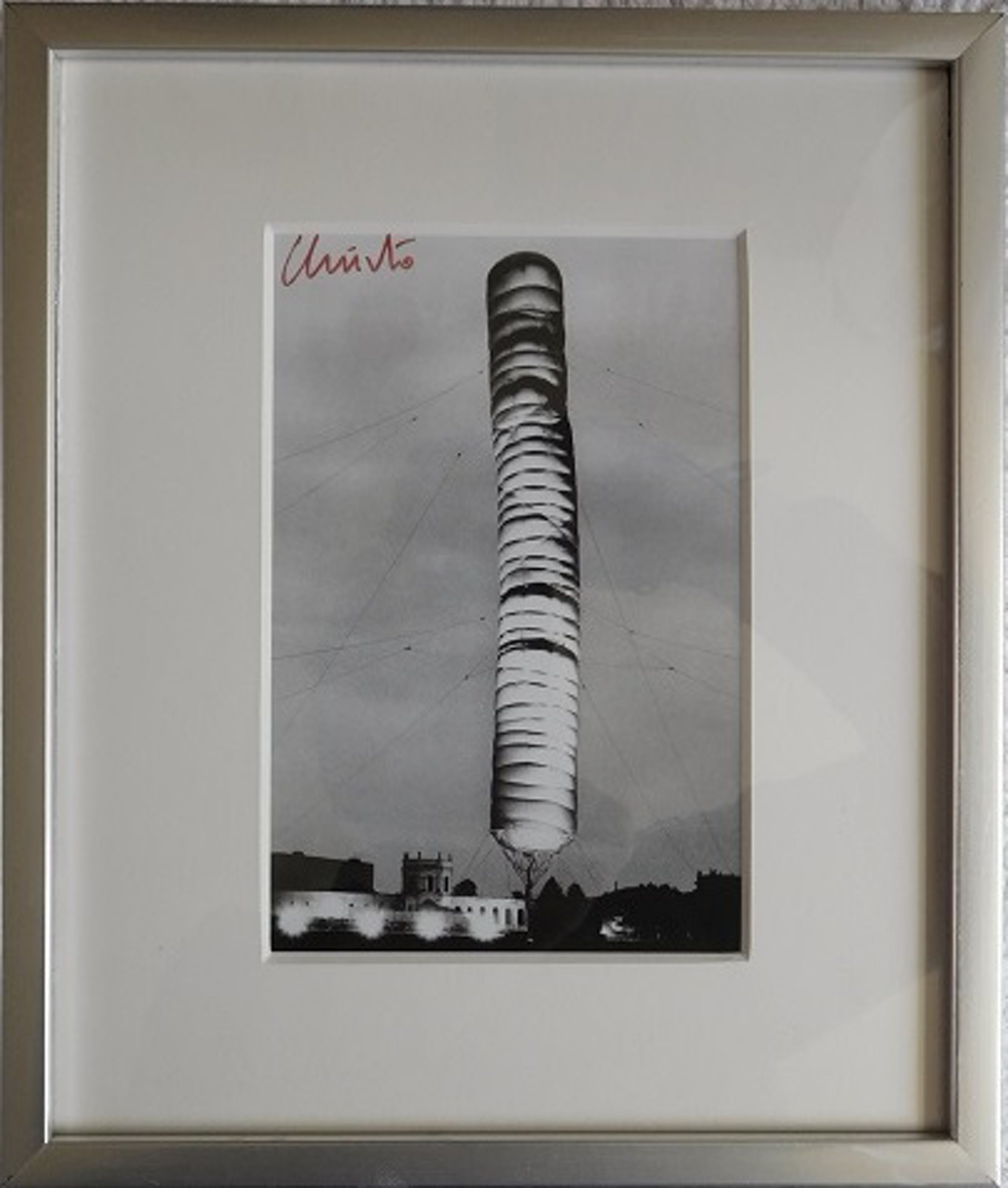 Van Christo (1935) een ingelijste gesigneerde postkaart van "Project Documenta IV Kassel" . Formaat inclusief houten zilverkleurige lijst is 26 x 22 cm.
