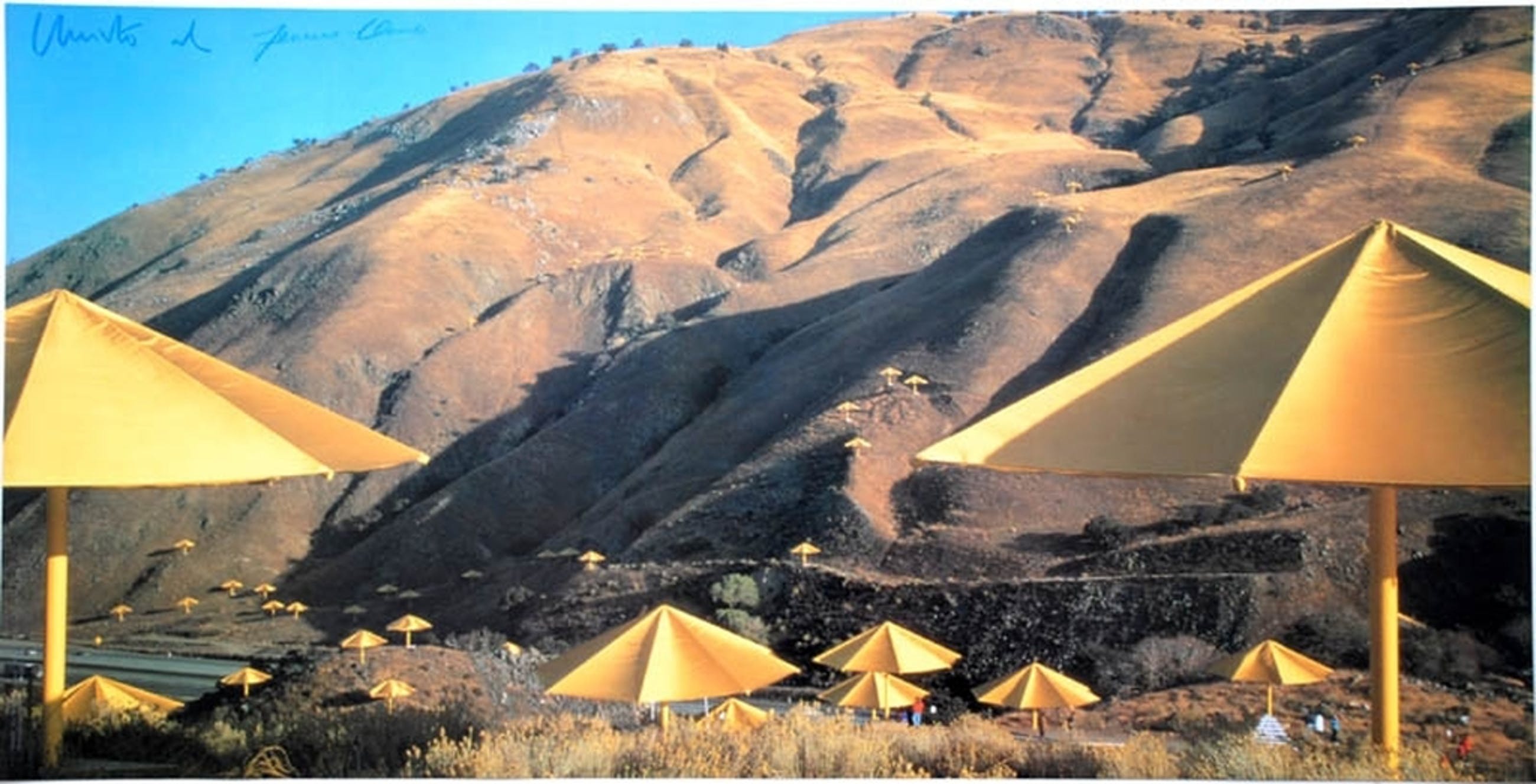 De foto toont één van de landschappen die de Christo´s tussen 1991 en 1994 in Japan en in de Verenigde Staten hebben volgeplant met reusachtige, fel gekleurde paraplu´s. De foto werd in 1991 ook weer door Wolfgang Volz genomen. Het blad is in zeer goede staat. Het is langwerpig: 50 x 99 cm.