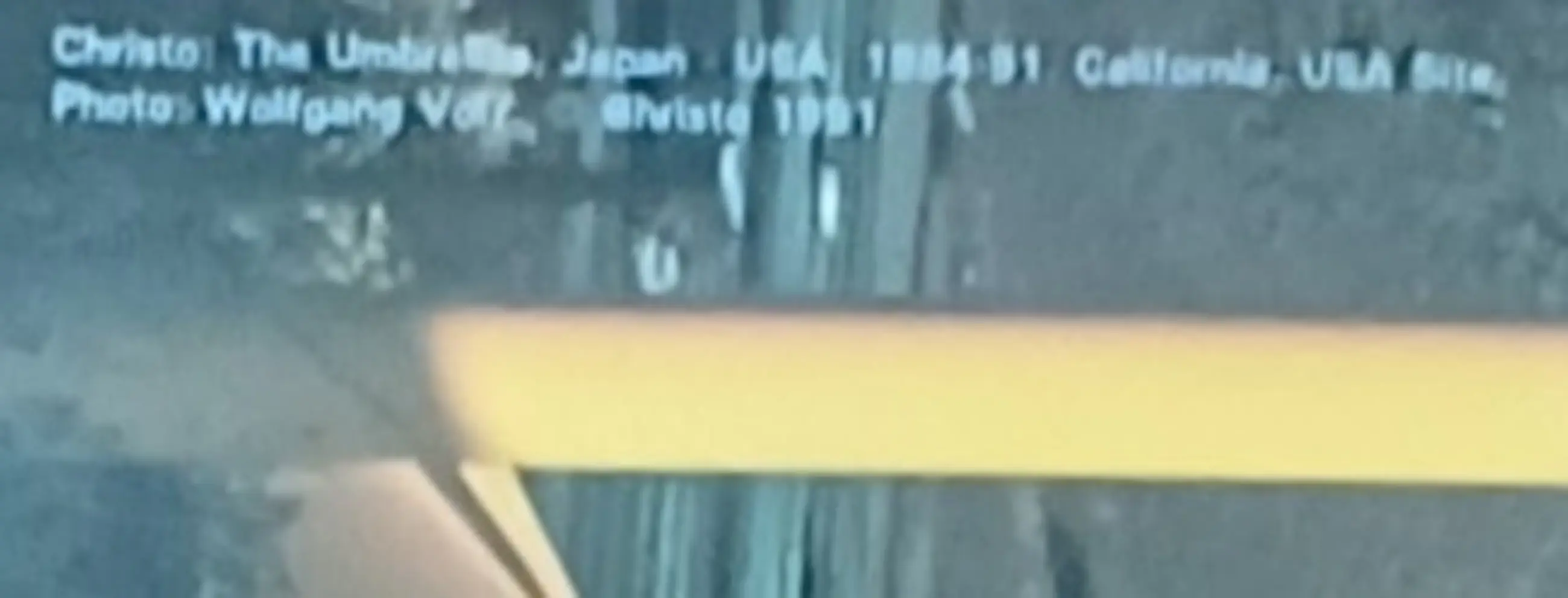 De foto die we hier aanbieden toont een landschap in Californie, dat Christo en zijn echtgenote Jeanne-Claude in 1991 een nieuwe aanblik gaven door er maar liefst 1760 grote, gele regenschermen van 6 m hoog en meer dan 8 m diameter neer te poten. Dit was eigenlijk maar één kant van een dubbel project: tegelijk deden zij namelijk in Japan net hetzelfde, waar zij 1340 (blauwe) regenschermen in het landschap lieten planten. Het hele project kostte 26 miljoen USD.