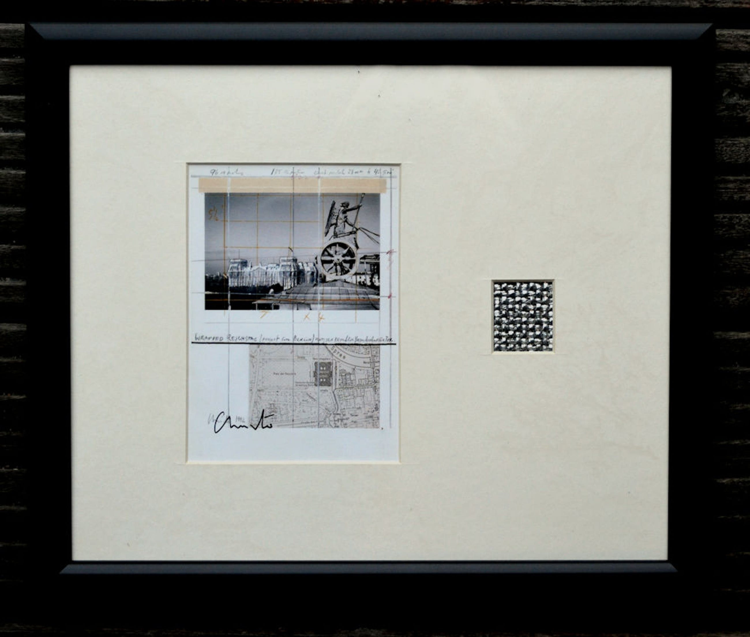 super Collage van The Wrapped Reichstag van Christo and Jeanne Claude een offset postkaart; handgesigneerdeen stukje origineel stof van het project ( wij gebruiken GEEN promotiemateriaal maar alleen stof dat effectief is gebruikt bij het project )!Nieuw ingelijst in zwarte lijst met passe partout EN onbreekbaar plexi glas. De collage meet 33 X 28 cm wordt steeds zorgvuldig en aangetekend verstuurd