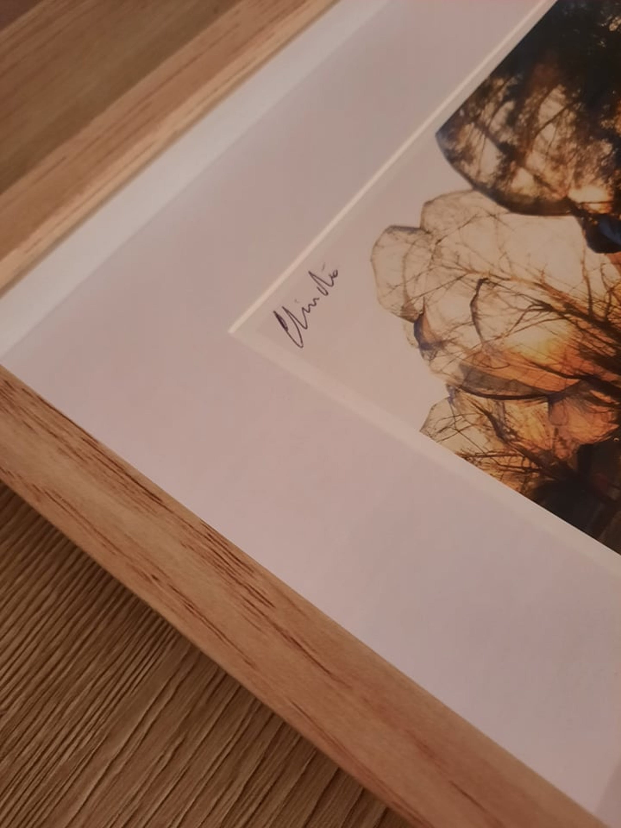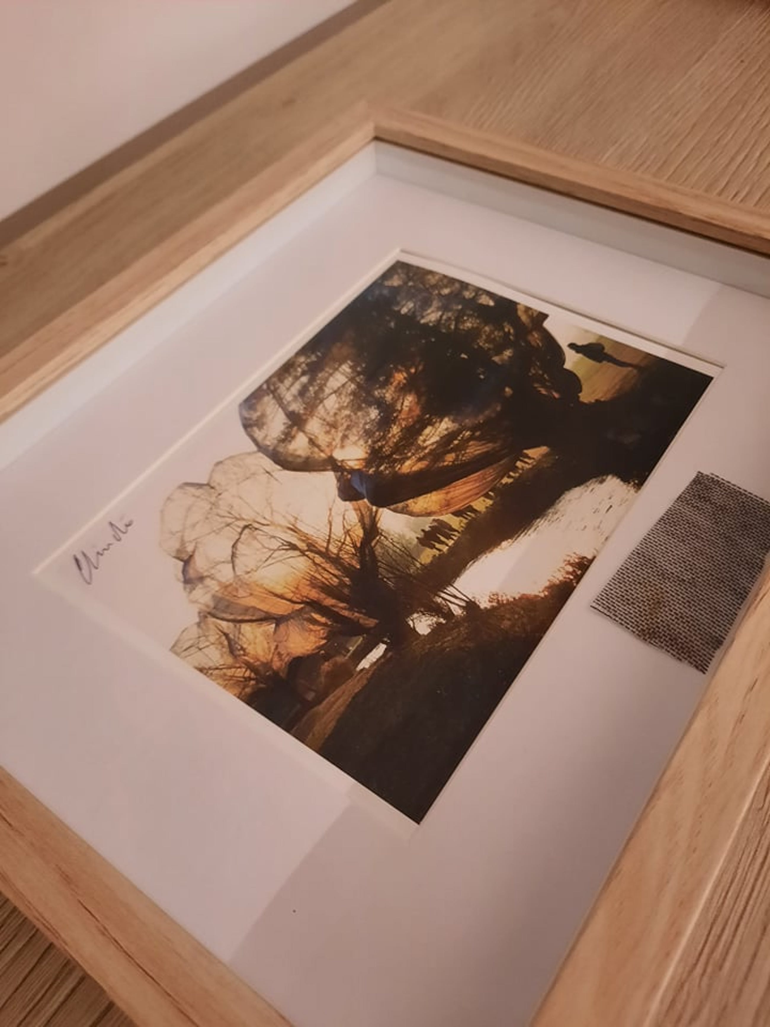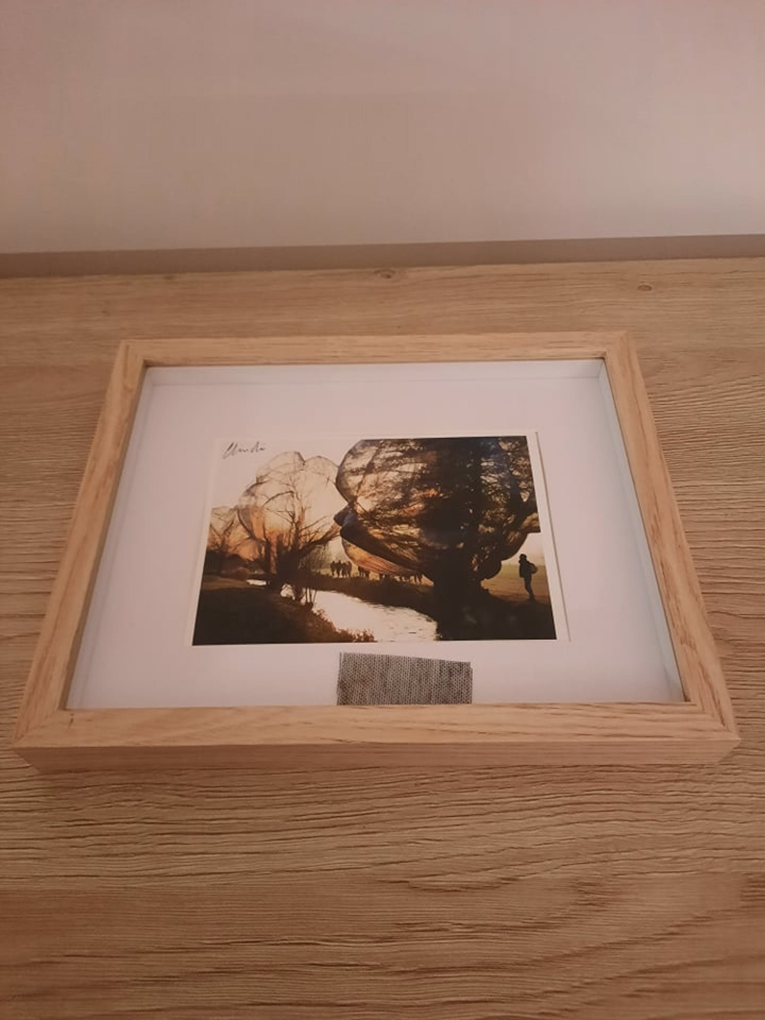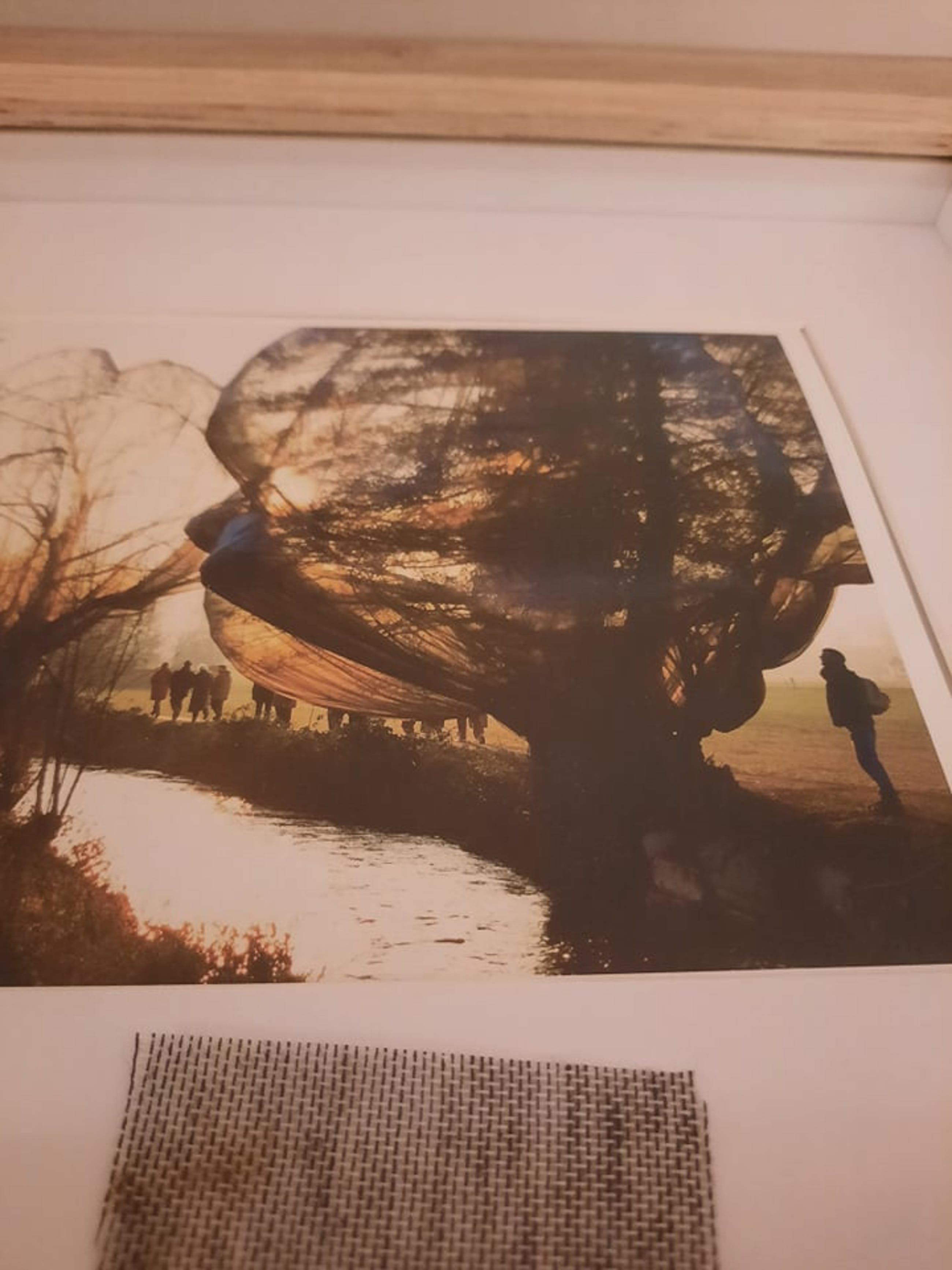 Deze artcard werd gesigneerd door Christo en is inclusief een een origineel stukje stof. Het werk zelf is 17X12, kader is 28X23.