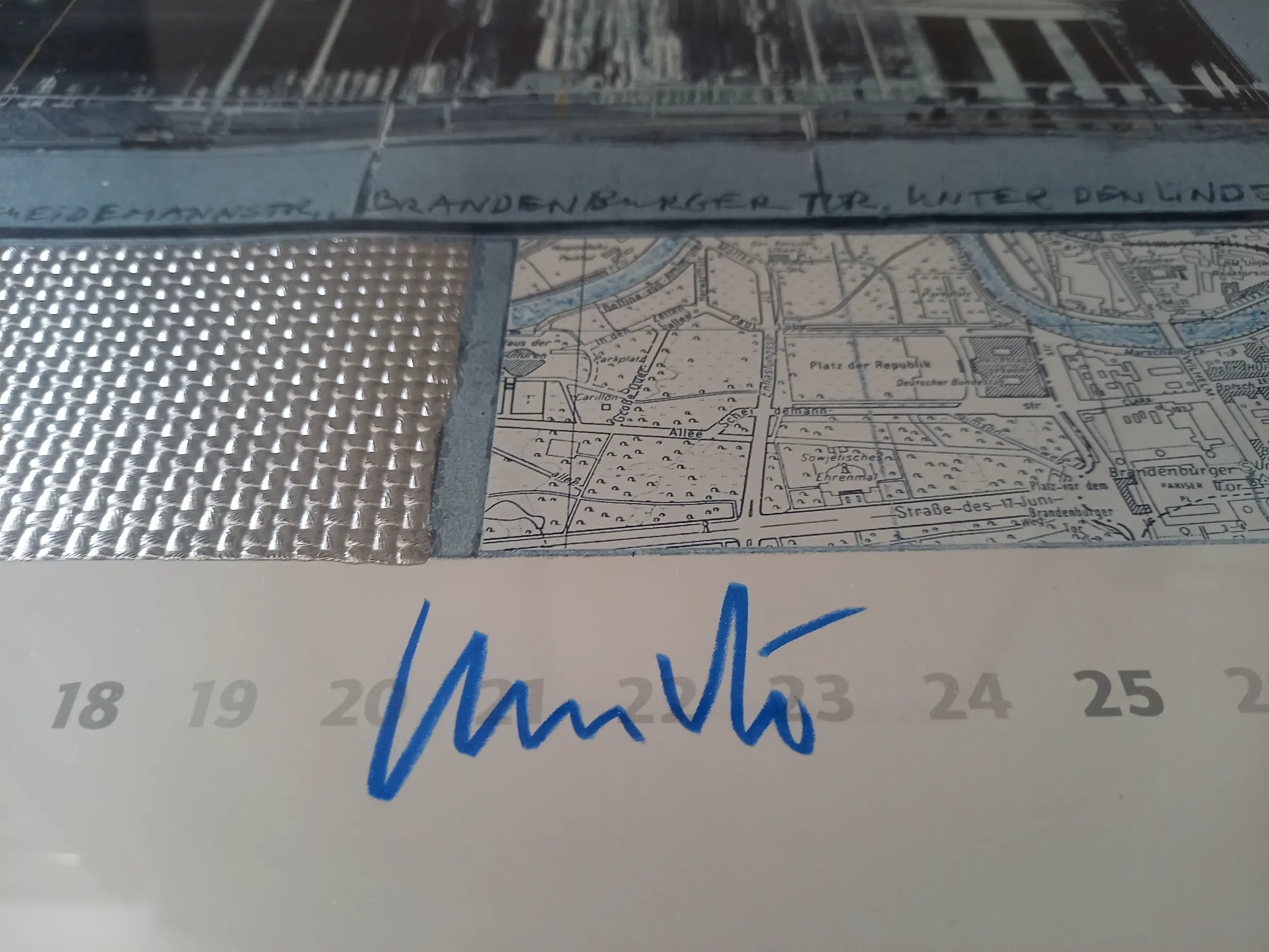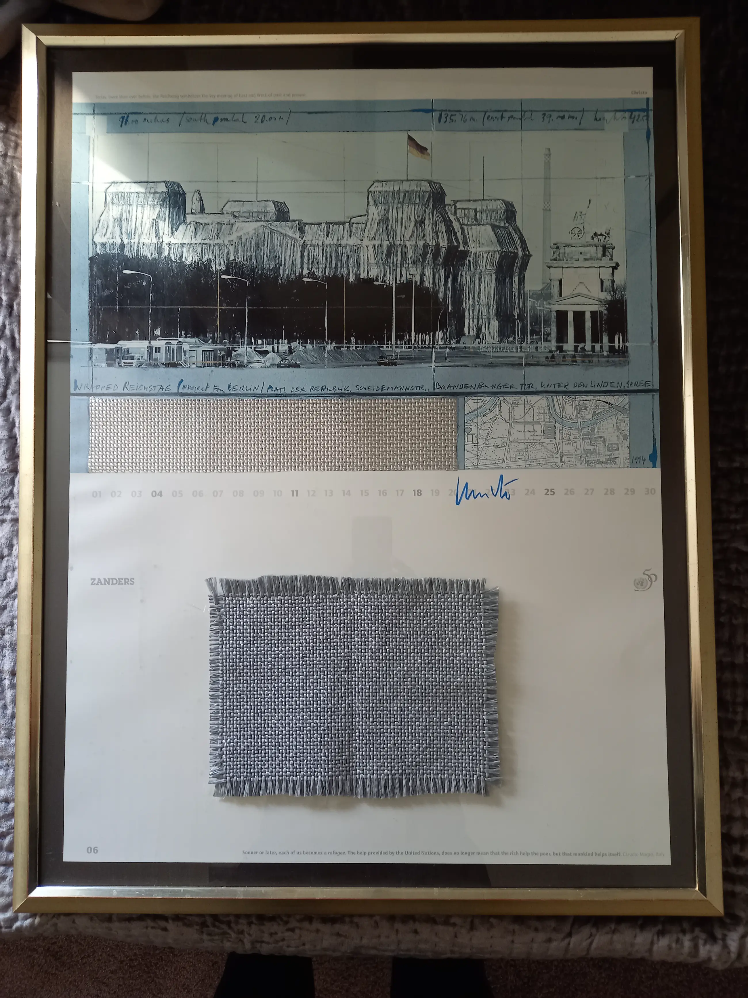 Een prachtig kalenderblad Zanders in galerij met reliëfdruk van hoge kwaliteit gesigneerd door Christo en met een groot stuk stof (18 x 25 cm) van de actie om de Reichstag in Berlijn te bedekken