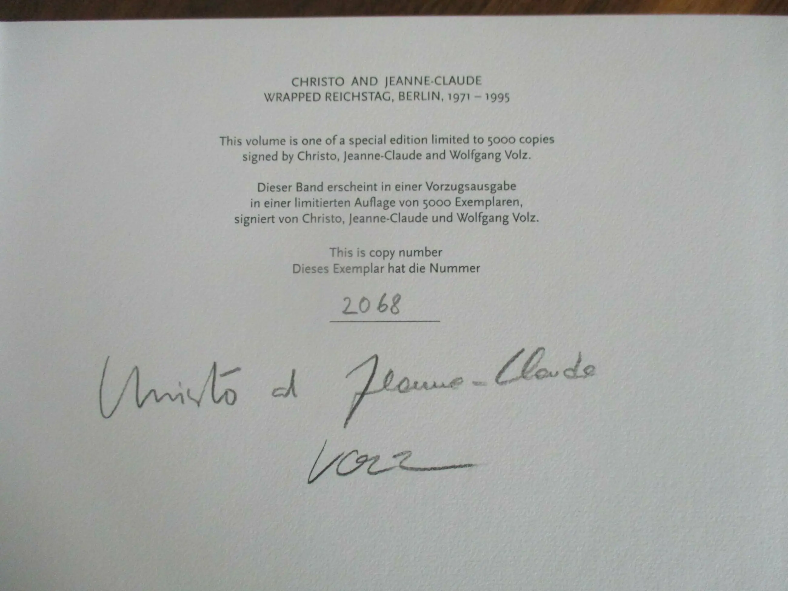 Gelimiteerde oplage van 5.000 exemplaren, elk genummerd en gesigneerd door Christo, Jeanne-Claude en Wolfgang Volz. Exclusief ontwerp in zilverkleurige linnen omslag en kartonnen beschermhoes in fotodesign. Fotoboek met 696 pagina's en een stuk van het originele materiaal in de maat 20 x 20 cm gestoken in het kartonnen deksel aan de achterkant.