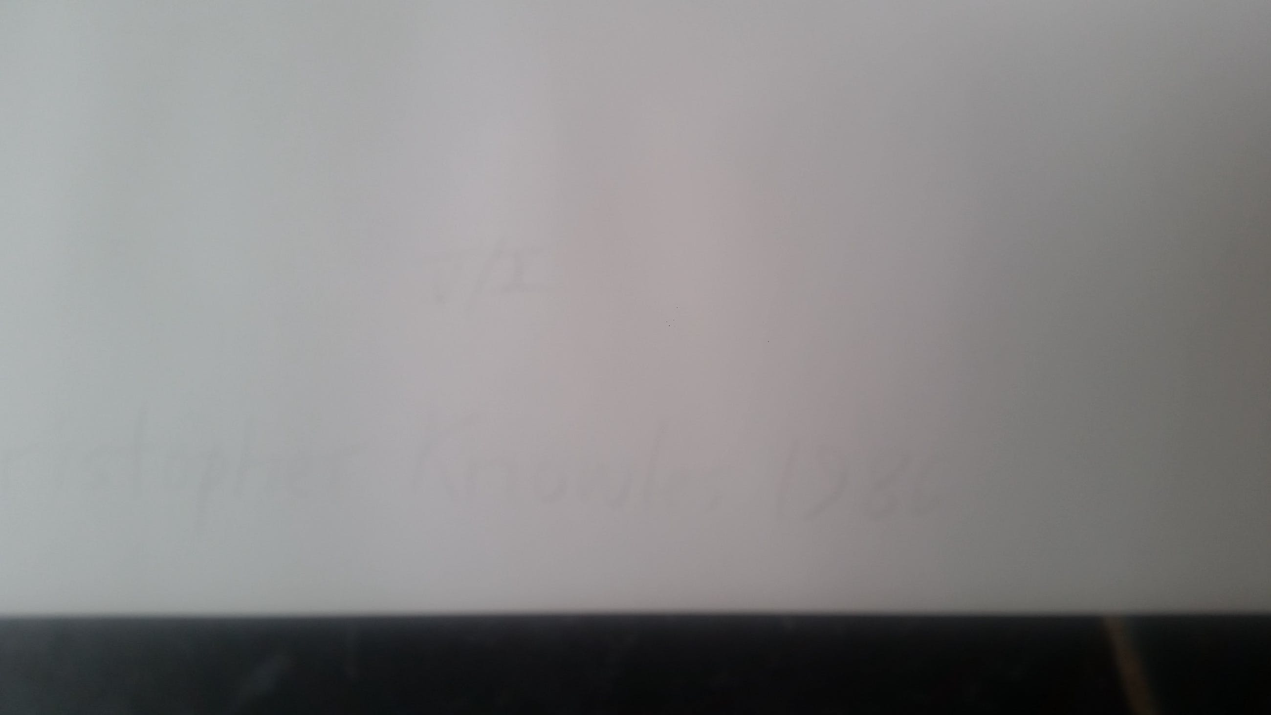 Christopher Knowles is een Amerikaanse schilder en dichter. Zijn gedichten zijn o.a. gebruikt door Robert Wilson voor de uitvoering van Einstein on the beach van Philip Glass. Hij deemt ook deel aann de films van Peter Green Away. Uit de map: Typings Deze map heeft een oplage van 30 ex. Uitgever; Bebert. dit is nummer V/X. exemplaar voor de medewerkers. Handtekening is zeer moeilijk te fotograveren. met dun potlood op de achterkant; Christopher Knowles. 1986 De afbeeldingen zijn met een typemachine gemaakt n.a.v. zijn tentoonstelling in Boijmans van Beuningen