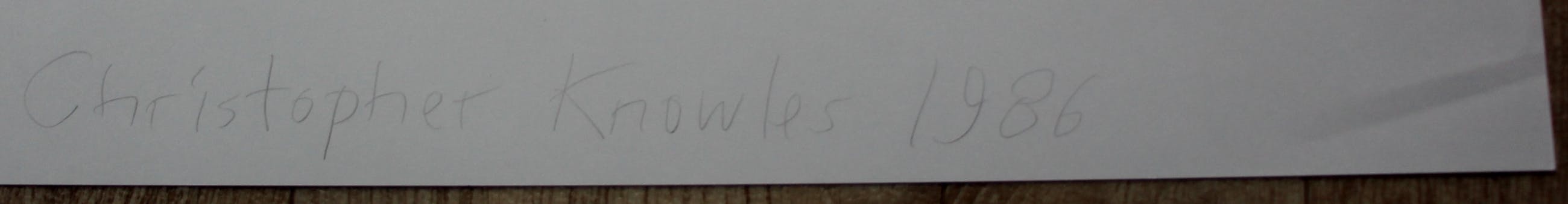 Zeefdruk van Christopher Knowles. Hij is een Amerikaanse schilder en dichter. Zijn gedichten zijn o.a. gebruikt door Robert Wilson voor Einstein on the beach van Philip Glass. Hij neemt ook deel aan de filsm van Peter Green Away. Jaar: 1986. Nummer: 40/45. Afmetingen blad: H65 x b50 cm. Afmetingen voorstelling: H52 x B9cm. Uit de map; Typings. Uitgever; Bebert Handtekening is zeer moeilijk te fotograveren. Met dun potlood op de achterkant; Christopher Knowles 1986 De afbeeldingen zijn met een typemachine gemaakt n.a.v. zijn tentoonstelling in Museum Boijmans van Beuningen. Het werk is in goede staat. Er zit een kleine vouw in de hoek links onderin.(zie foto)