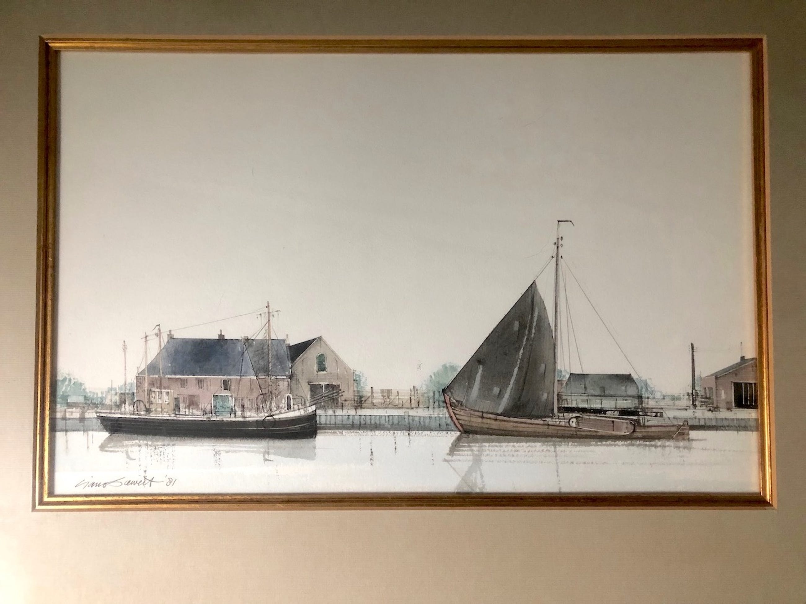 JC 663 M Ciano Siewert Aangemeerde boten in een vaart Aquarel 1981 29 x 45 cm 61 x 71 cm Prachtig ingelijst