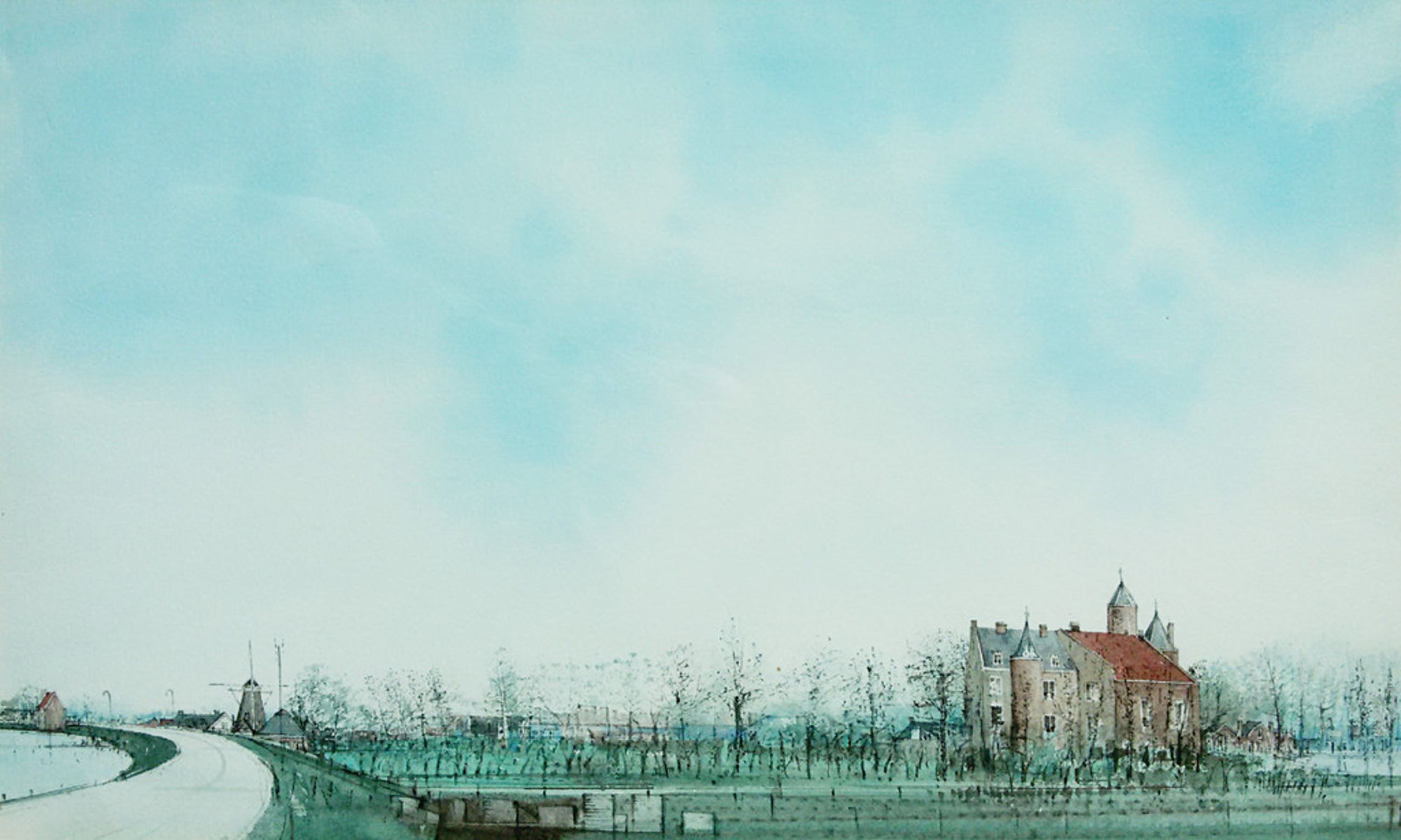 Prachtige aquarel van Ciano Siewert, voorstellende het landschap rond kasteel Waardenburg aan de oevers van de Waal. Mooi ingelijst, achter glas en met passe-partout. Deze aquarel is het origineel op basis waarvan een litho is gedrukt in een oplage van 250.
