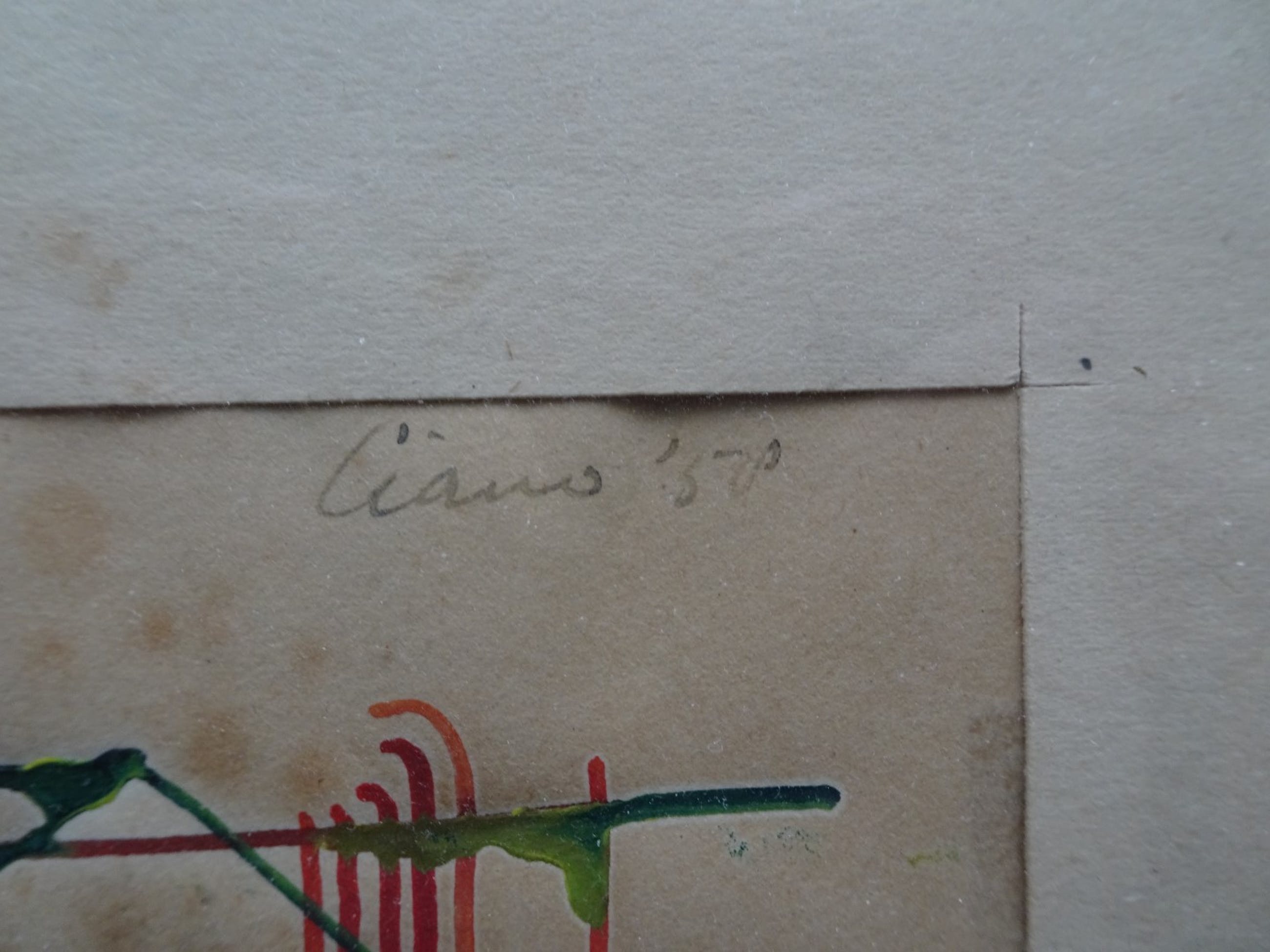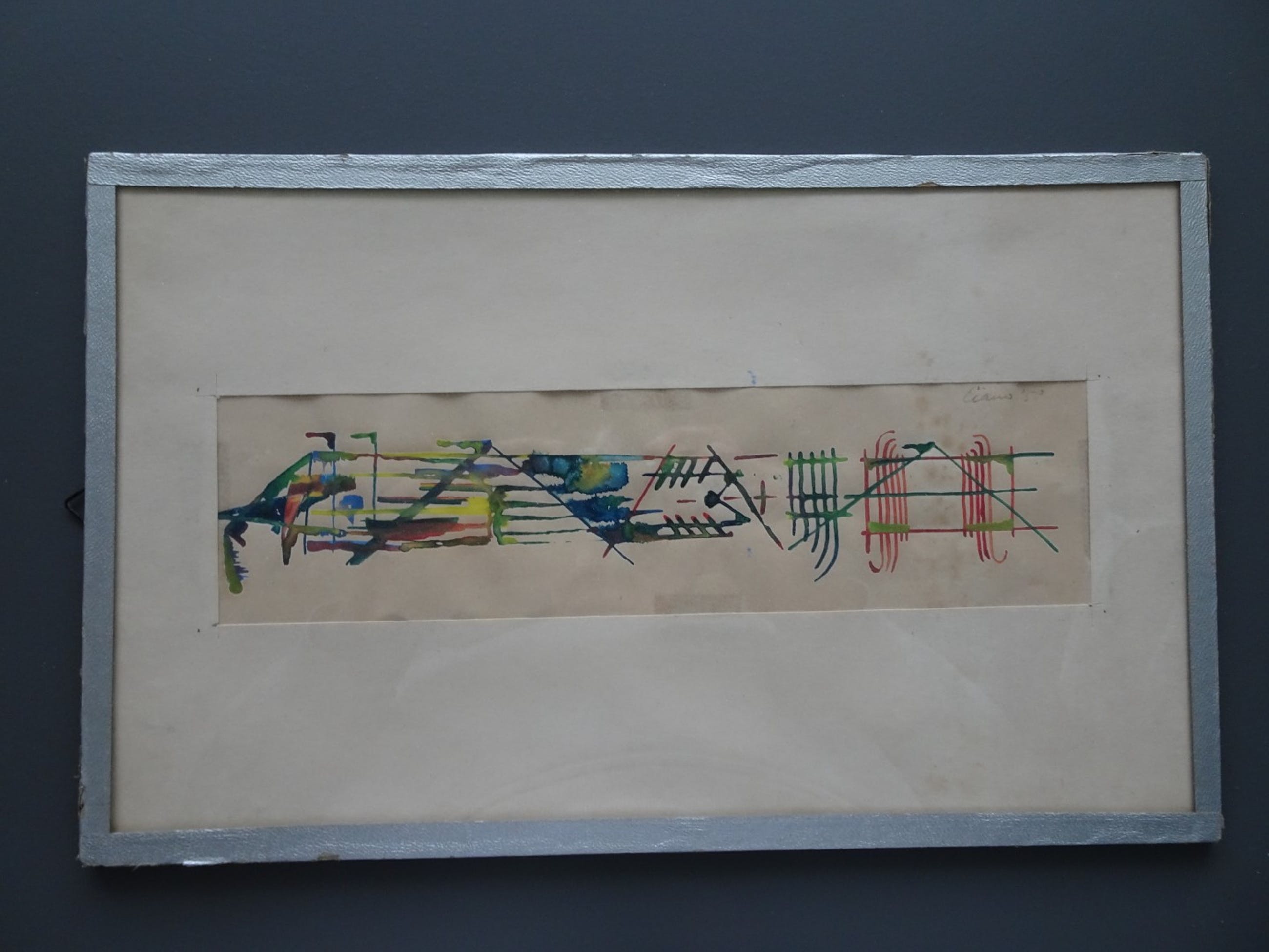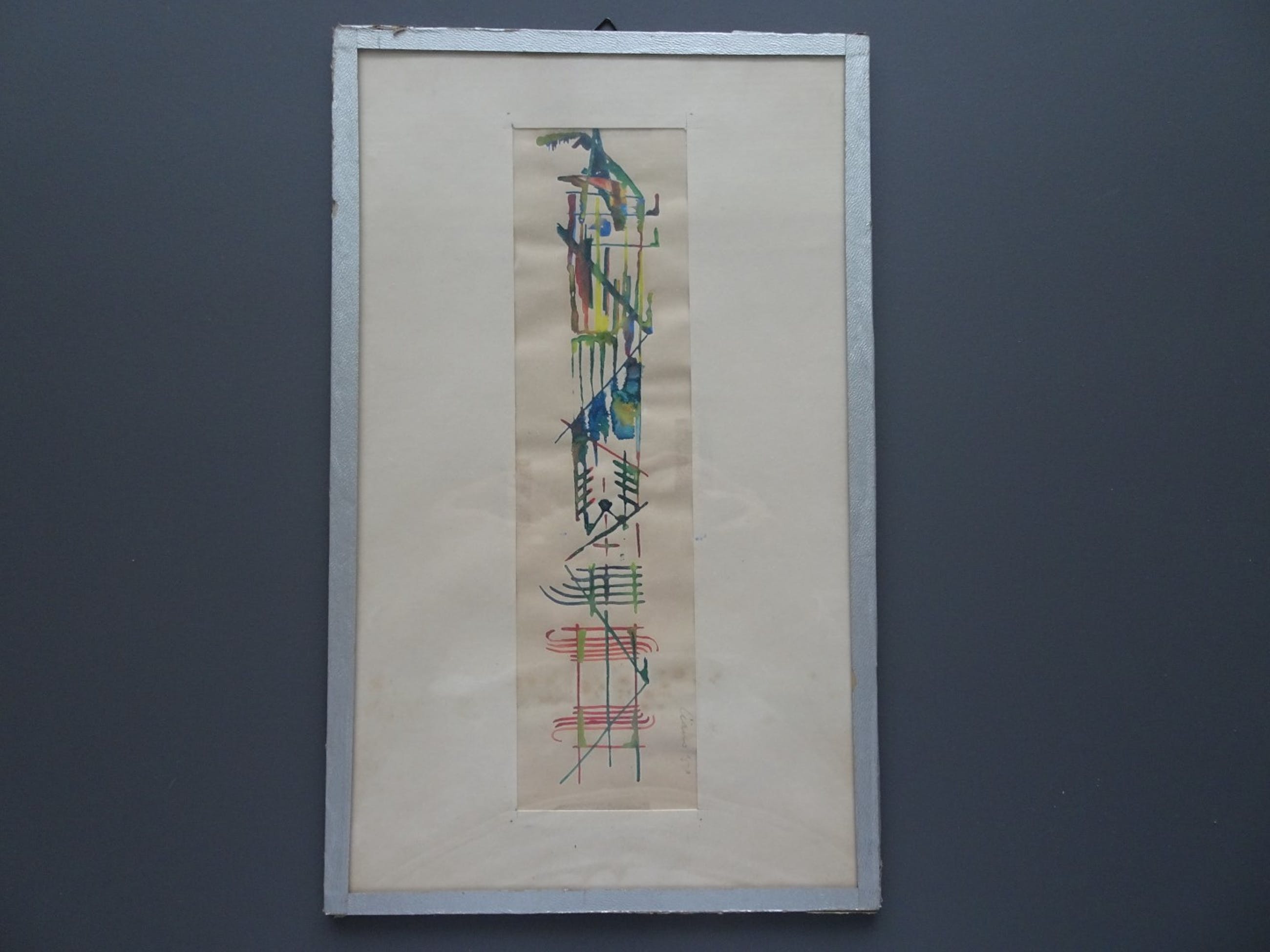 Aquarel van Ciano Siewert uit zijn begintijd (1958). Hij was nog zoekende naar een eigen stijl. Van deze periode is weinig werk overgebleven. Lijst bestaat uit glas en afgeplakt met tape, achterkant karton. Basic inlijsting en tape enigszins beschadigd.