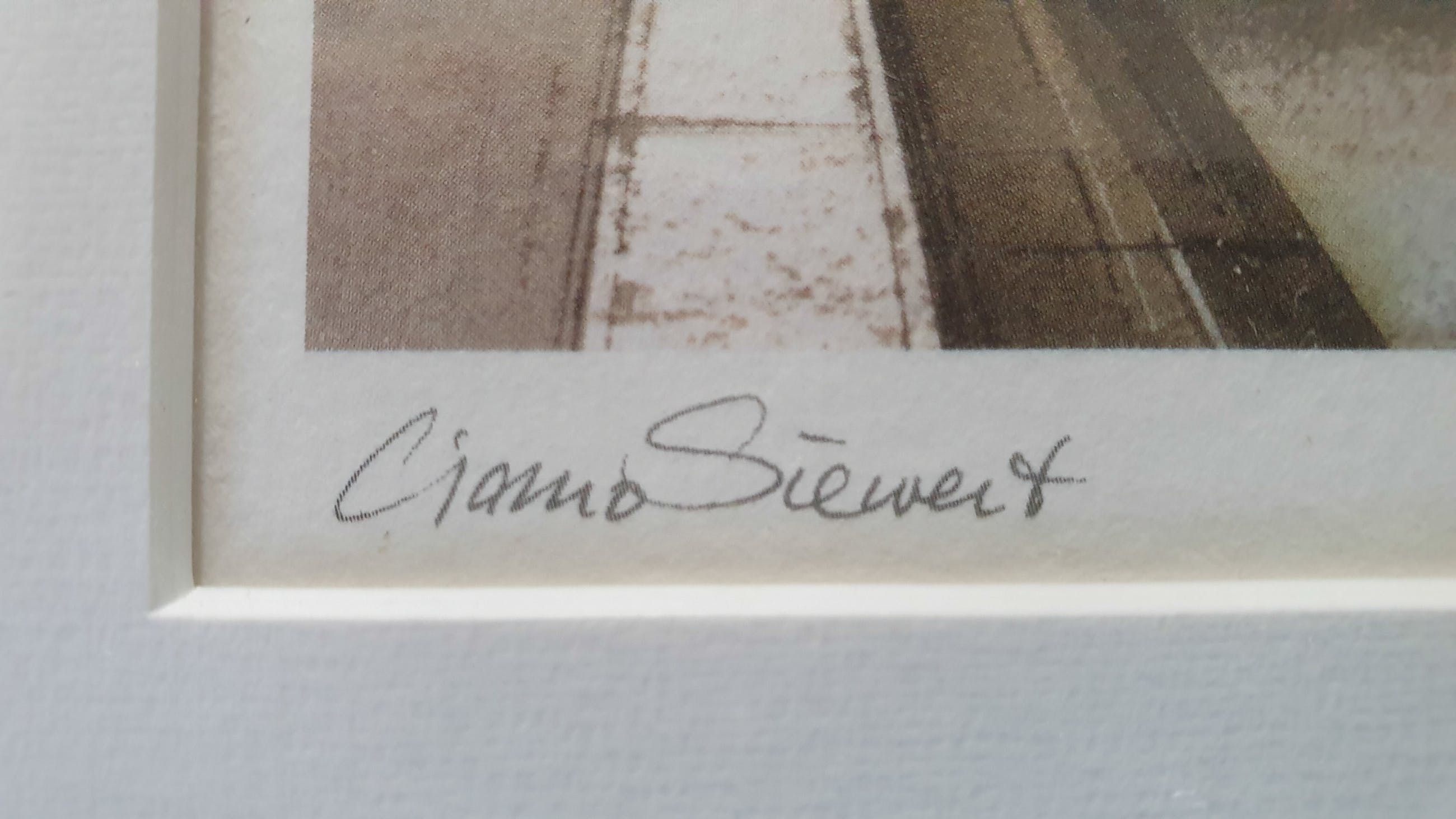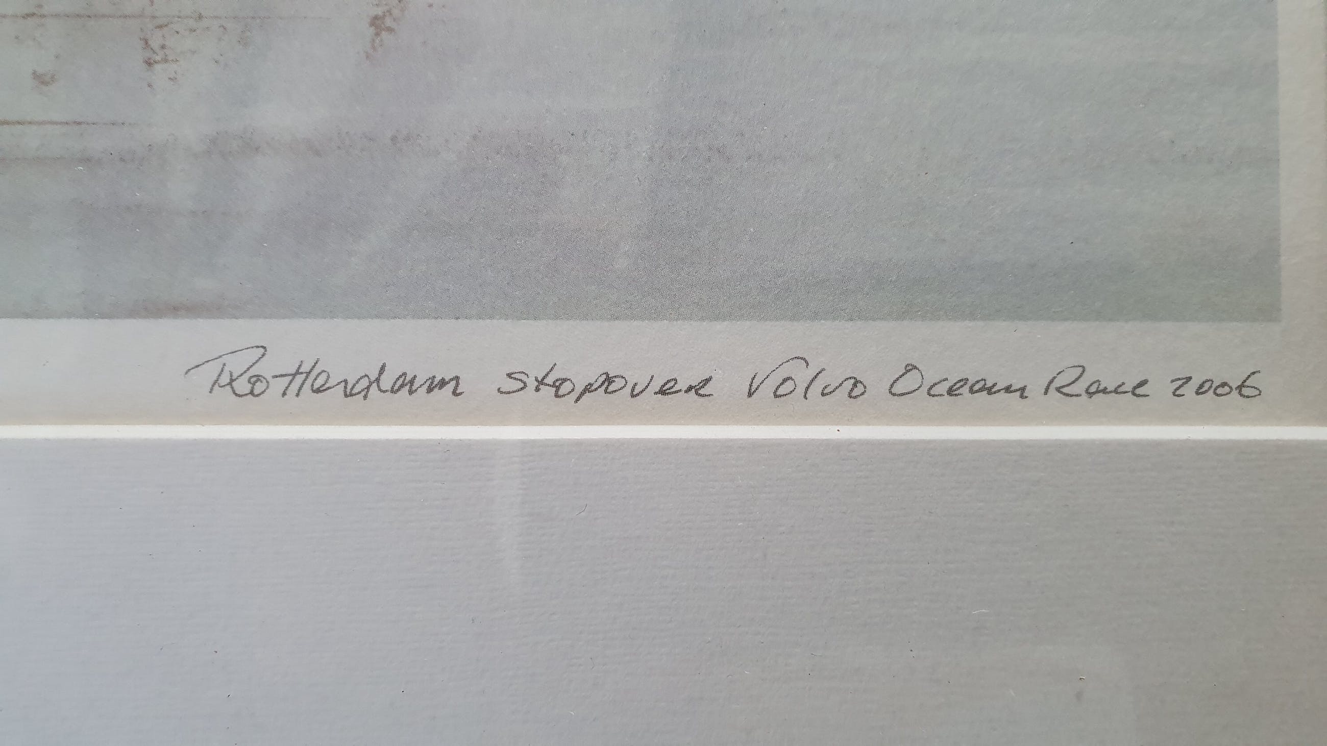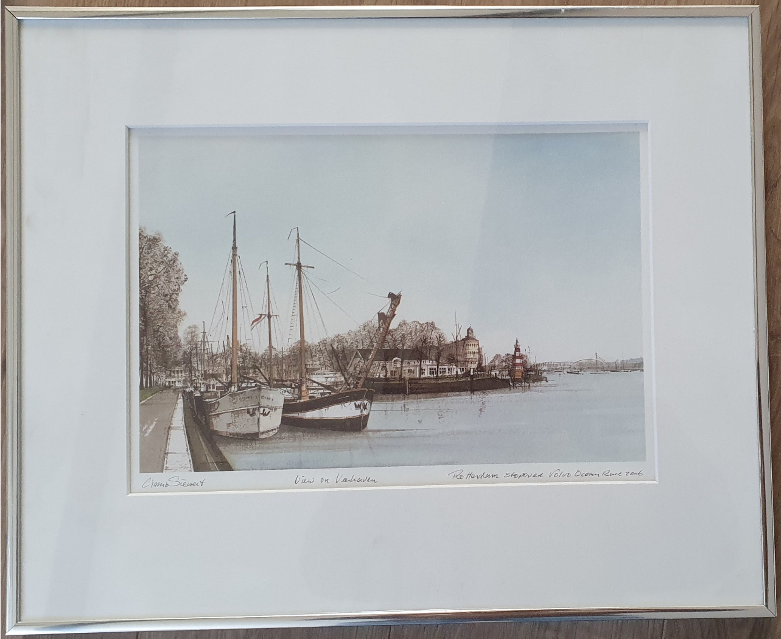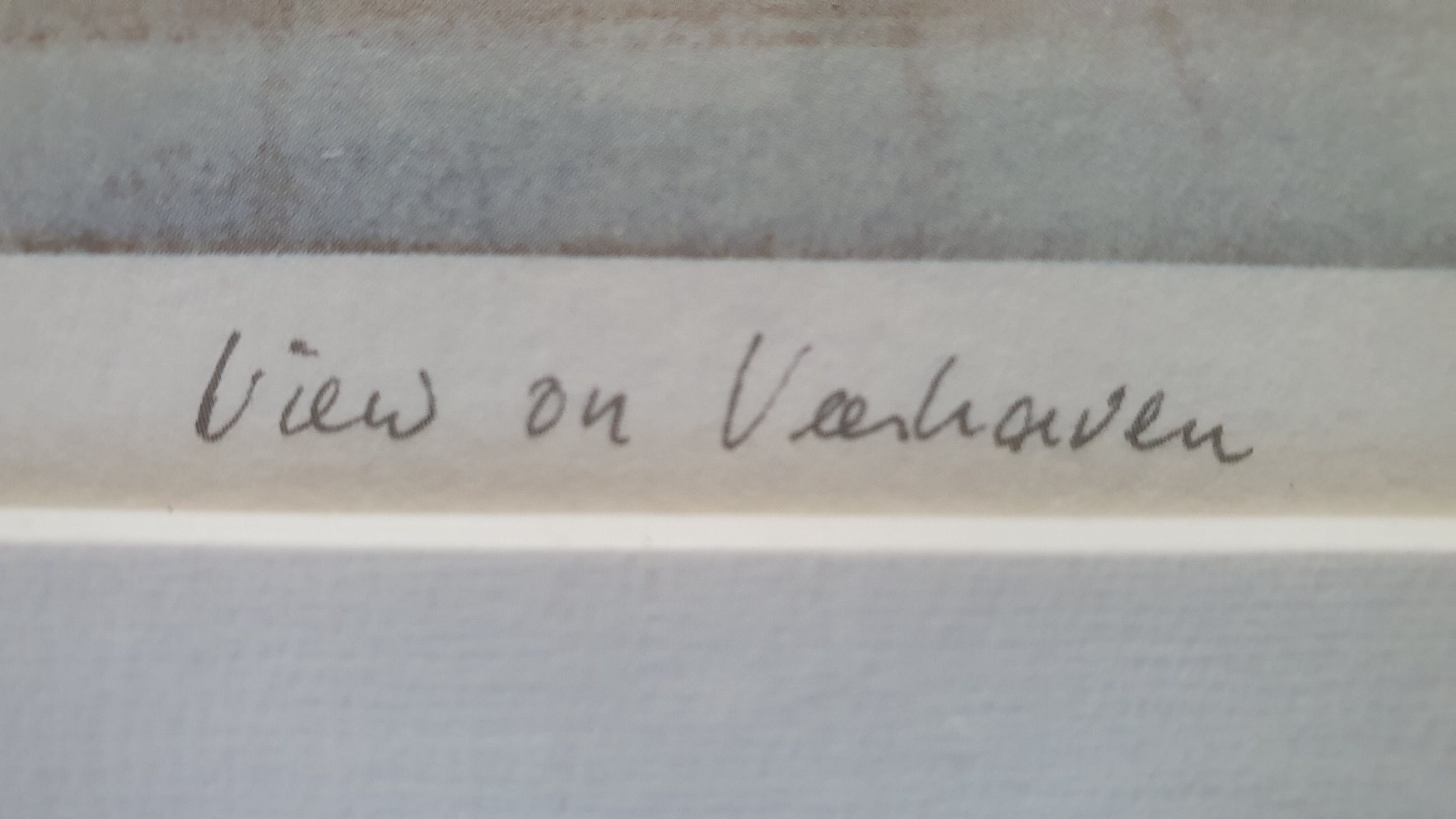 Gezicht op Veenhaven. Gesigneerde litho. In zilverkleurige lijst met passe partout.