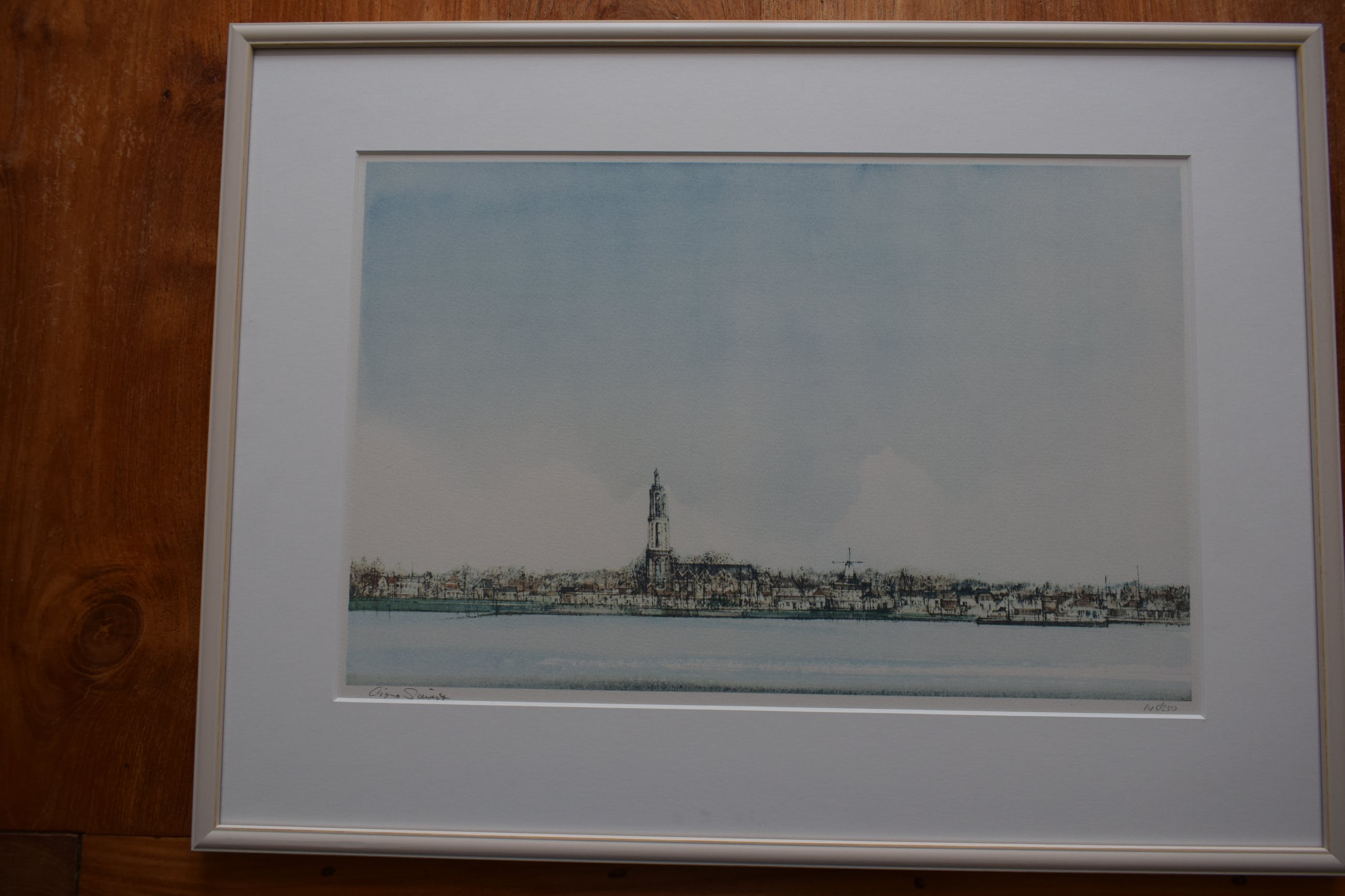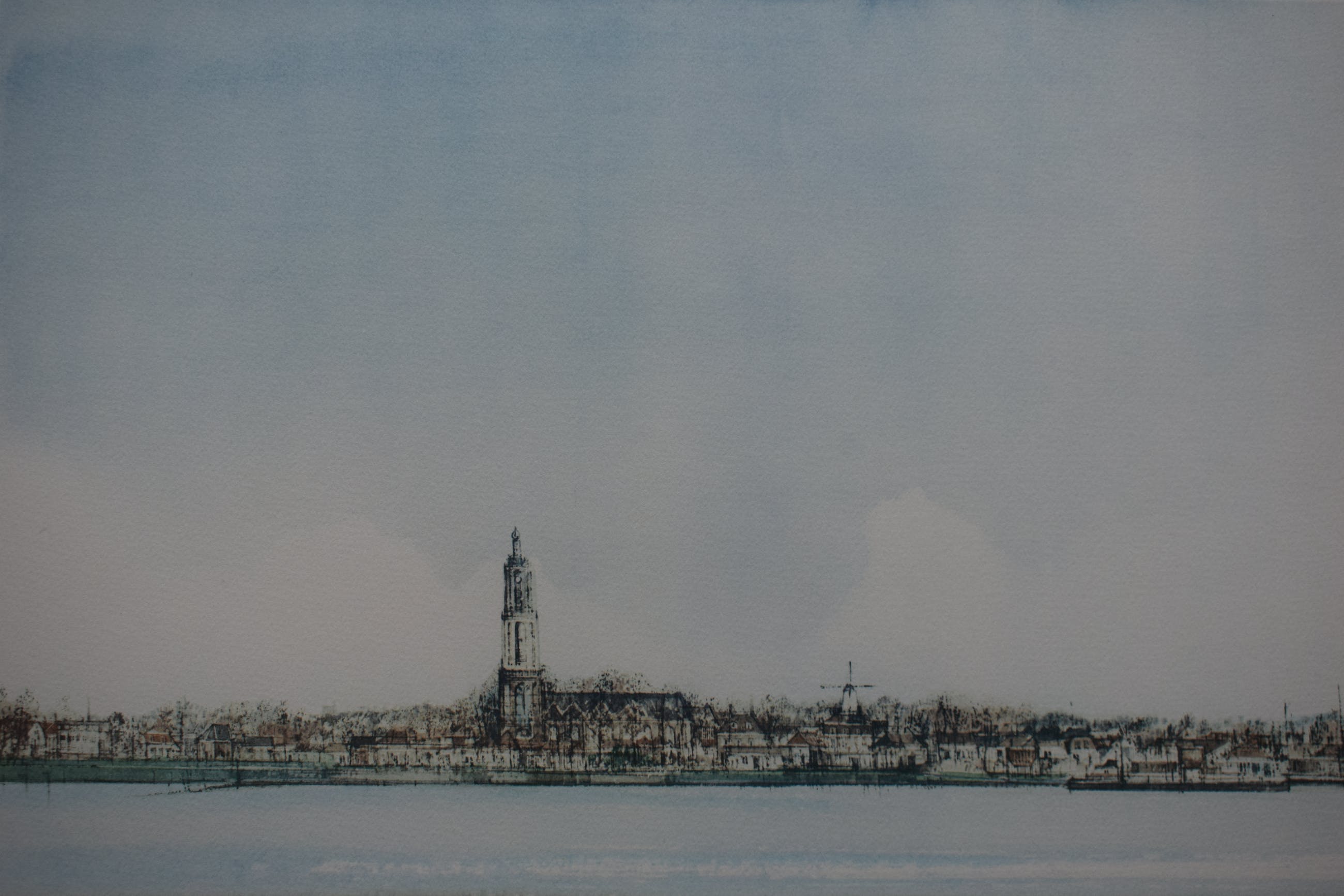 Mooie litho van een typisch Hollands stadsgezicht met een kerk, molen en een rivier waaraan het stadje gelegen is.