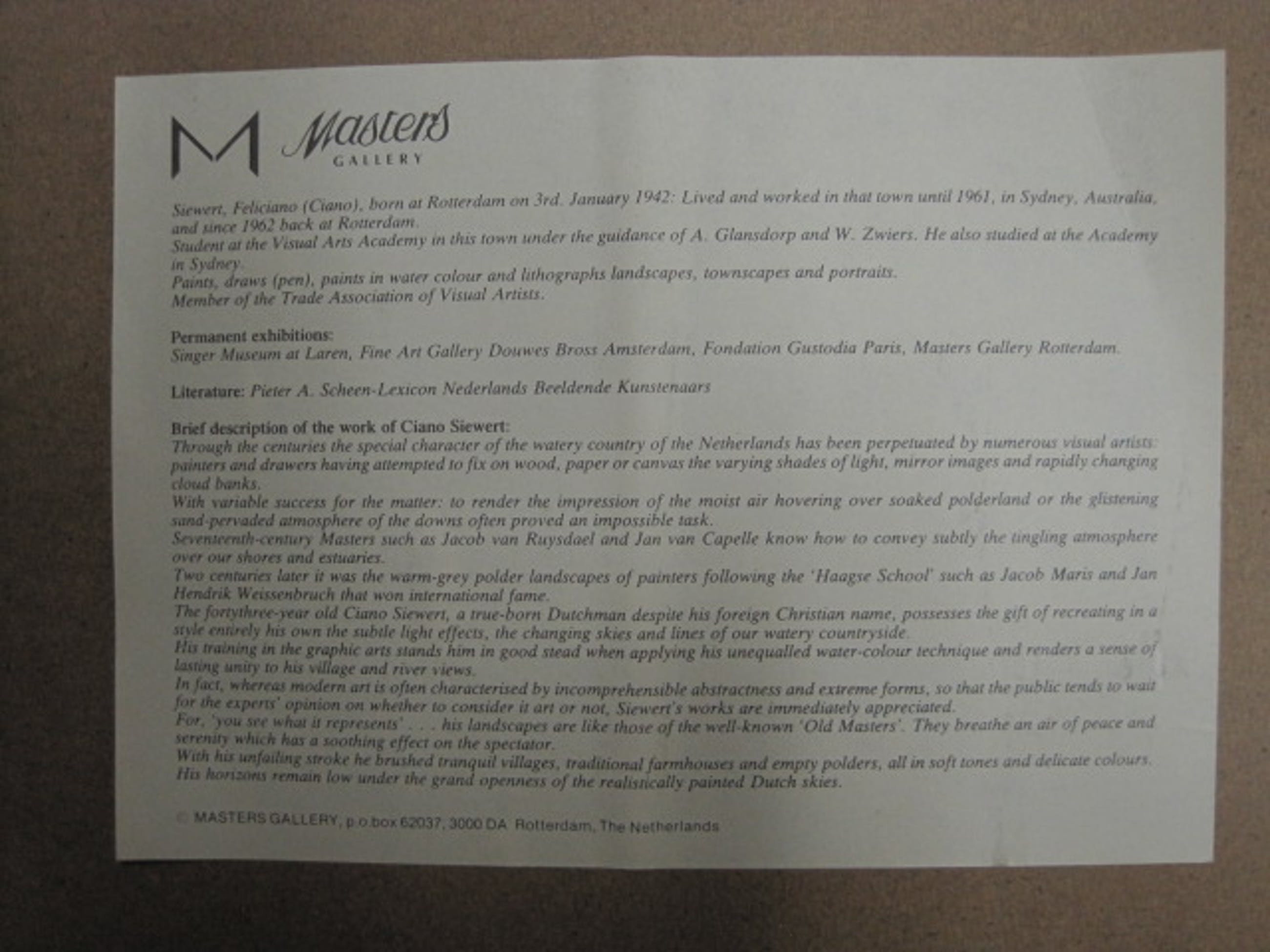 Ciano Siewert's werk valt op door de typisch Hollandse helderheid en virtuoze techniek waarmee hij zijn landschappen, stads- en havengezichten uitwerkt. Zijn fascinatie gaat uit naar zowel het oude als het nieuwe, waarbij het vooral gaat om de vorm van het onderwerp. Industriële vormen, de architectuur van huizen, gebouwen en schepen blijven hem boeien.