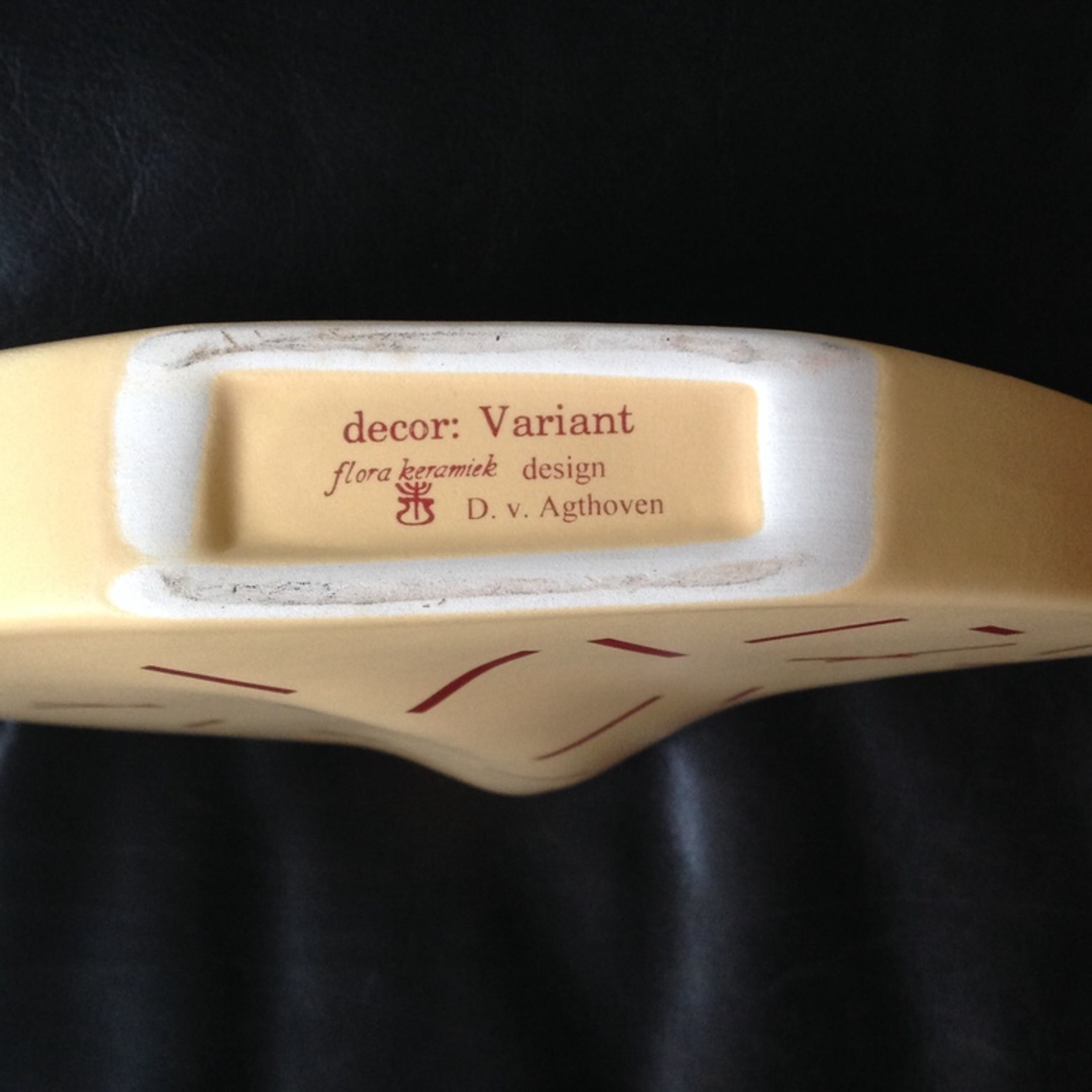 Kleur zachtgeel/zachtoker met een decoratie van steenrode lijnen.