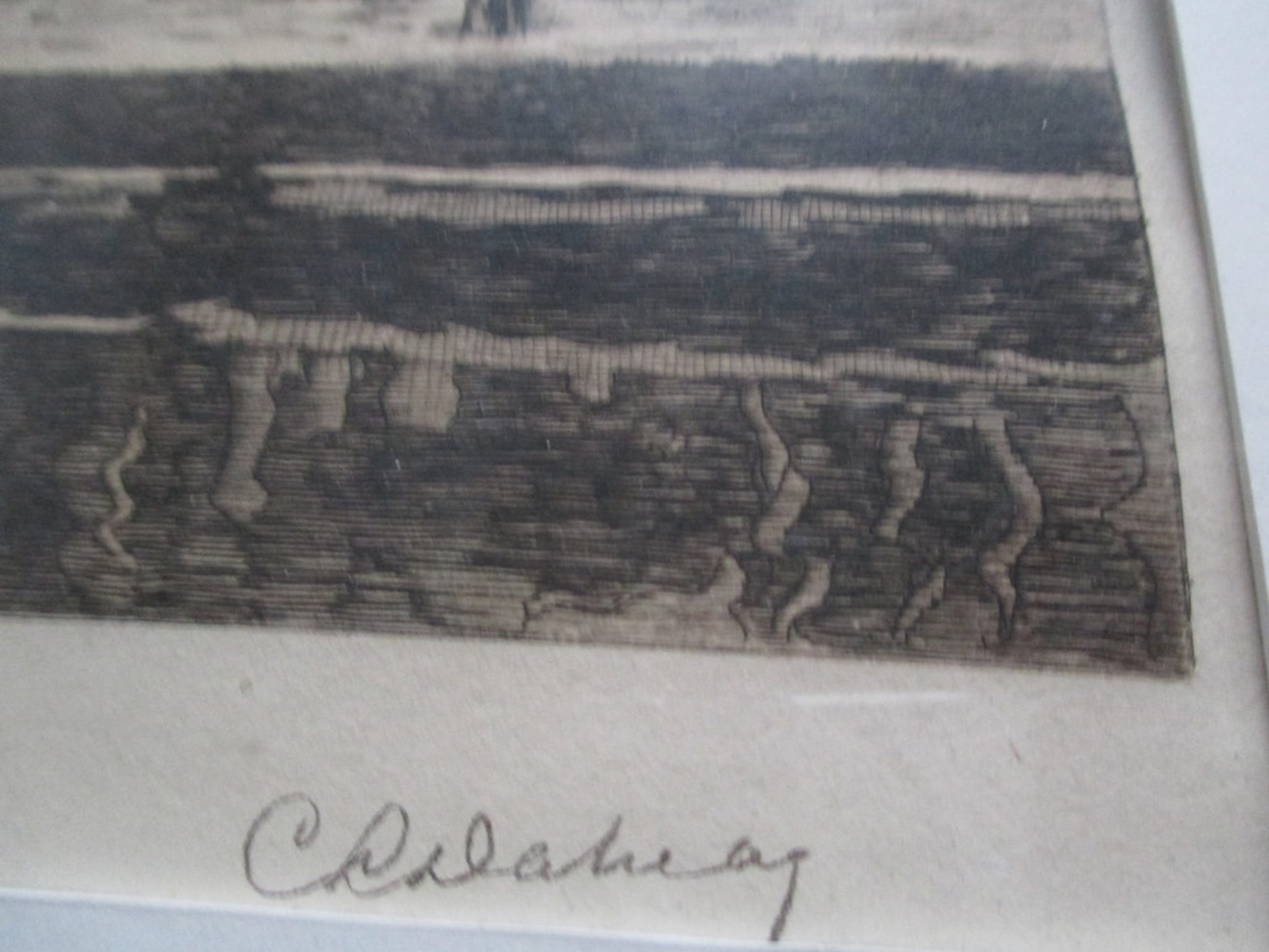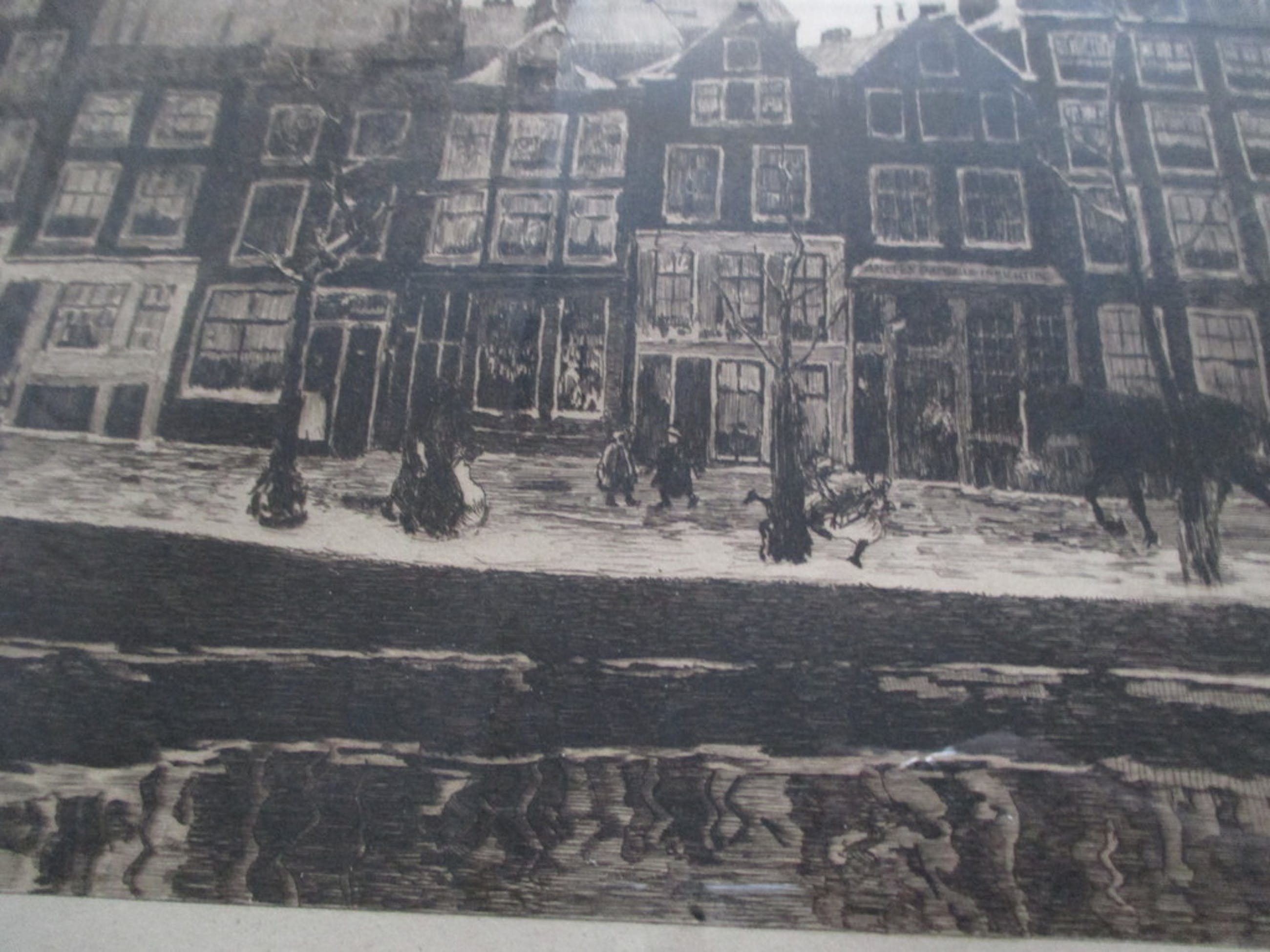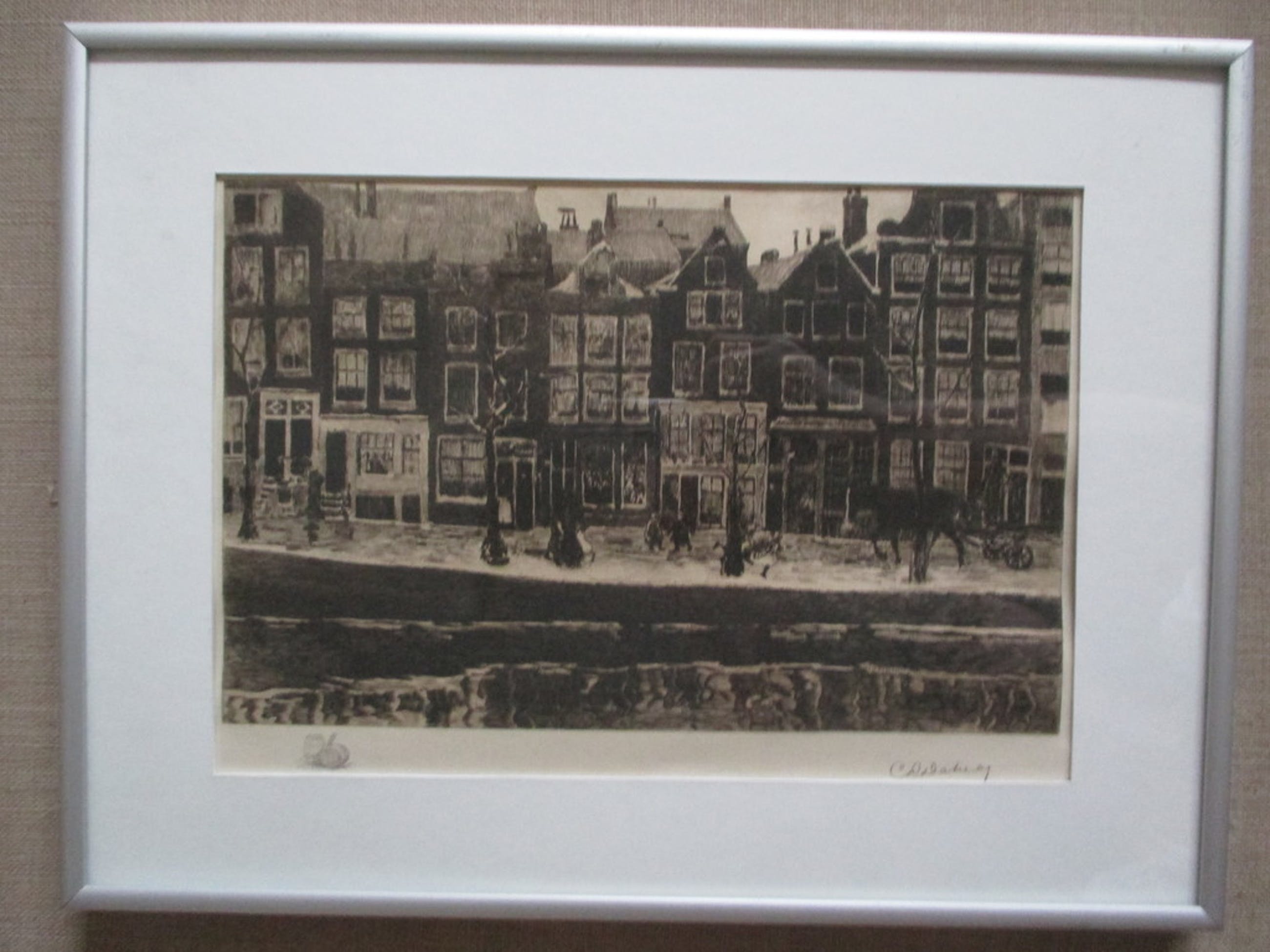 Ets van C.L. Dake sr., r.o gesigneerd in pen, voorstellende de Lauriersgracht nrs. 1-15 te Amsterdam. Ingelijst achter glas, afm. lijst 41x31, beeld 29,5x19 cm. Op de foto's is wat spiegeling door het glas, de detailfoto's zijn daarom wat schuin gefotografeerd.