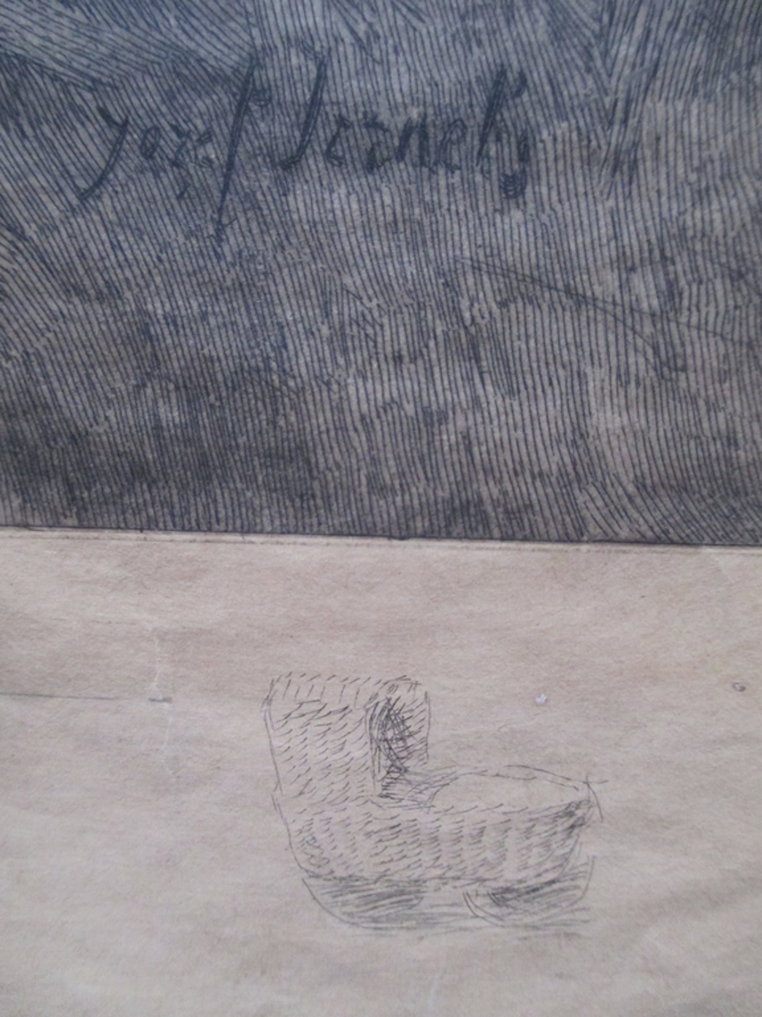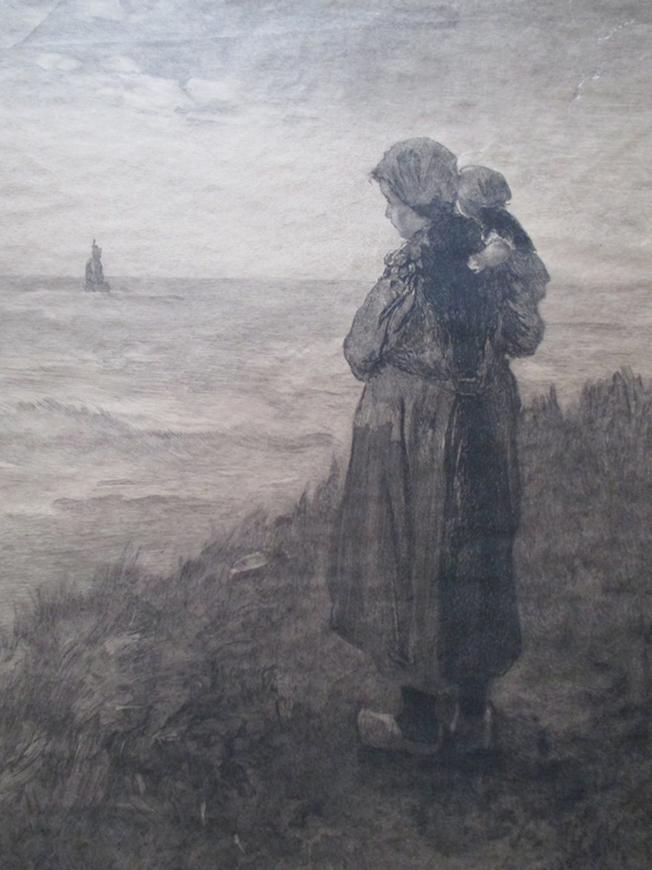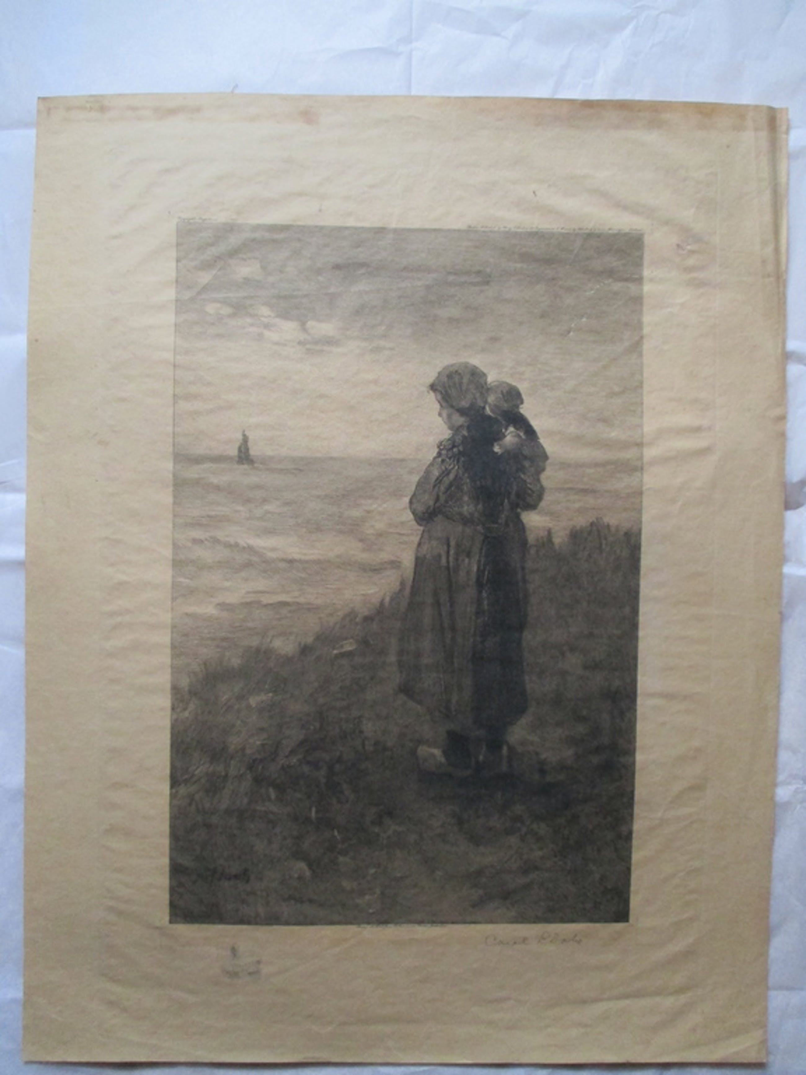 Ets op dun papier van Carel L. Dake (1857-1918) naar een schilderij van Jozef Israels, r.o gesigneerd in potlood, Afm. blad 43x55 cm, afm. beeld26,3x39,2. Rechtsboven in beeld zit een beschadiging, zie foto 6. Voor de algehele staat van het blad zie de foto's.
