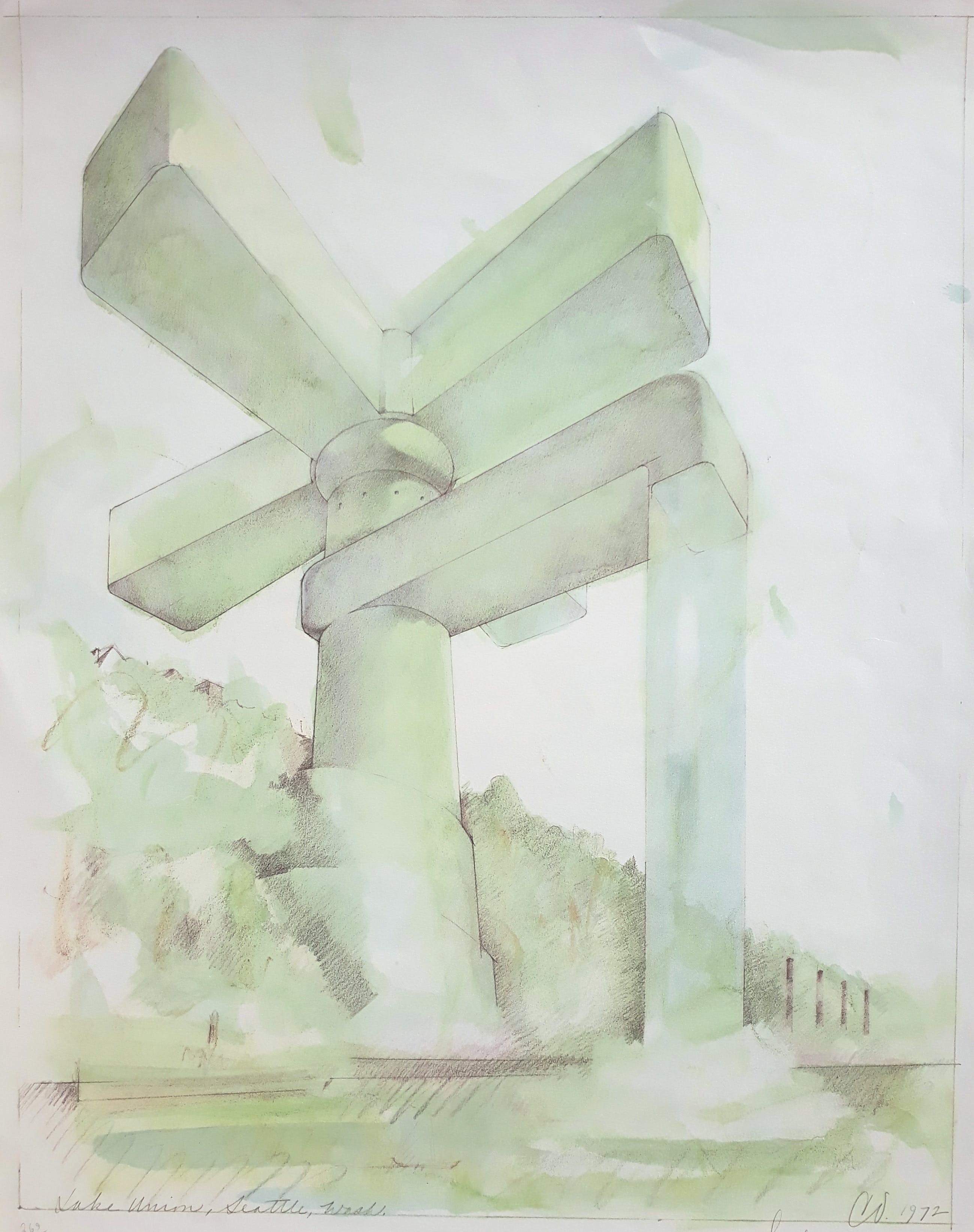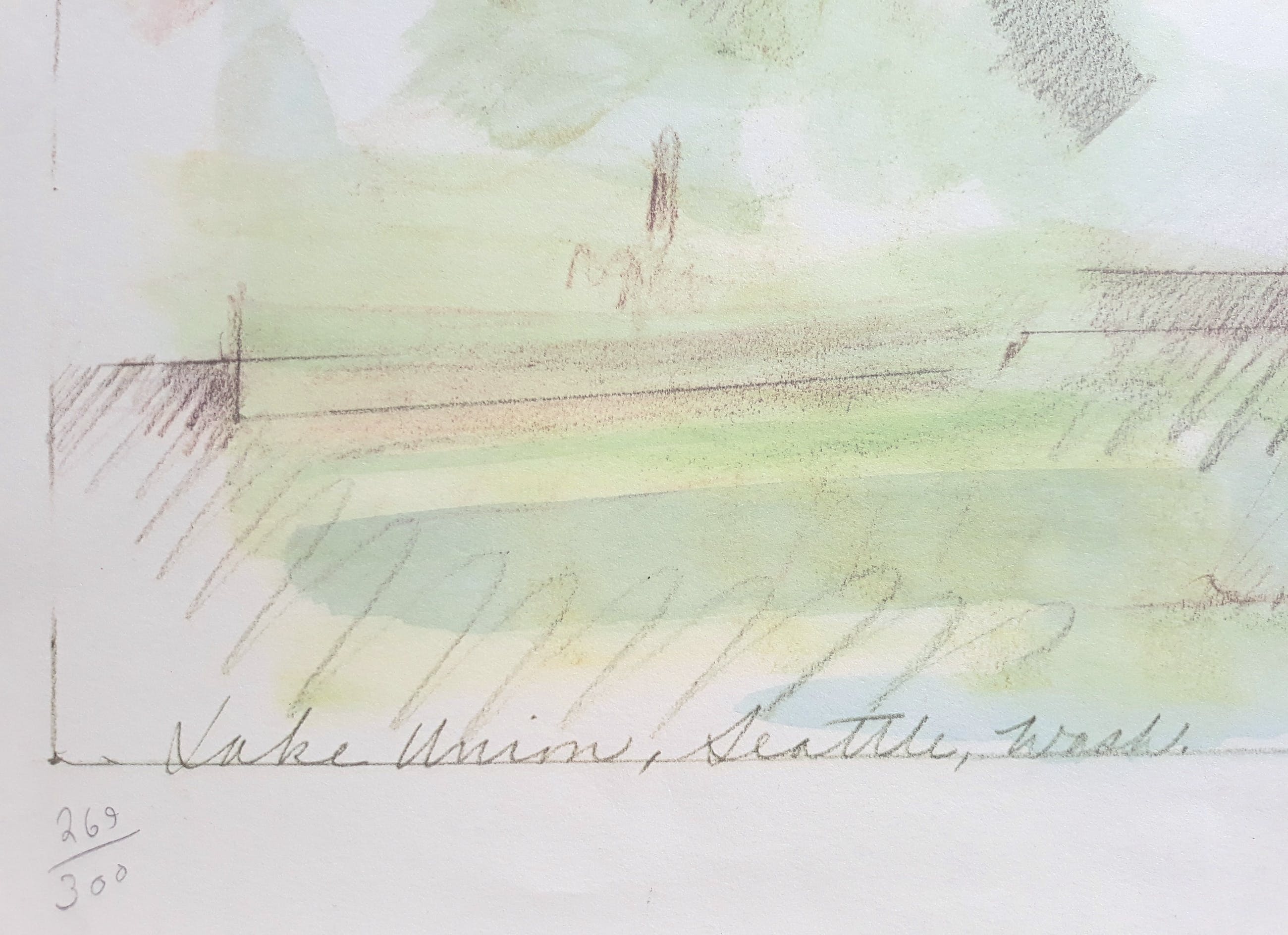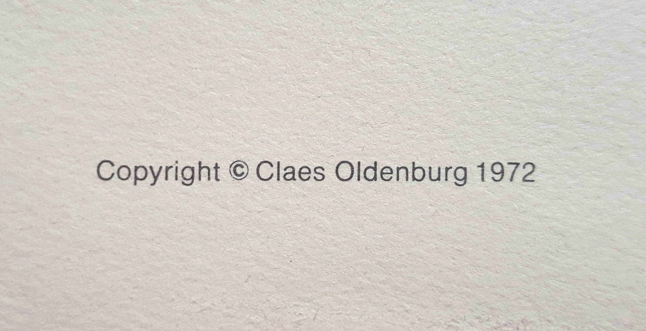 Bekend werk van de Zweeds-Amerikaanse Pop-Art kunstenaar Claes Oldenburg, voluit en vertaald getiteld “Voorstel voor een Kathedraal in de Vorm van een Wastafelkraan, Lake Union, Seattle, Washington”. Litho op geschept papier, met potlood gesigneerd en genummerd (269/300), in de plaat gesitueerd, gemonogrammeerd en gedateerd (1972). In goede conditie; blad heeft ingelijst gezeten want achterop zitten nog wat plakresten boven aan (schijnen niet door) en ook een paar kleine kreukjes in het blad. Ingelijst met passe-partout is het werk zeer goed.