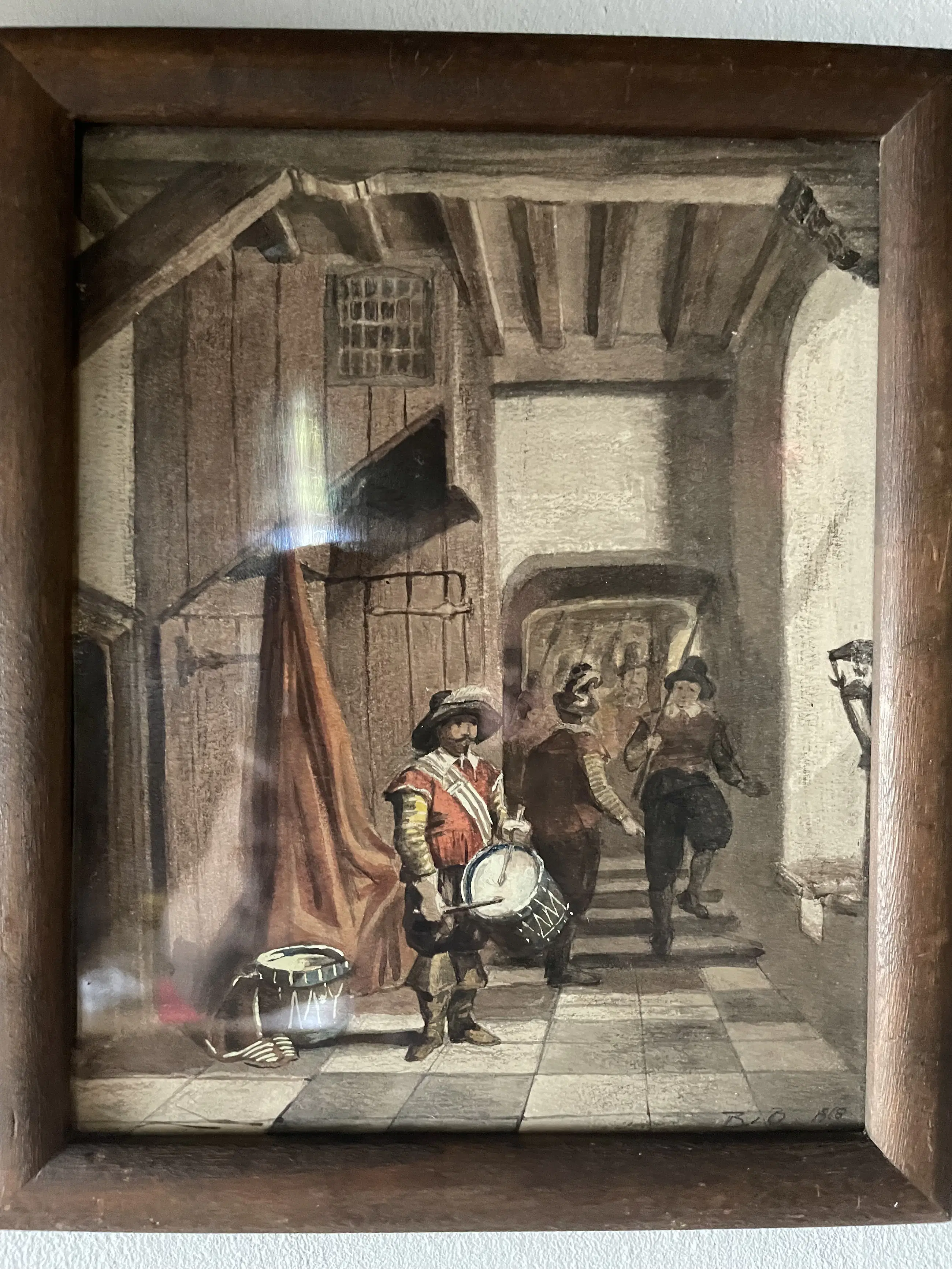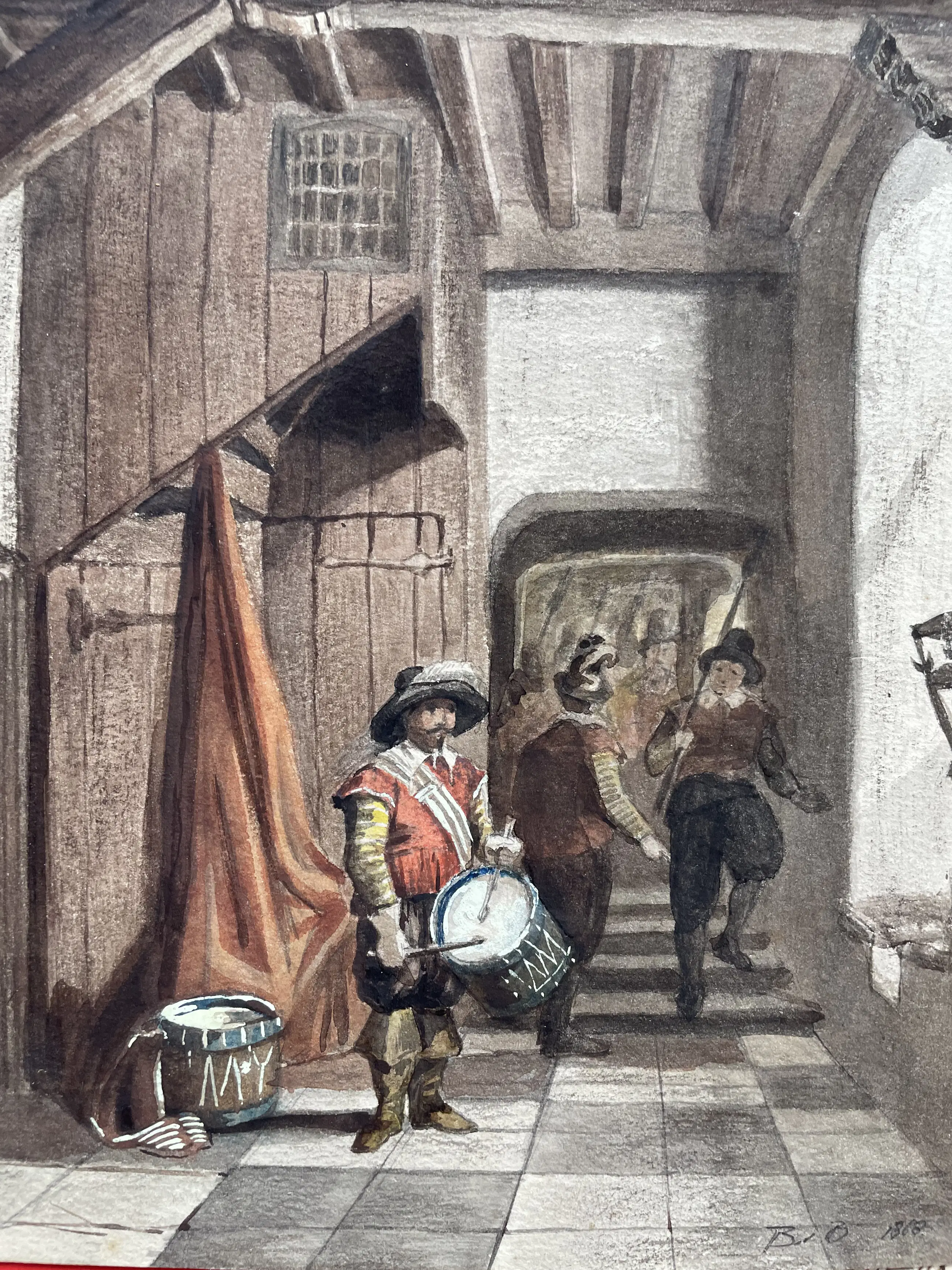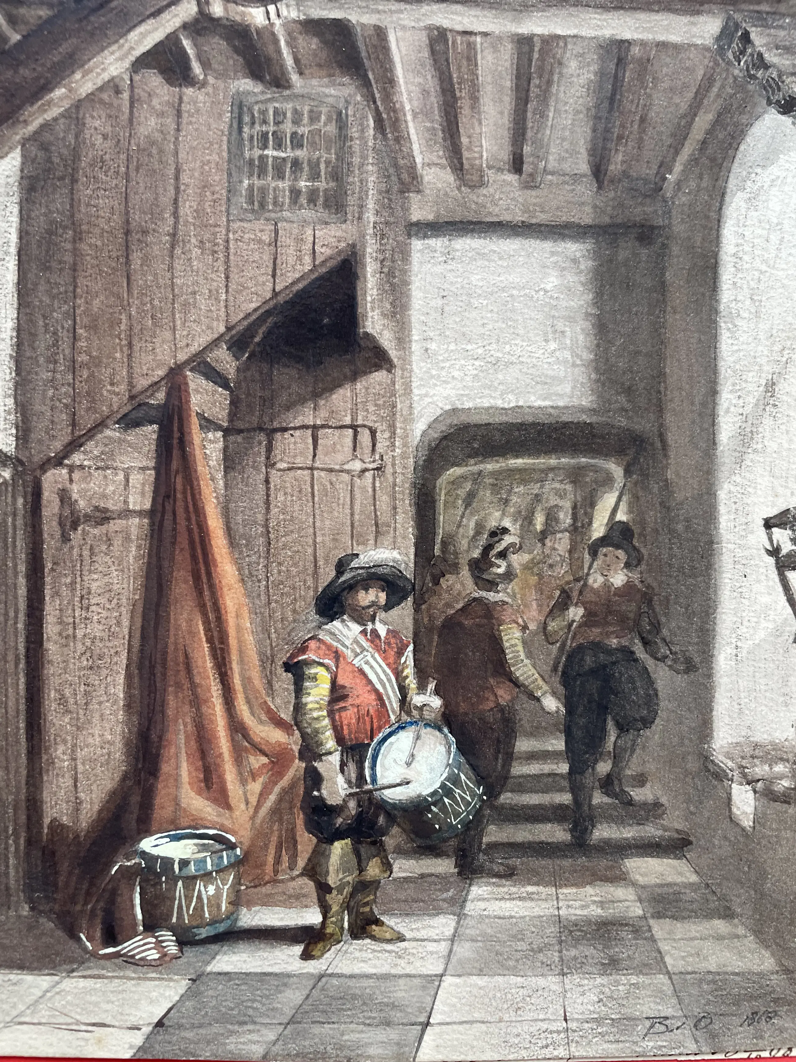 jkvr. Maria Johanna Jacoba Gerardina Beelaerts van Blokland geboren 1848 overleden 1915 Prachtige monogram. Soldaten trekken ten strijde. Aquarel gedateerd 1868. Ze tekende uit liefhebberij vooral bloemen en stilleven. Hand gesigneerd met potlood. Zie foto’s voor eigen indruk. Totaal gewicht 400 gr