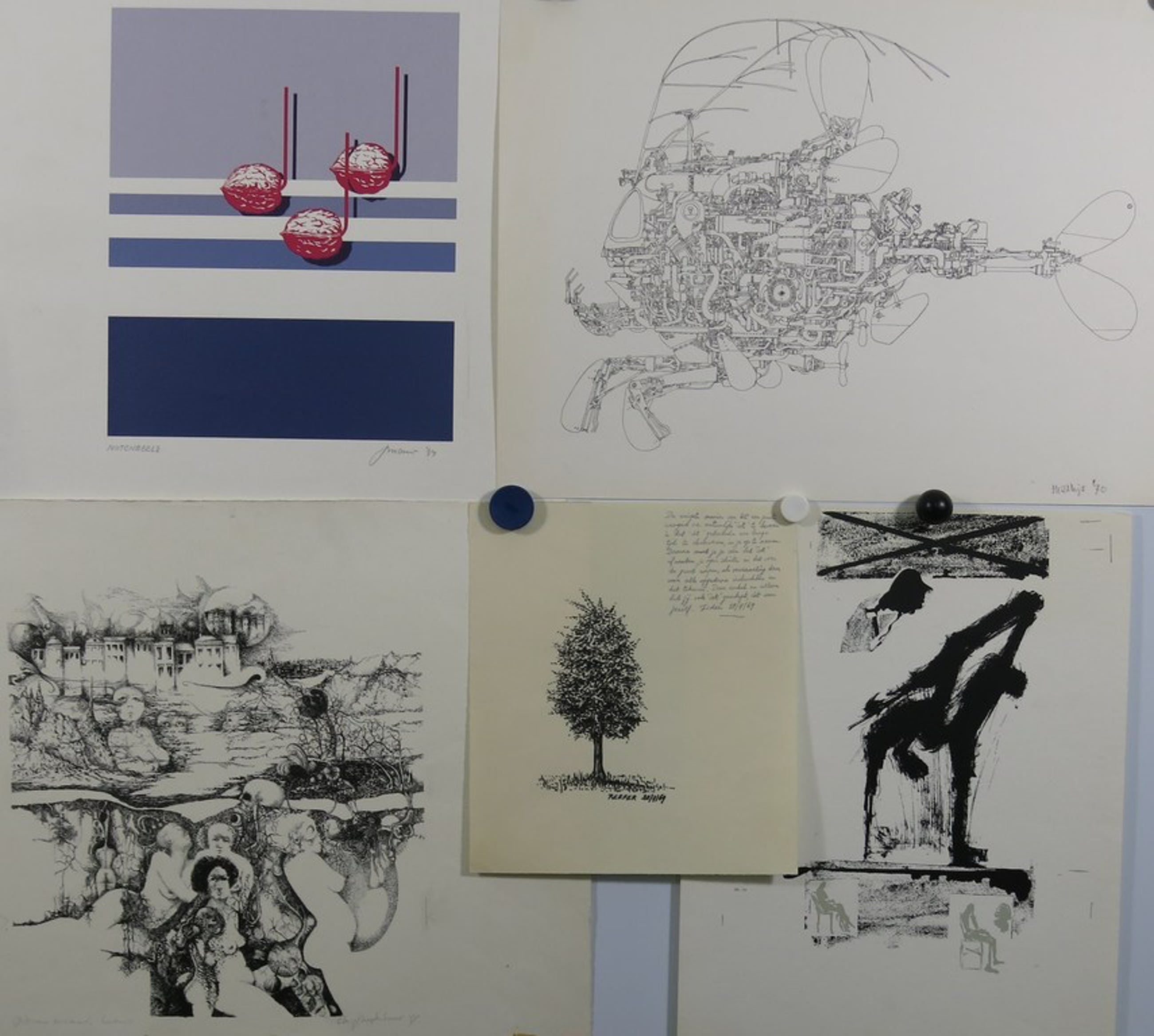 Dit item bestaat uit 1 litho van Clairy Mastenbroek + 4 onbekend gesigneerde werken op papier van de verschillende kunstenaars: "Reefer", "Mathijs", "Boulang(?)" en "JMans(?)". Helaas hebben wij van deze werken de kunstenaar niet kunnen achterhalen.