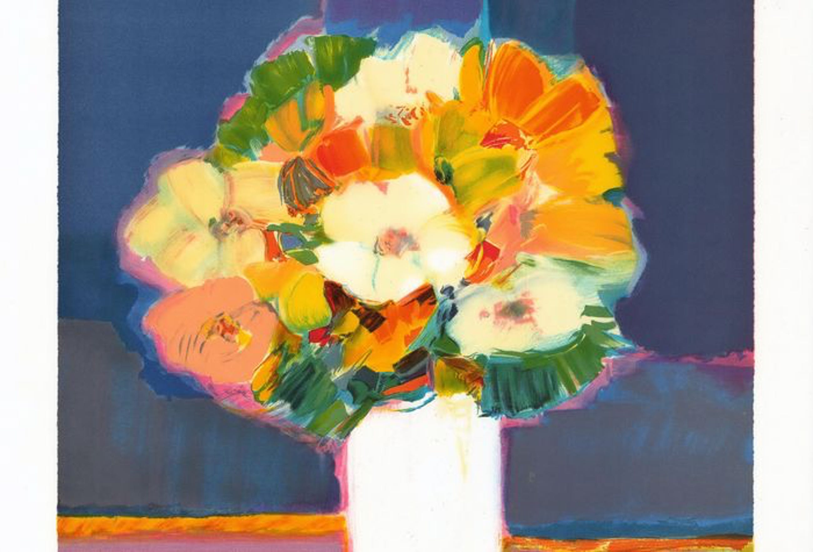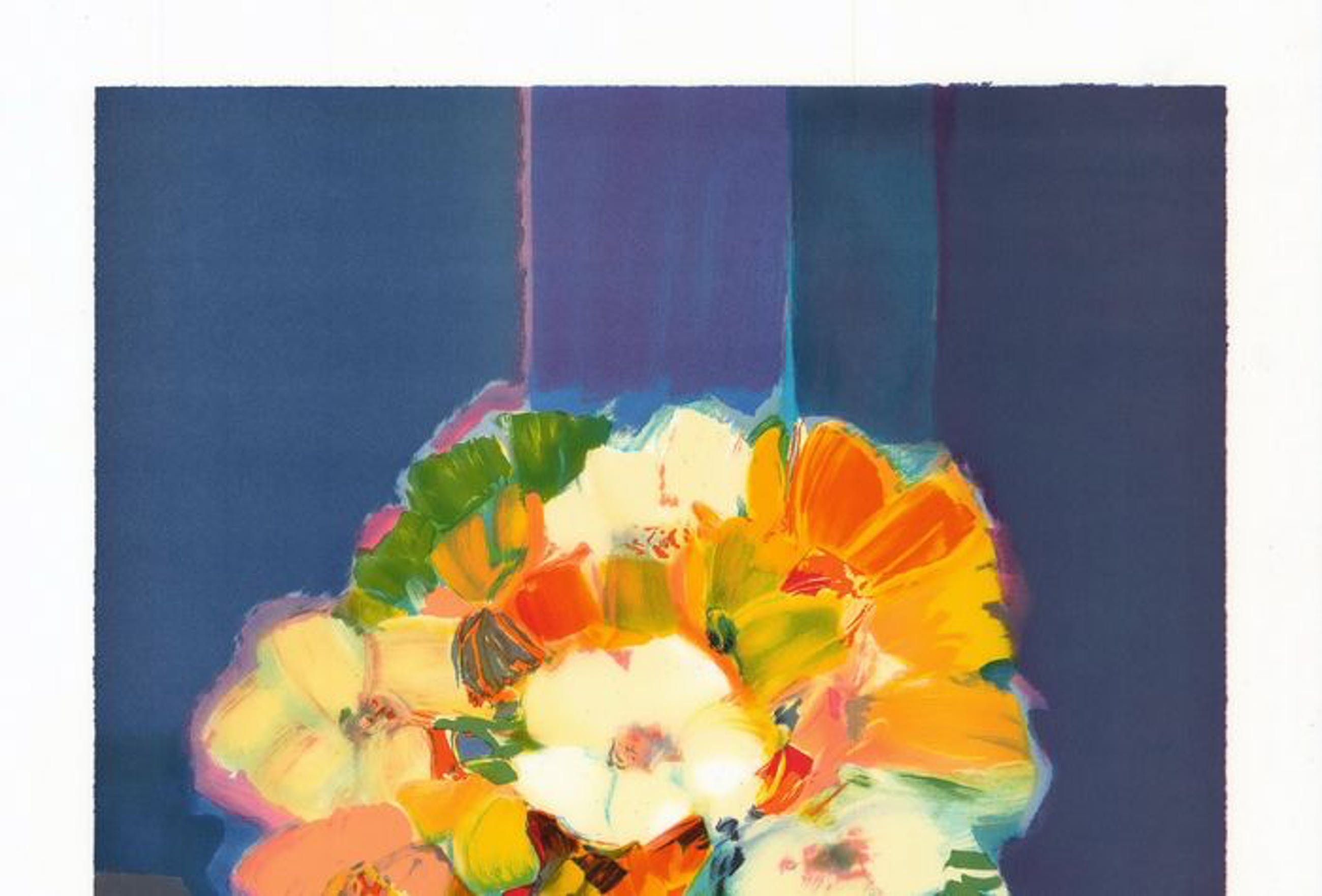 Claude Hemeret (born 1929): ‘Bouquet de fleurs au vase blanc’ Original lithograph on vellum paper, measuring 60 x 45 cm Justified EA (artist’s proof) and signed in pencil by the artist. Work in mint condition, never framed.