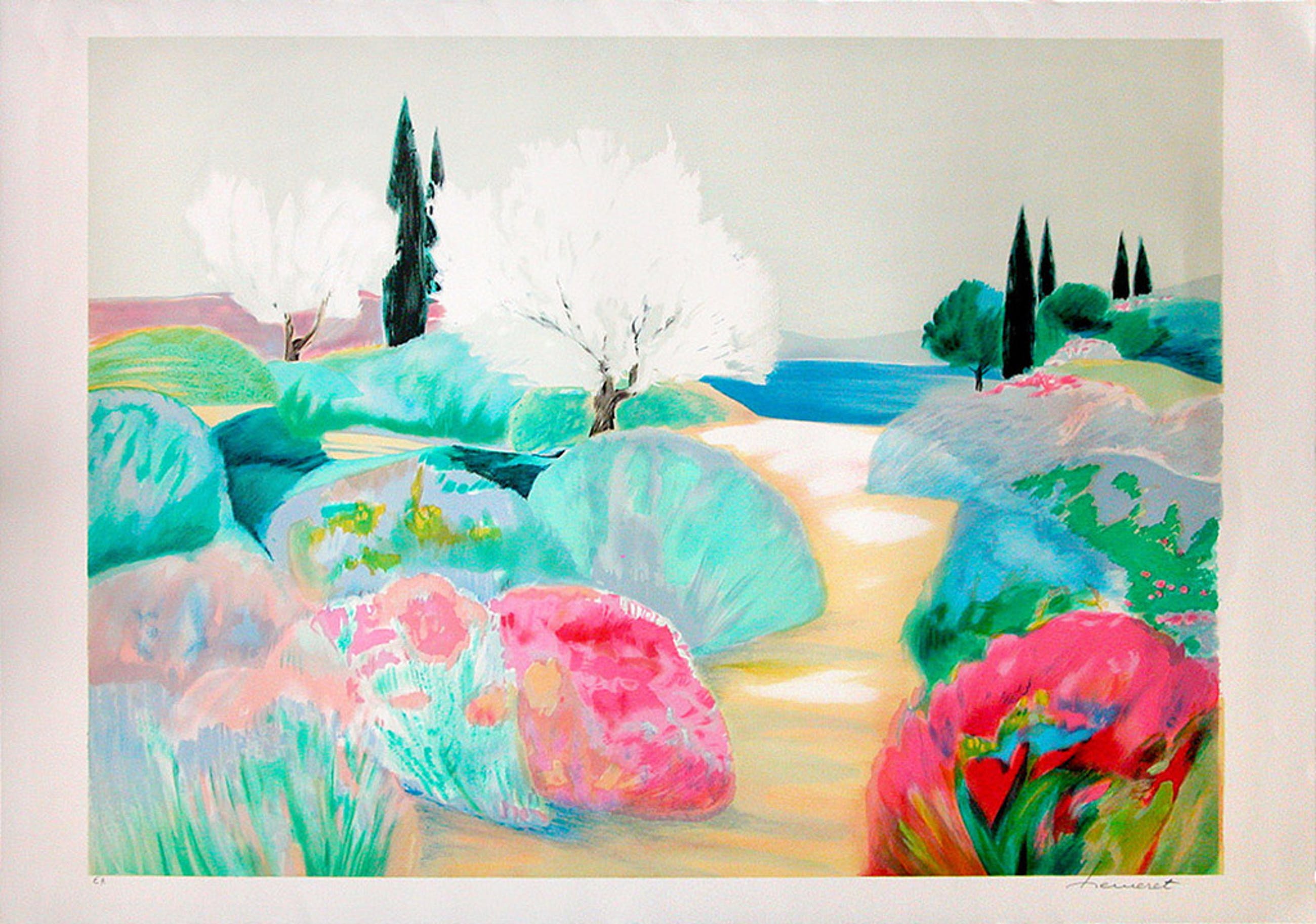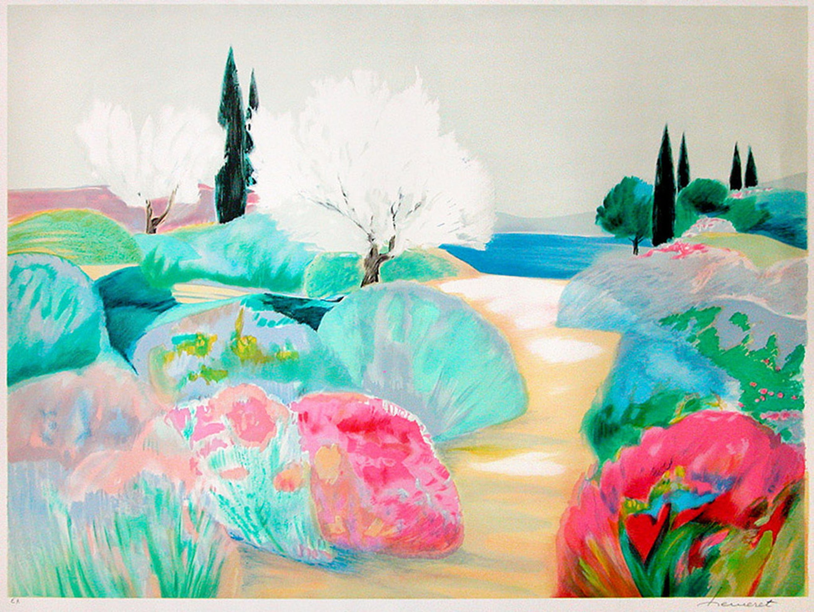 Originele kleurenlitho op groot formaat van de Franse kunstenaar Claude Hemeret, (Nice, 1929), handgesigneerd.