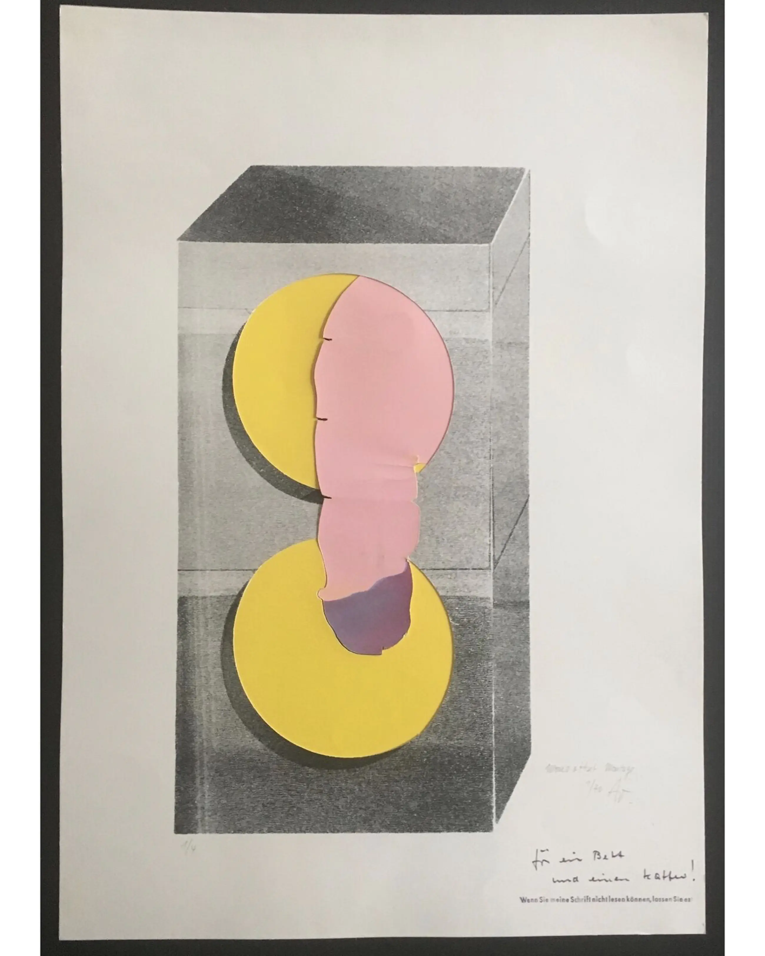 Voor een blad en een koffie! Mono-offset montage Bestaande uit drie achter elkaar gemonteerde bladen Montage met bewegende papieren penis, een echt bizar object - het goede stuk heeft een minimaal scheurtje, verder in zeer goede staat Een van de slechts 4 genummerde exemplaren (nr. 1/4) met de stempel Als je mijn schrijven niet kunt lezen, doe het dan niet!